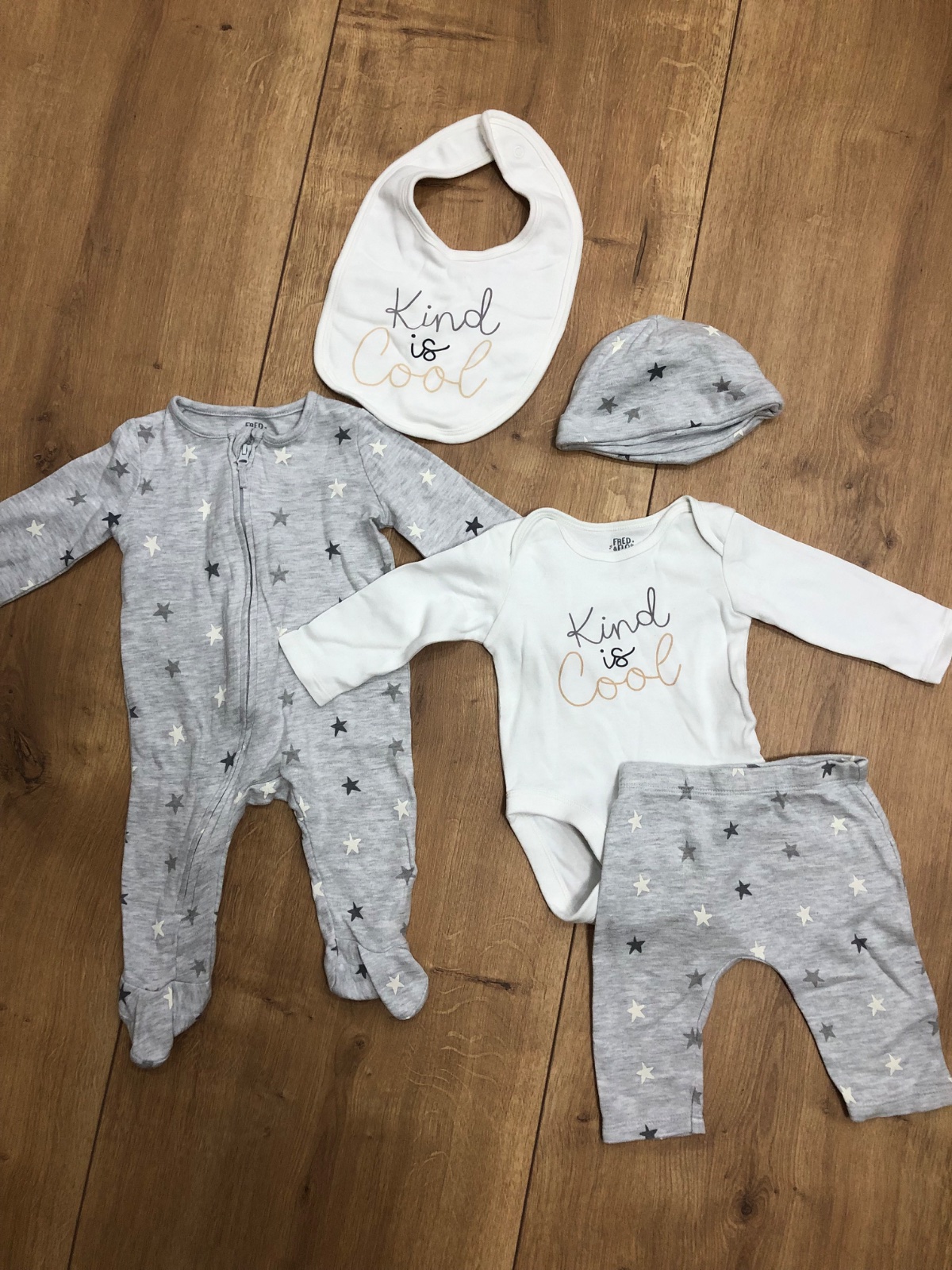 Pyžamko, podbradník a čiapka len oprané, body a legíny 1x oblečené