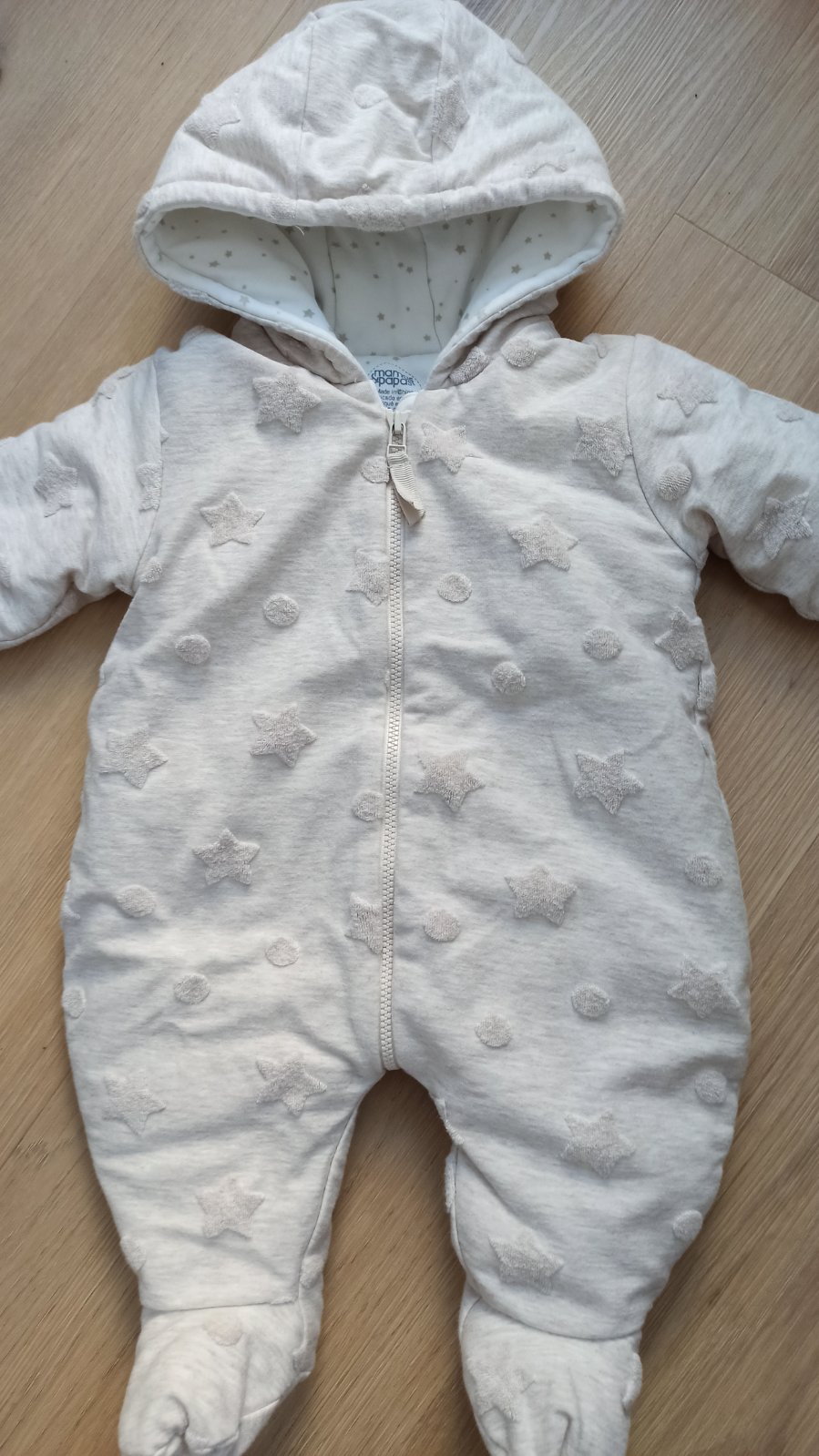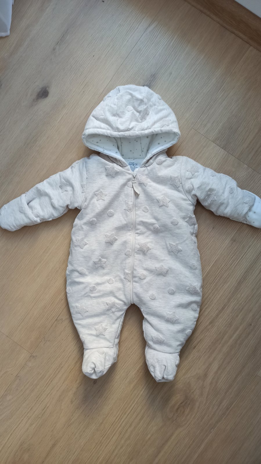 Teplákový hrubší overal, vhodný na prechodné obdobie a teplejšiu zimu, veľkosť 0-3 mesiace, vo veľmi dobrom stave.