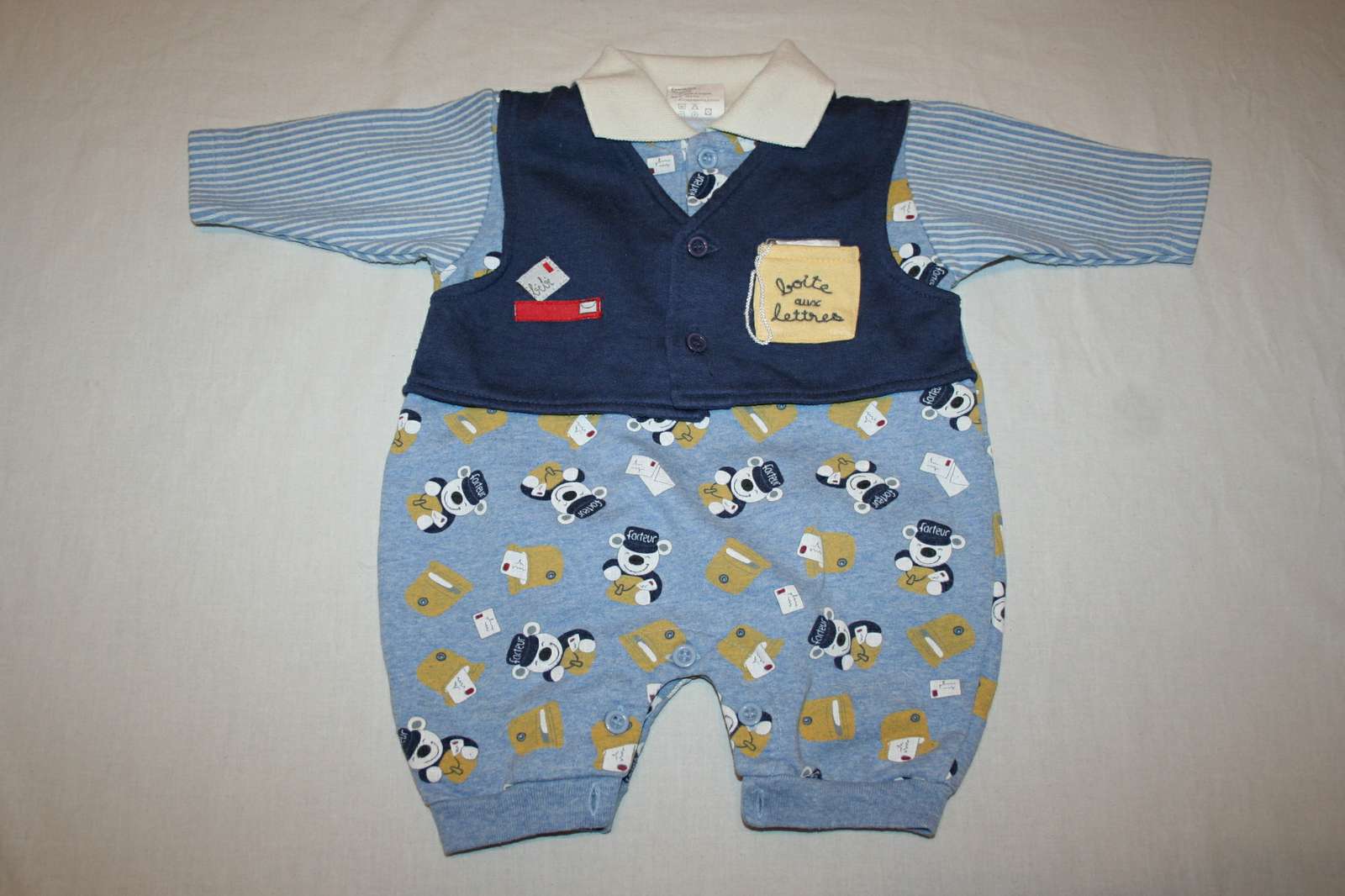 Veľmi pekný overal pre chlapčeka, nosene ale vo veľmi dobrom stave bez poškodenia, hrubšia teplakovina veľkosť písaná na 3 mesiace.