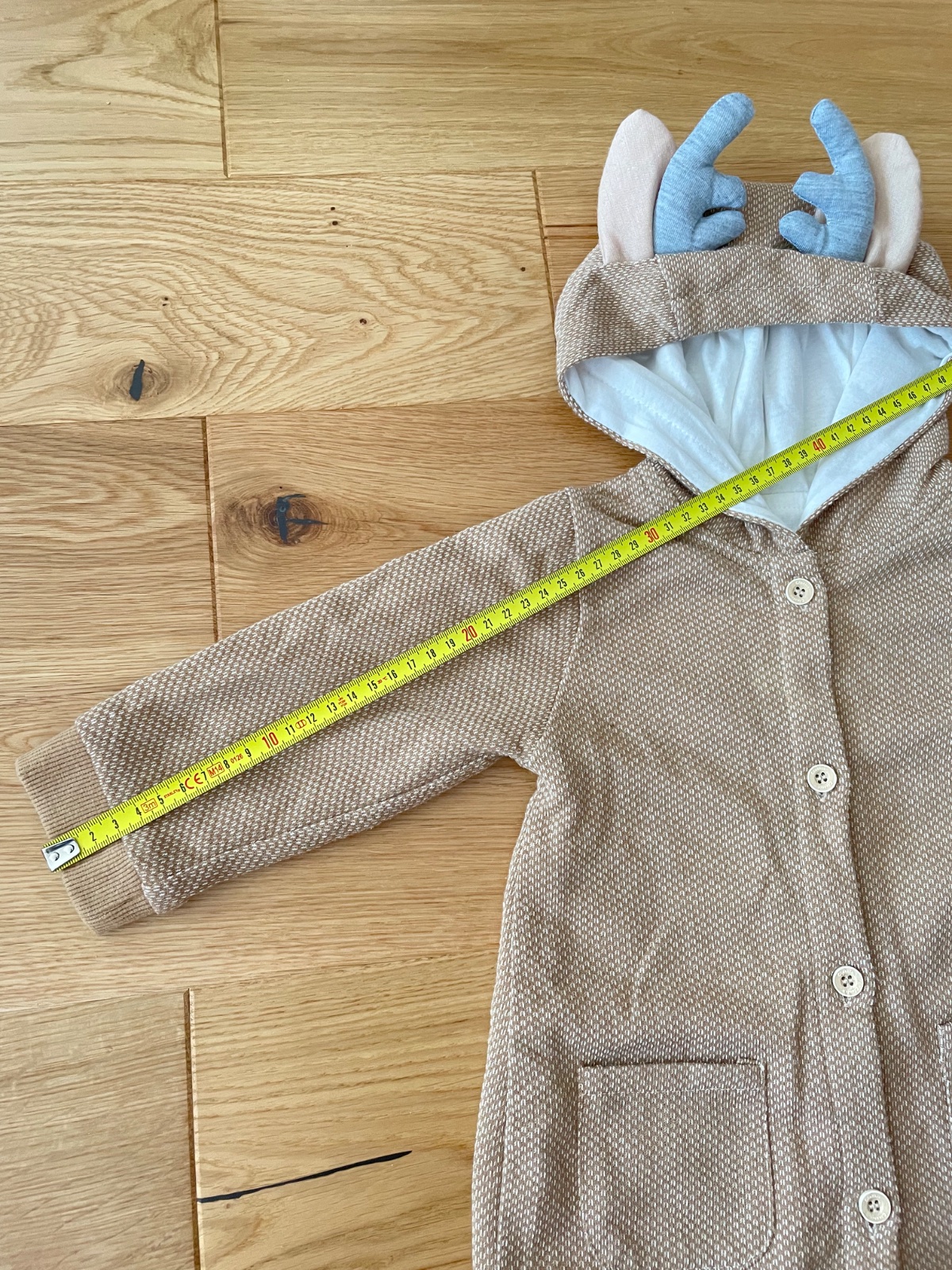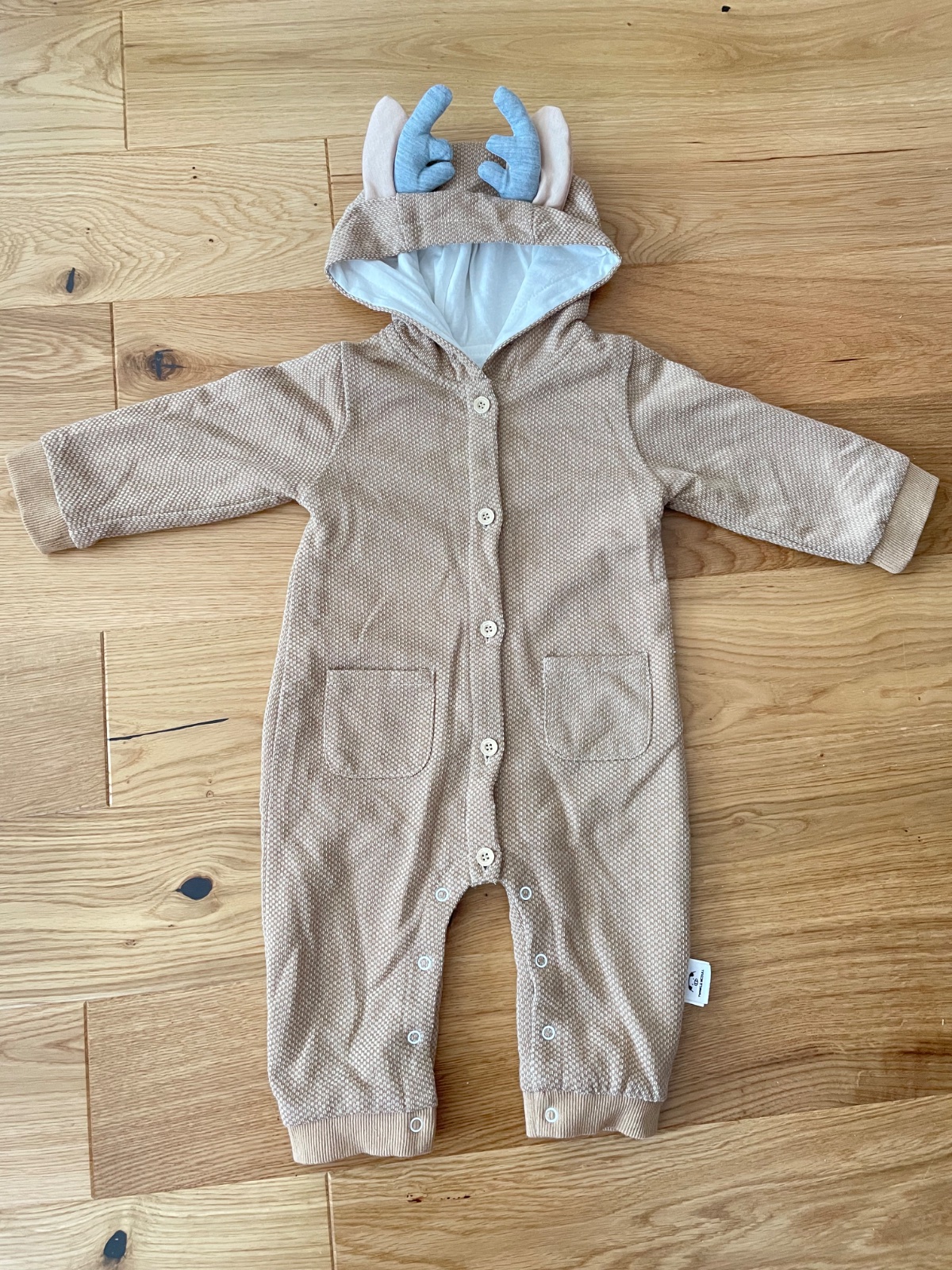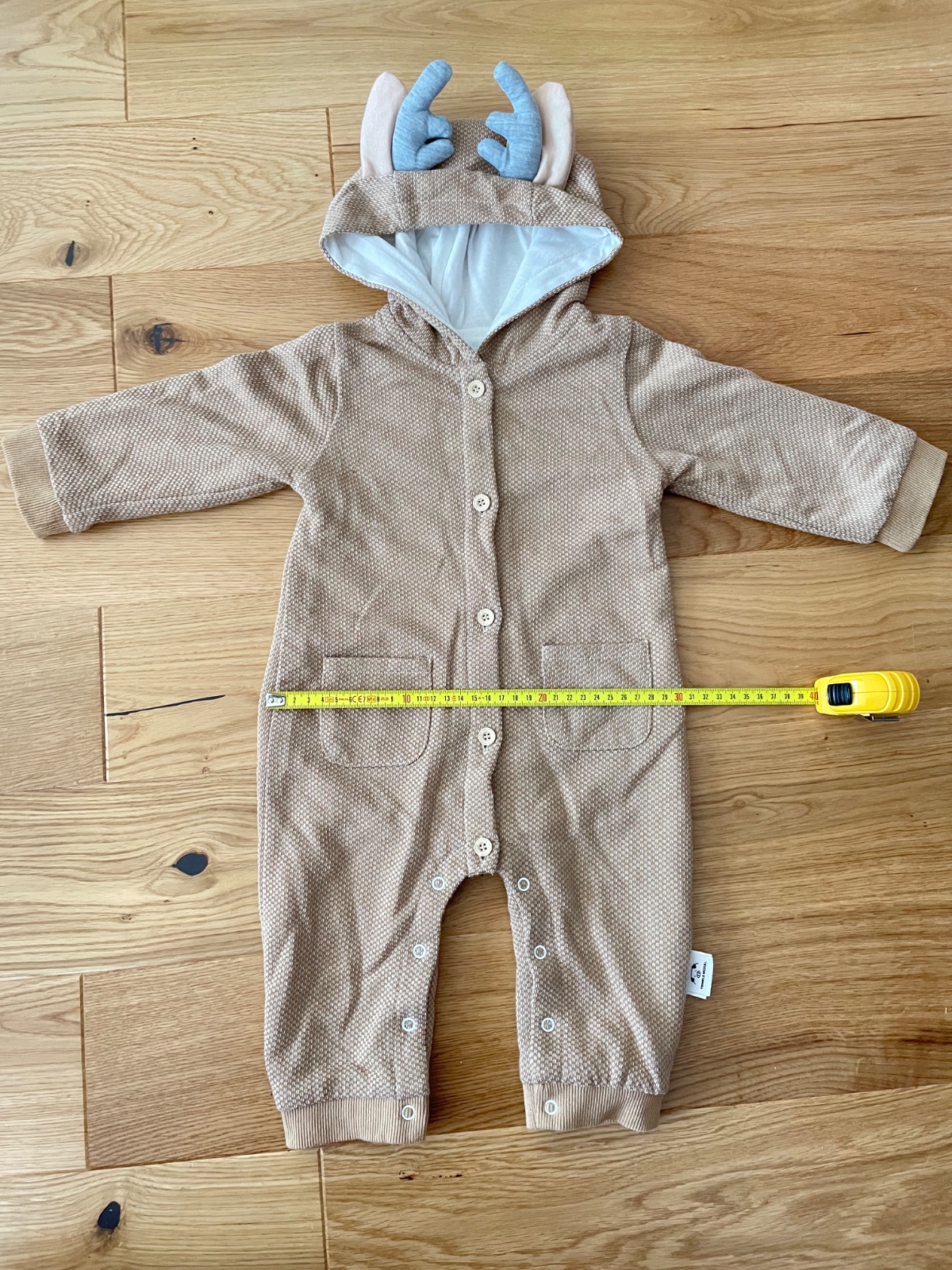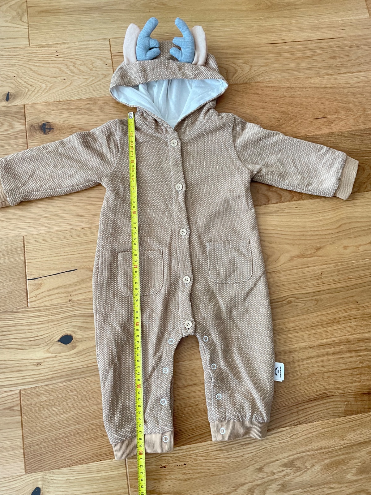 Krásny vianočný overal sobík. Má 2 vrstvy látky. Vonkajšia bledo hnedá a vnútorná podšívka biela. Rozmery na foto. Oblečený minimálne, stále v super stave.