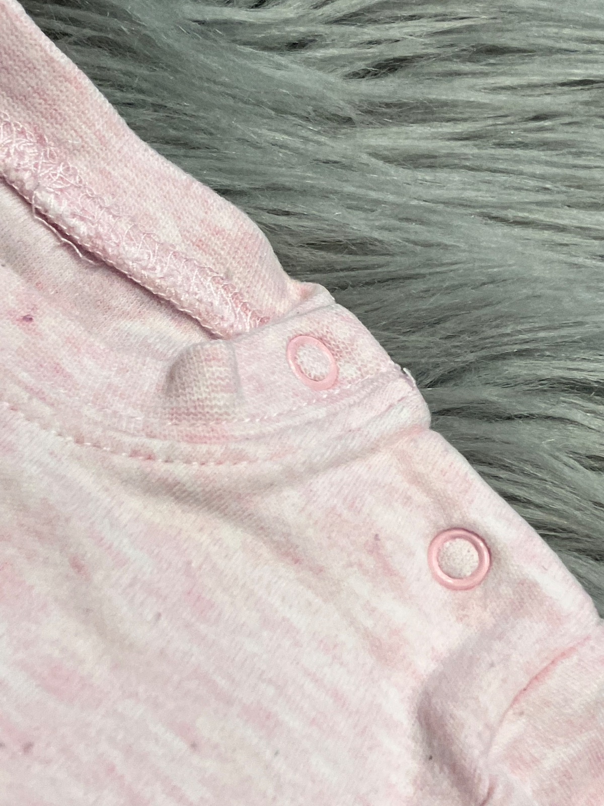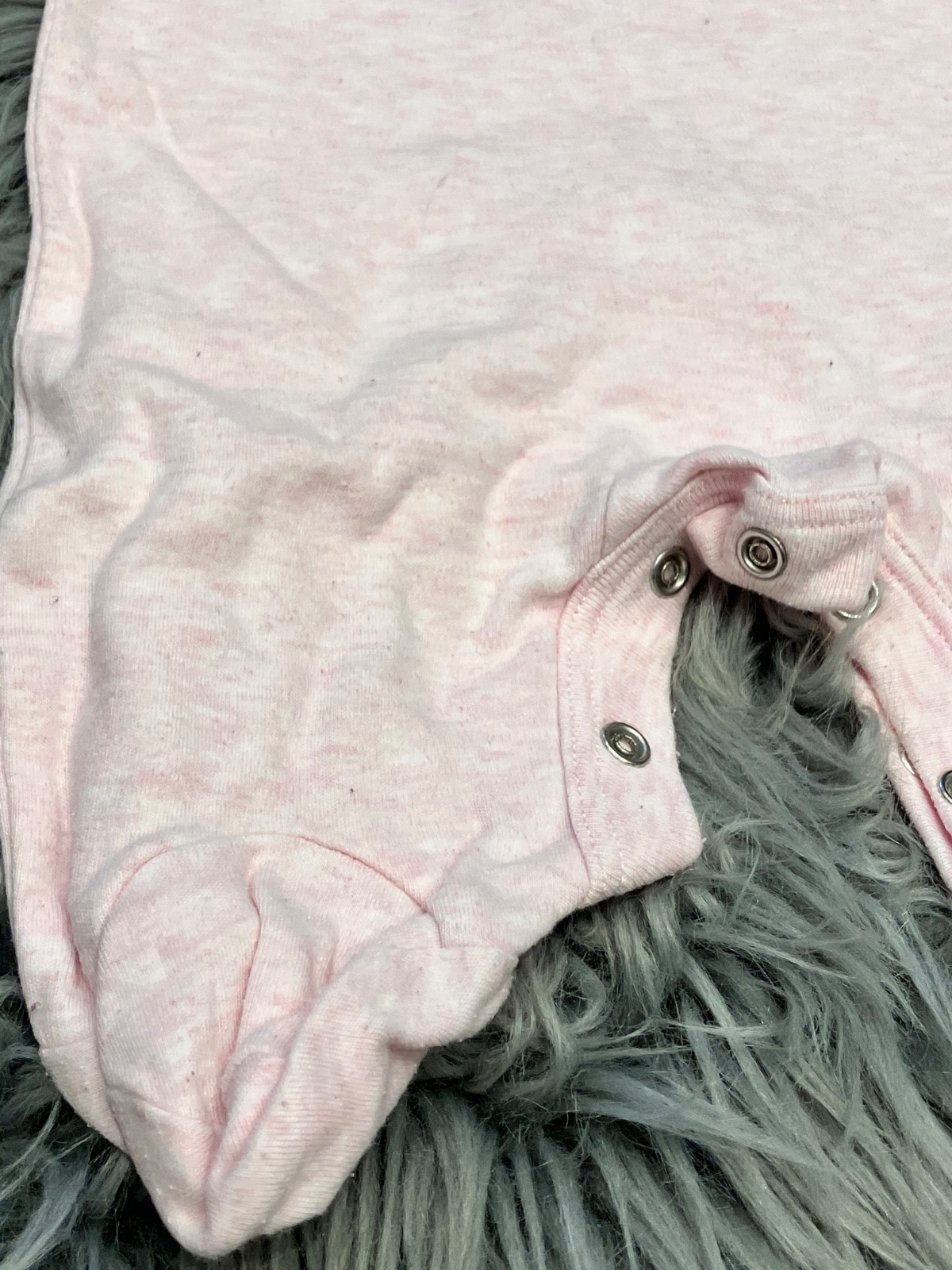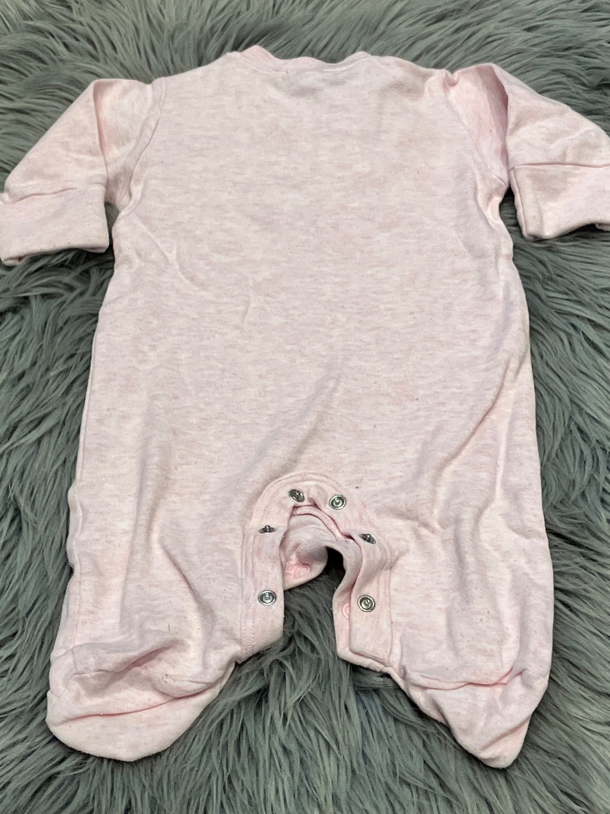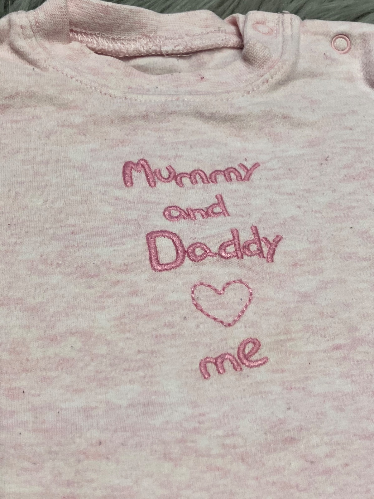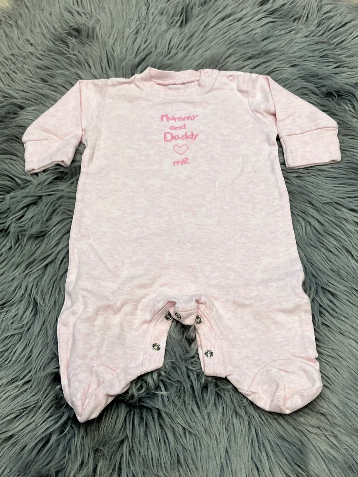 Dievčenský overal s dlhým rukávom a vyšívanými nápismi, melírovaný, tenký, elastický, zapínanie na cvoky, materiál 100%bavlna, veľkosť cca 68.