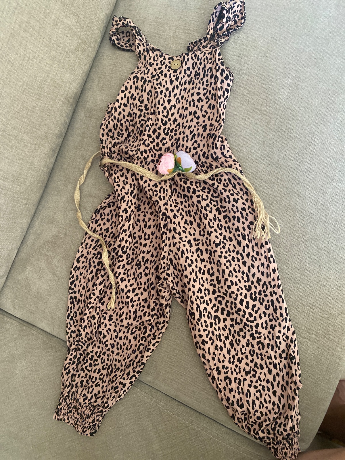 Leopardí overal priedušneho materiálu na 4-5 rokov vhodný to teplého počasia doplnení kvietkovanym opaskom, bez poškodení