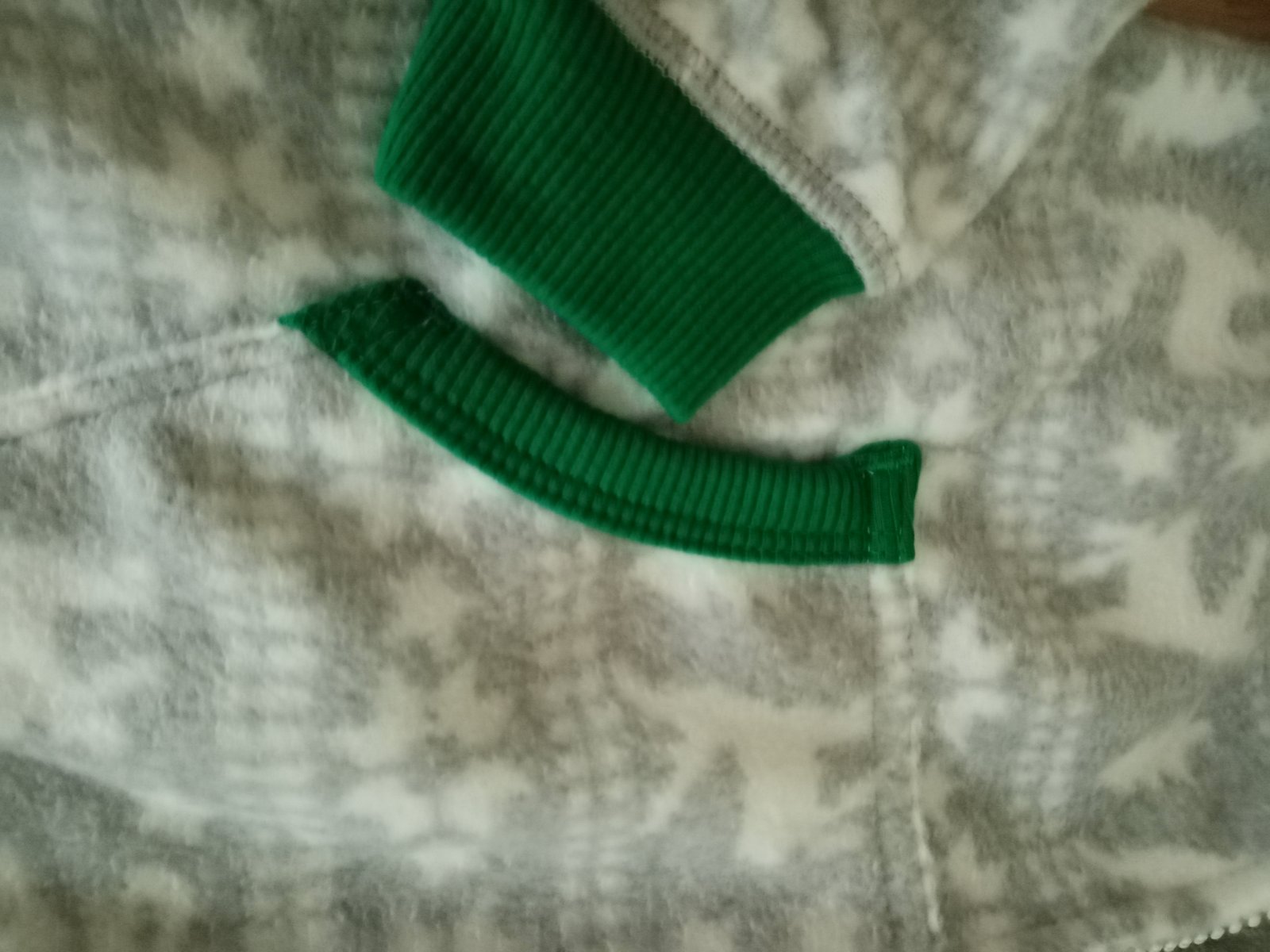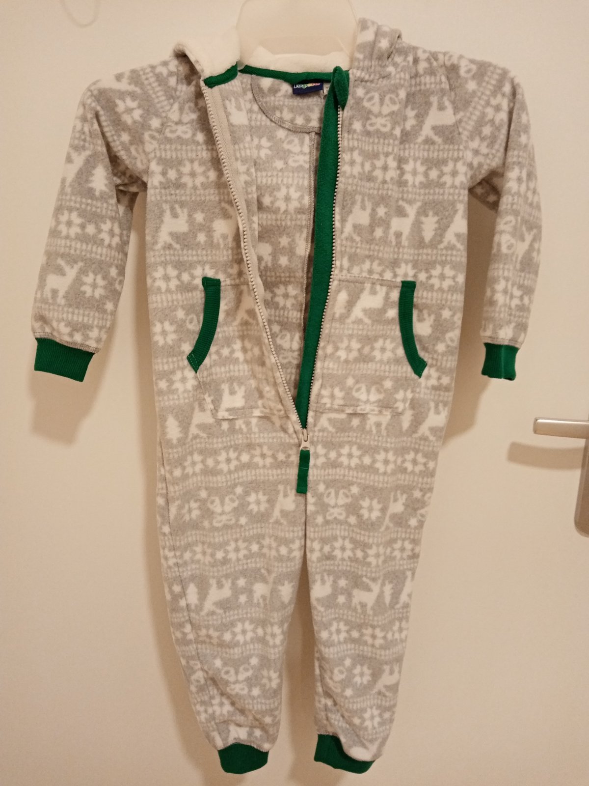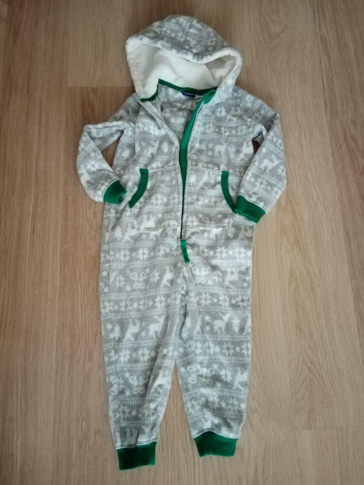 Detský mikroflisovy overal so zapínaním na zips. Univerzálna farba vhodná aj pre dievča aj pre chlapca. Pánty sú v sytej zelenej farbe, rovnako ako zips a vrecka. Kapucňa z vnútra podsita mäkkou bielou látkou. Veľkosť 98/104 (2-4roky). Využiteľný ako domáci ubor, pyžamko, či príjemny hrejivy základ pod zimný overal. Úžasne rozkošné a navyše spoľahlivo hreje. Nové, nenosené.