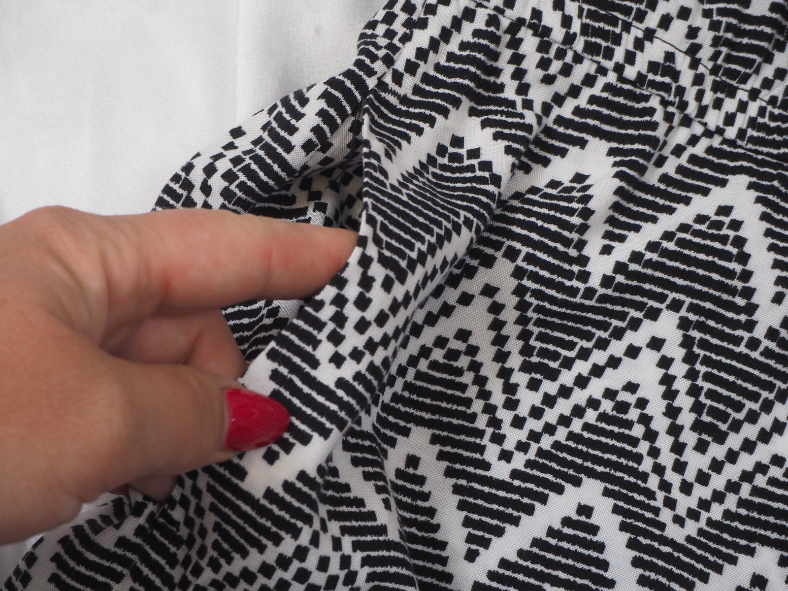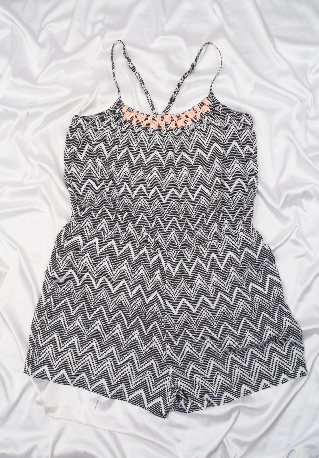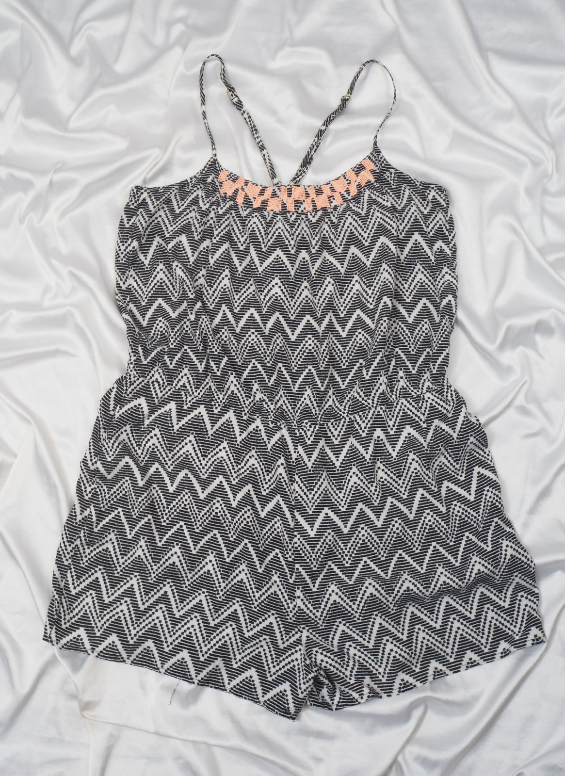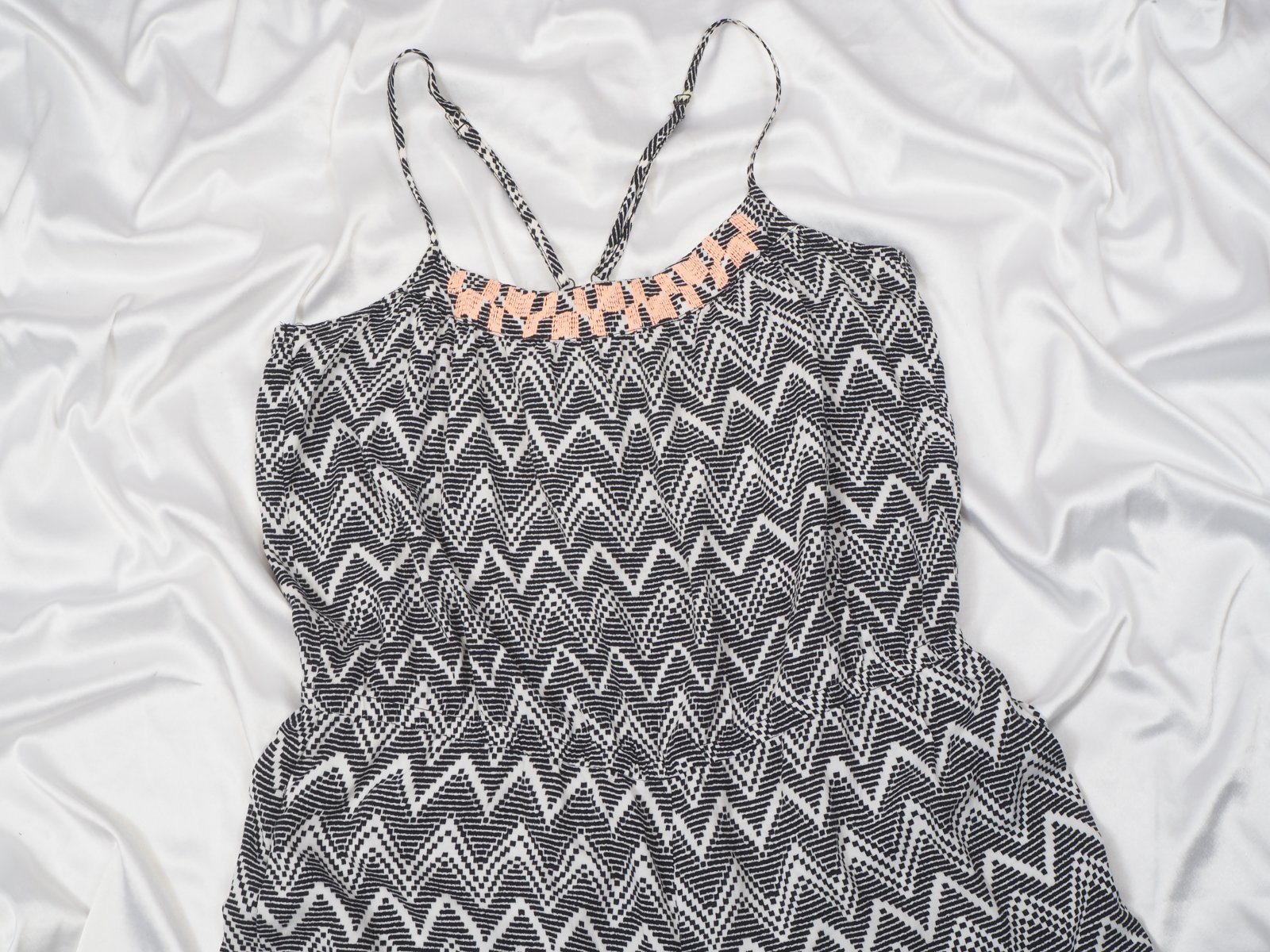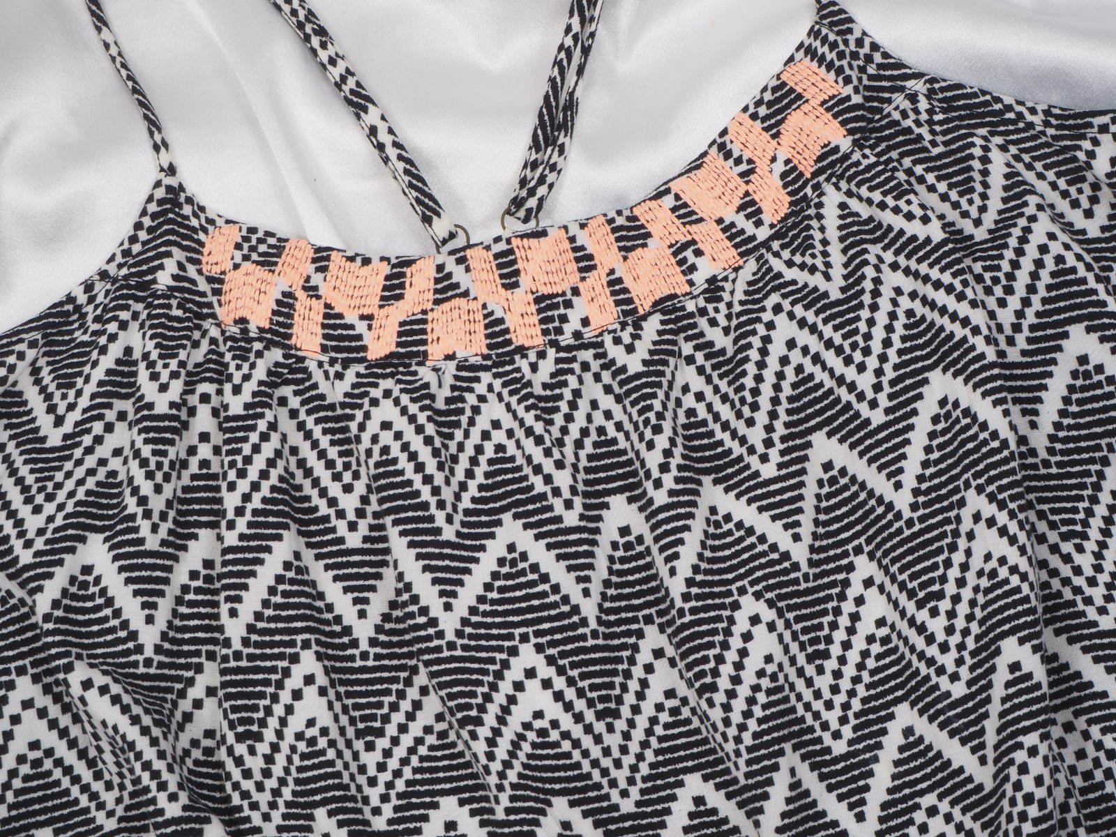 Kvalitný letný vzorovaný overal, v páse gumka, všité vrecká, výstrih zdobený výšivkou, materiál 100% viskóza, super stav.