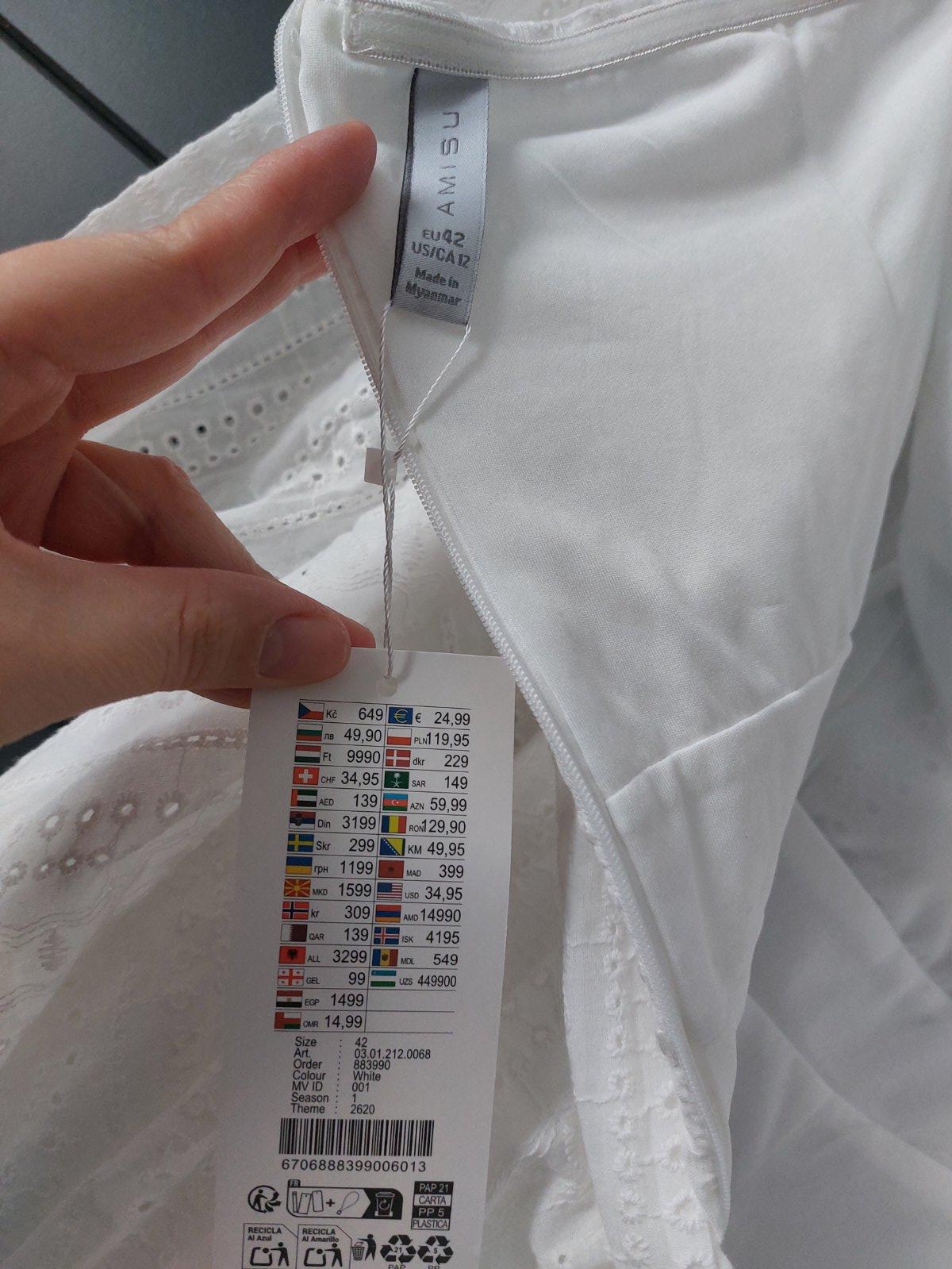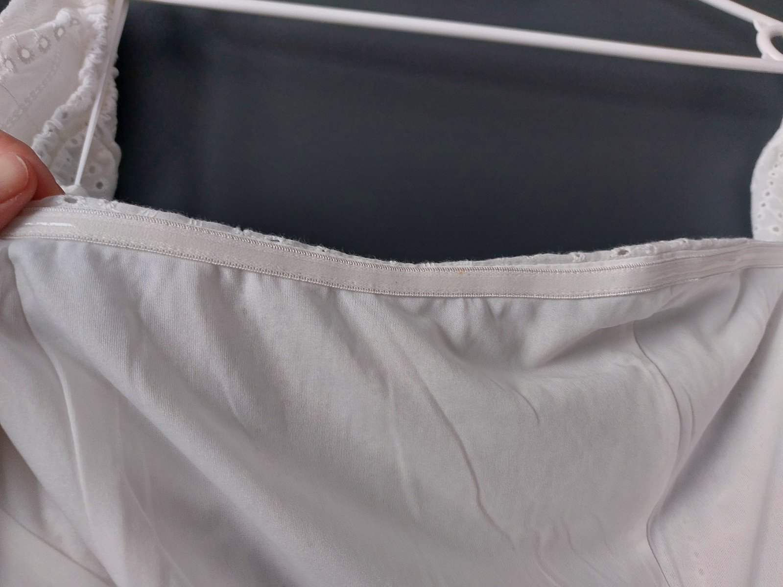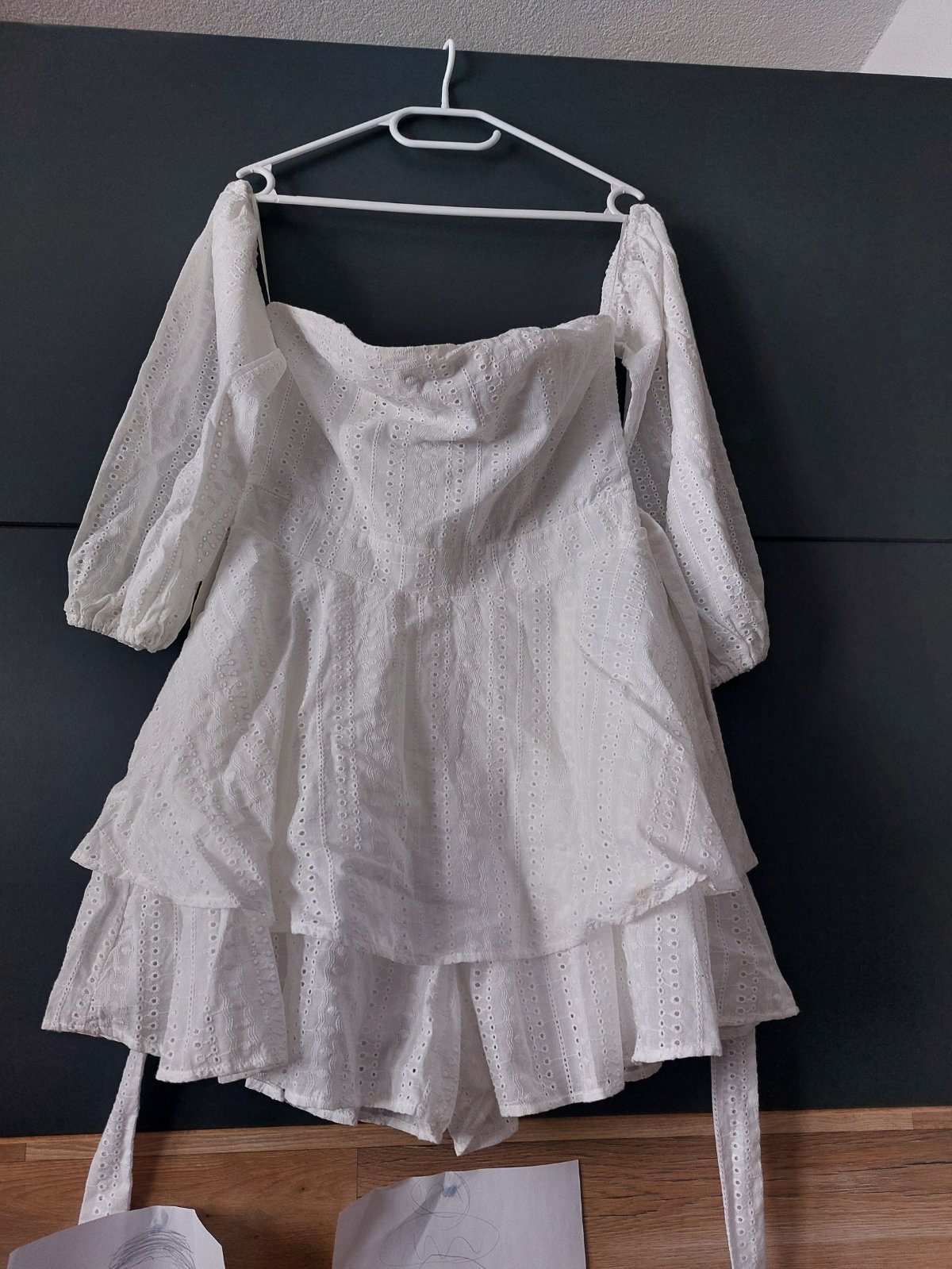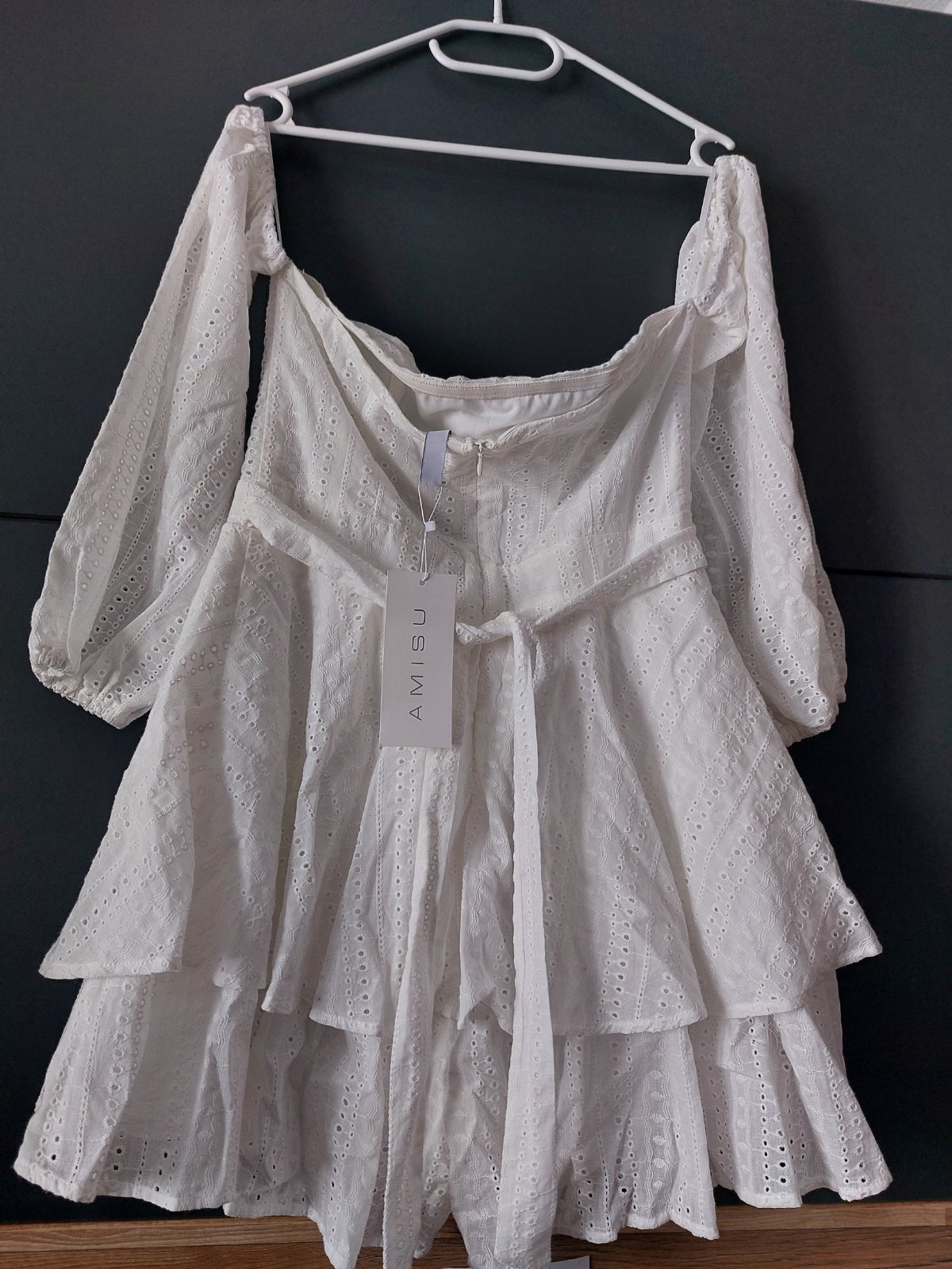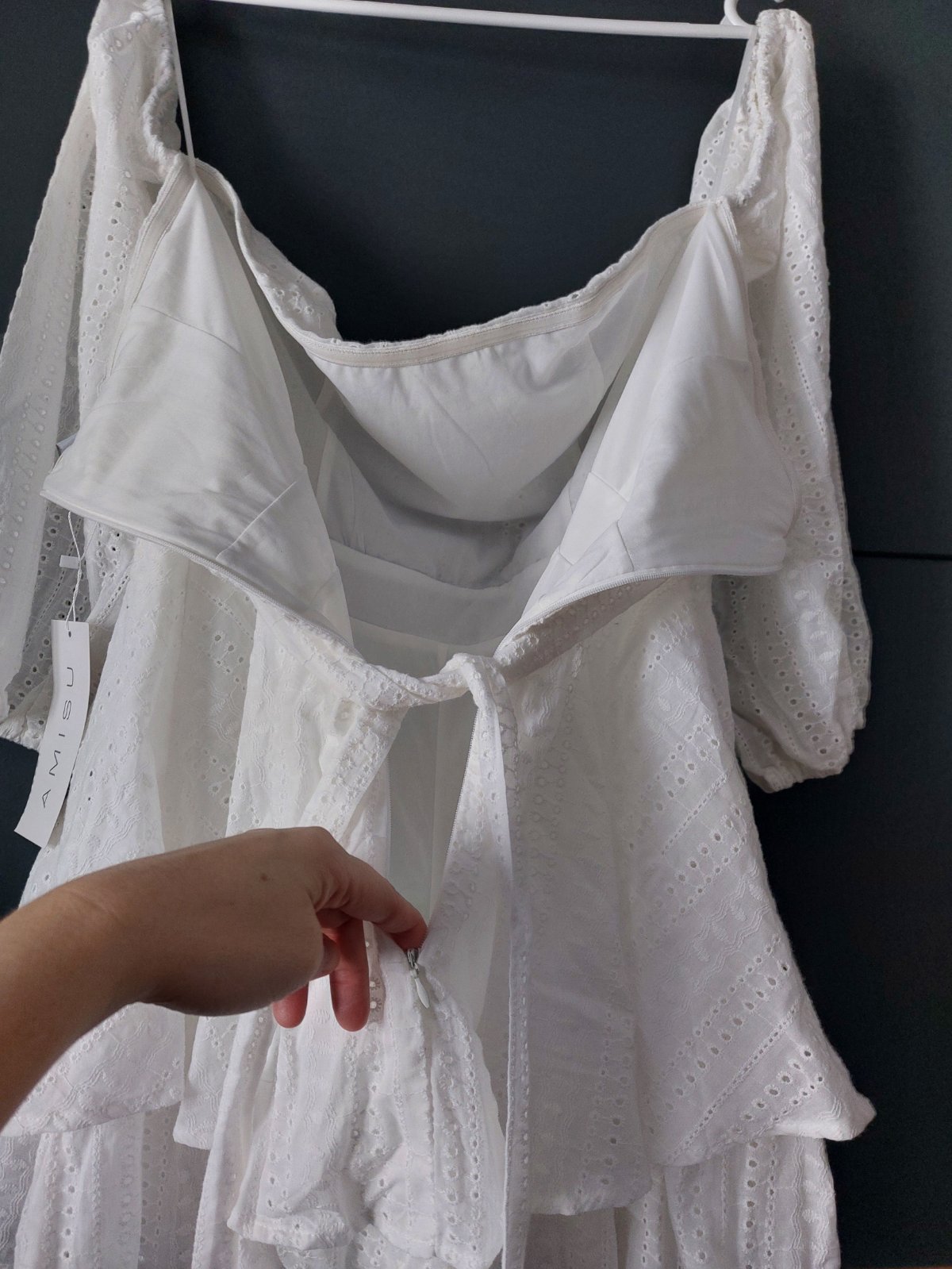 Rukavy balonove, cele ramena sú hole, vzadu zapínanie na zips, ktorý sa otvara az relativne nízko pre komfortné oblečenie.