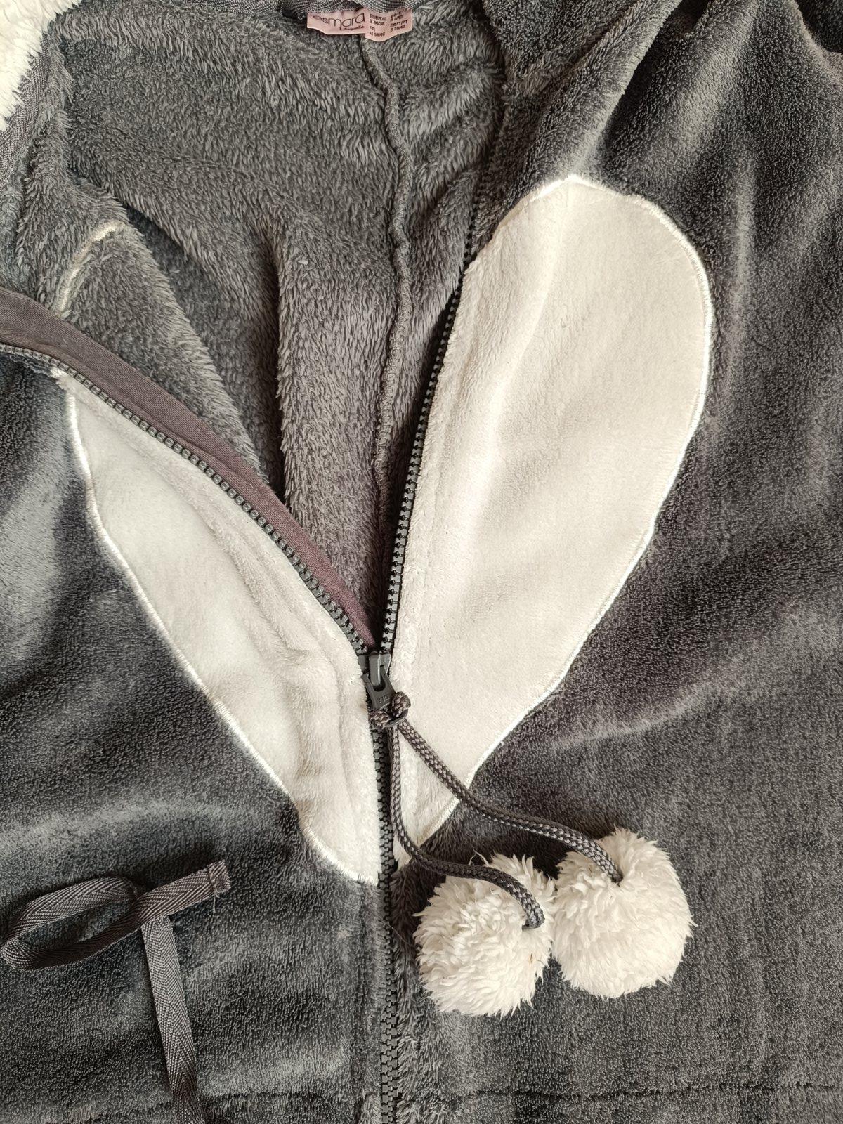 Overal je vyrobeny z flisu v sivej farbe so zapinanim na zips, ma funkcne vrecka a kapucnu.