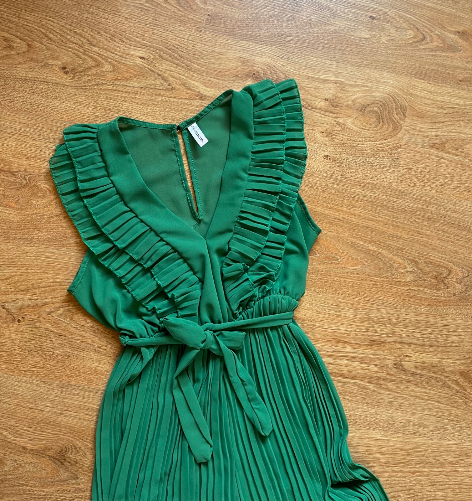 Krásny maxi overal, oblečený 2x pri príležitosti. V pase je elastická guma + šnúrka. Veľkosť bola uvedená ako UNI prispôsobí sa, ja som mala pri XS/S a bol super. Farba presne ako na poslednej fotke, materiál príjemný.