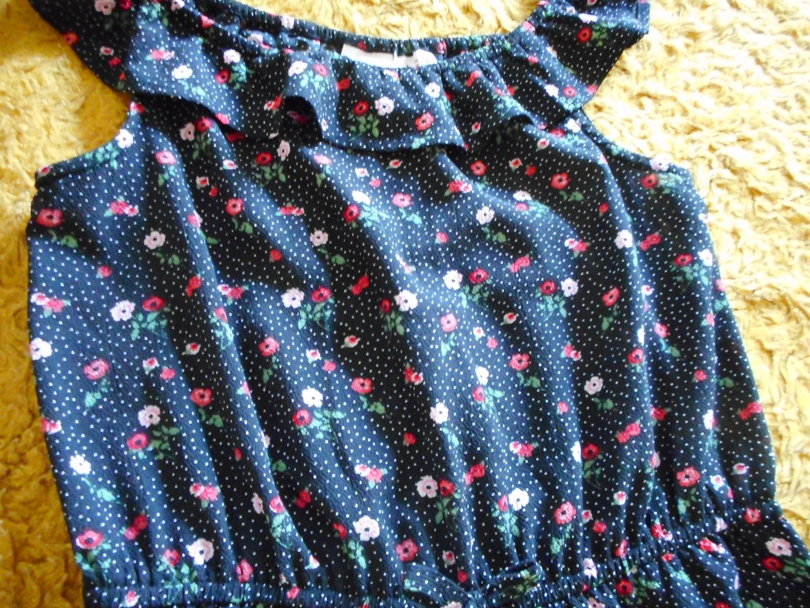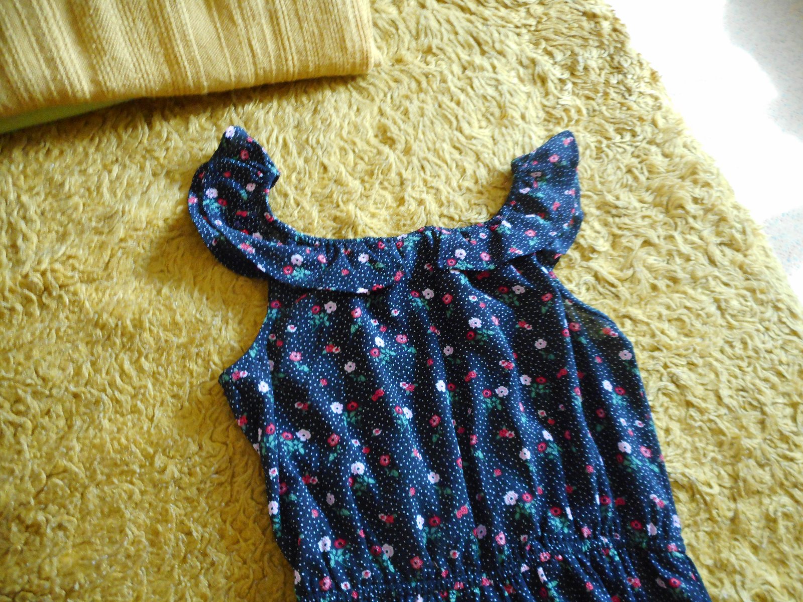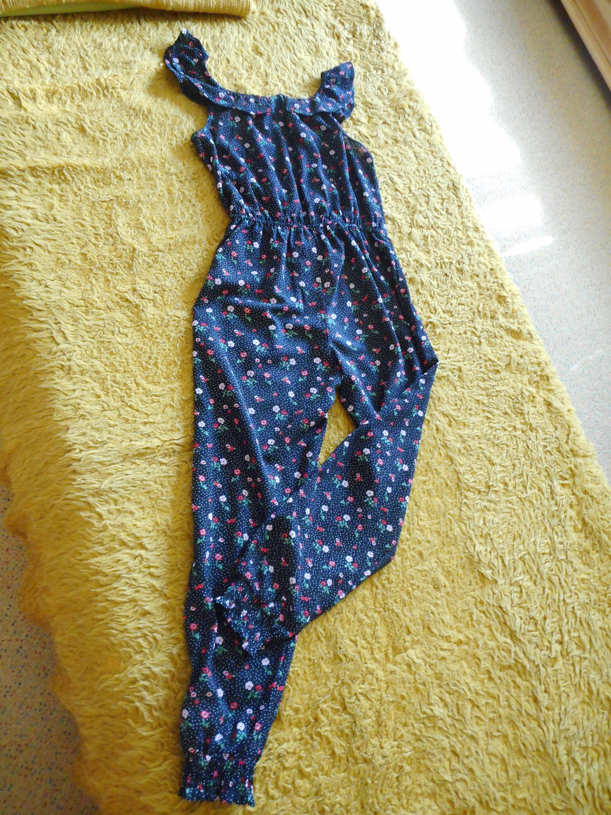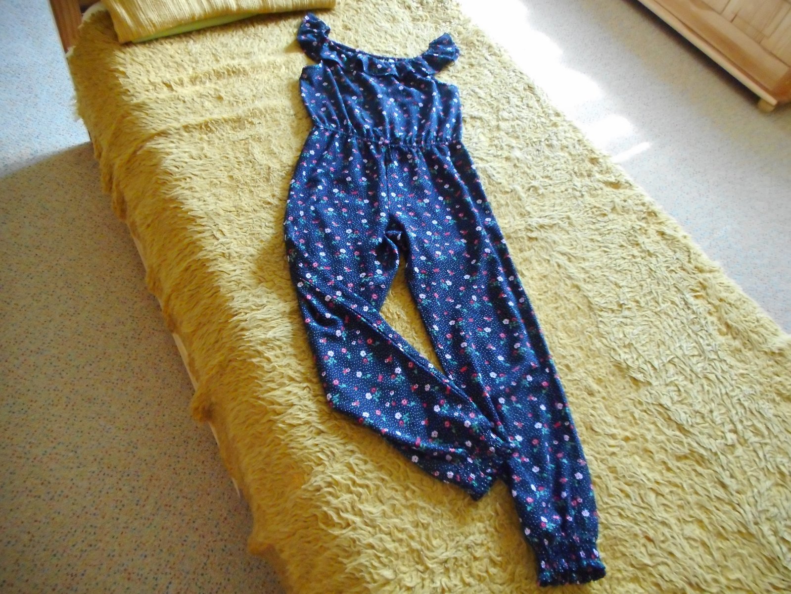 predám veľmi pekný v top stave dievčenský tenučký letný overal zn. Manguun veľkosť 140cm, 9-10 rokov čiernej farby s malilinkými bielymi bodkami s potlačou červených a ružových kvietkov, ramená sú olemované volánikom pre zvýraznenie, ukončenie overalu na nohách gumičkovým patentom, pás gumičkový, celková dĺžka overalu je 111cm, pás v kľude 30cm, ešte je možnosť dosť veľkého natiahnutia, šírka pod pazuchami je 41cm, materiál je čiastočne pružný, prispôsobí sa telu
