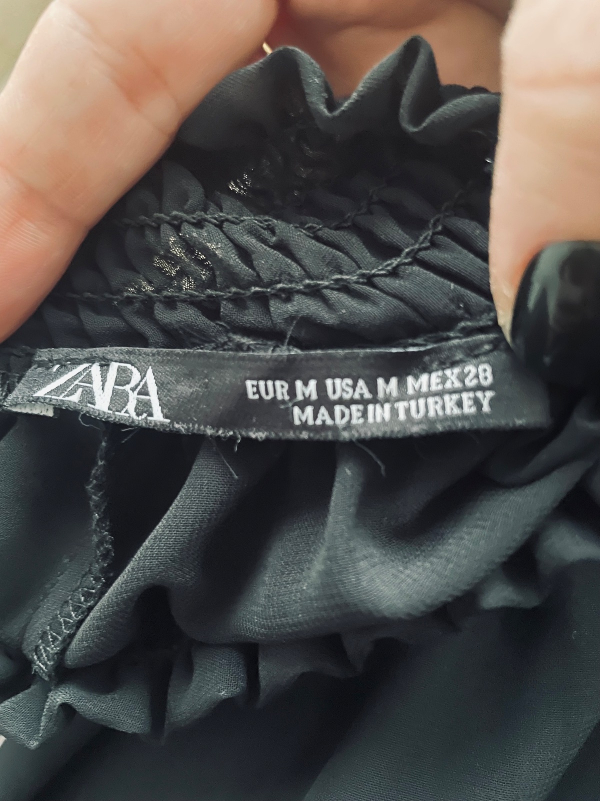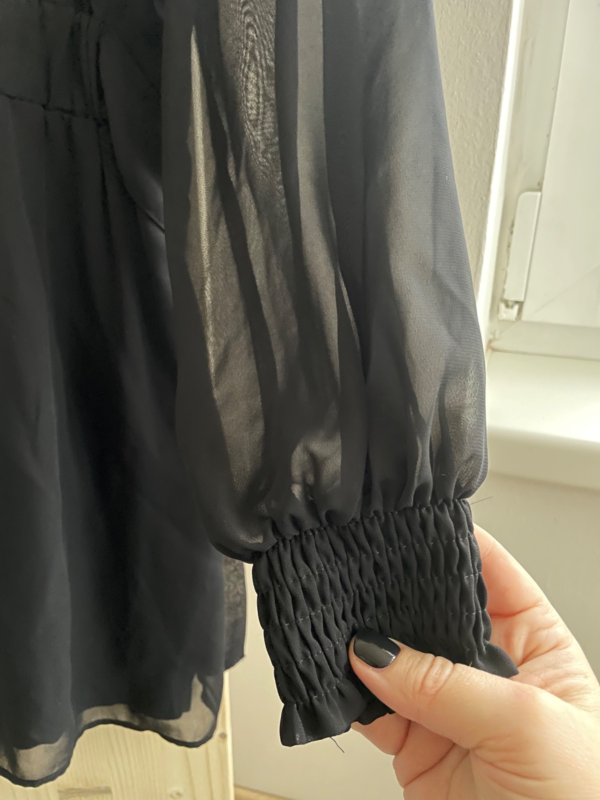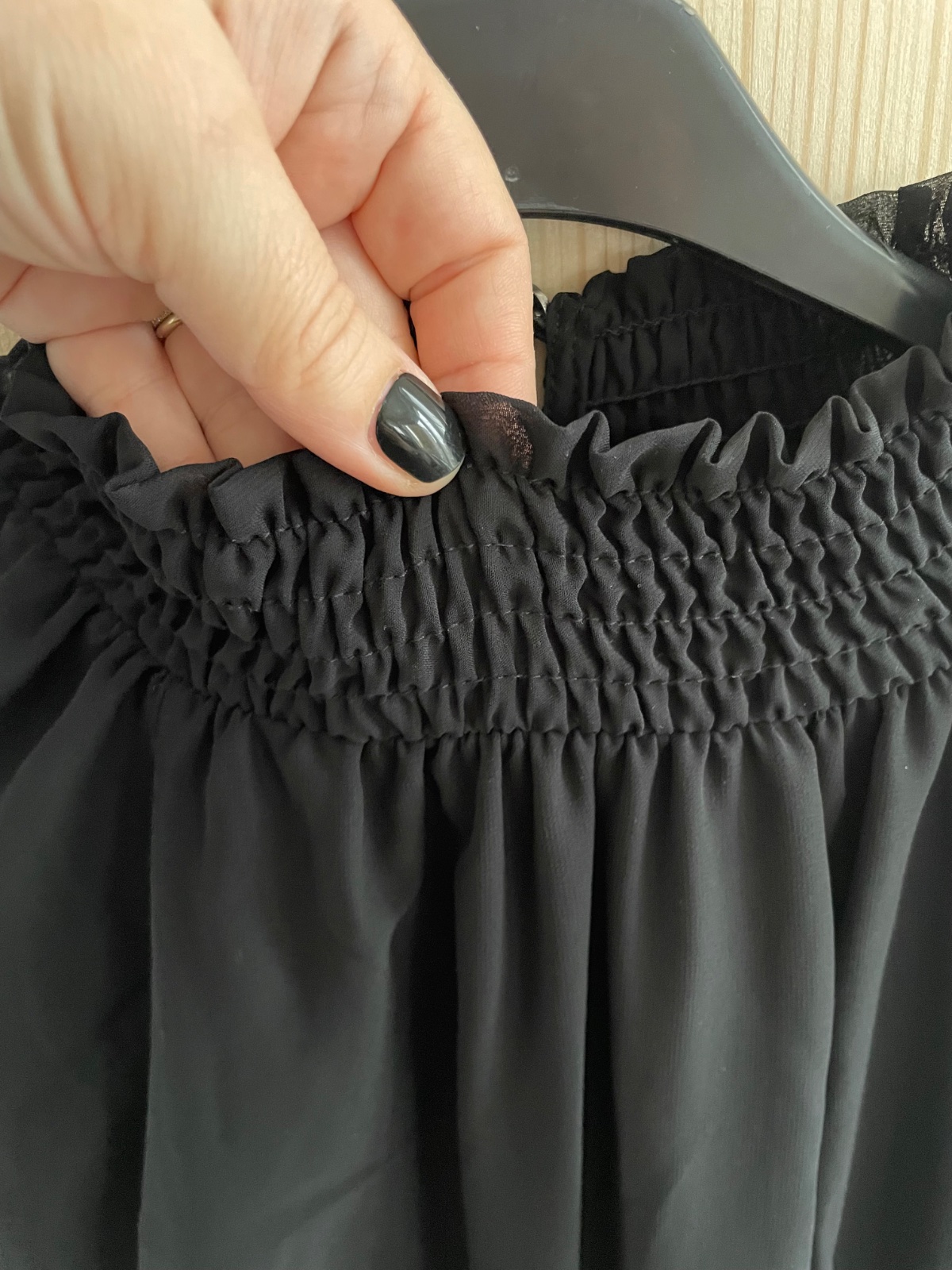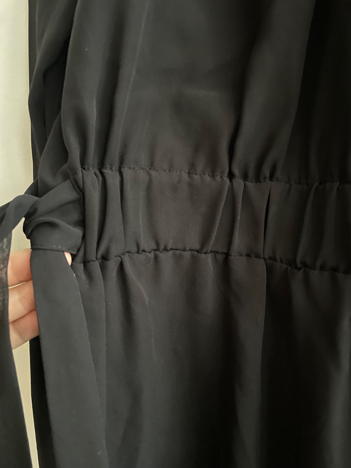 Elegantny overal zaujimaveho strihu, s peknymi detailami nariasenej gumicky na rukavoch a stojaciku, v pase na gumicku, s maslami na uvazovanie, chrbat odhaleny. Pri foteni som nasla popustenu nitku vzadu pri zapinani. Obleceny raz.