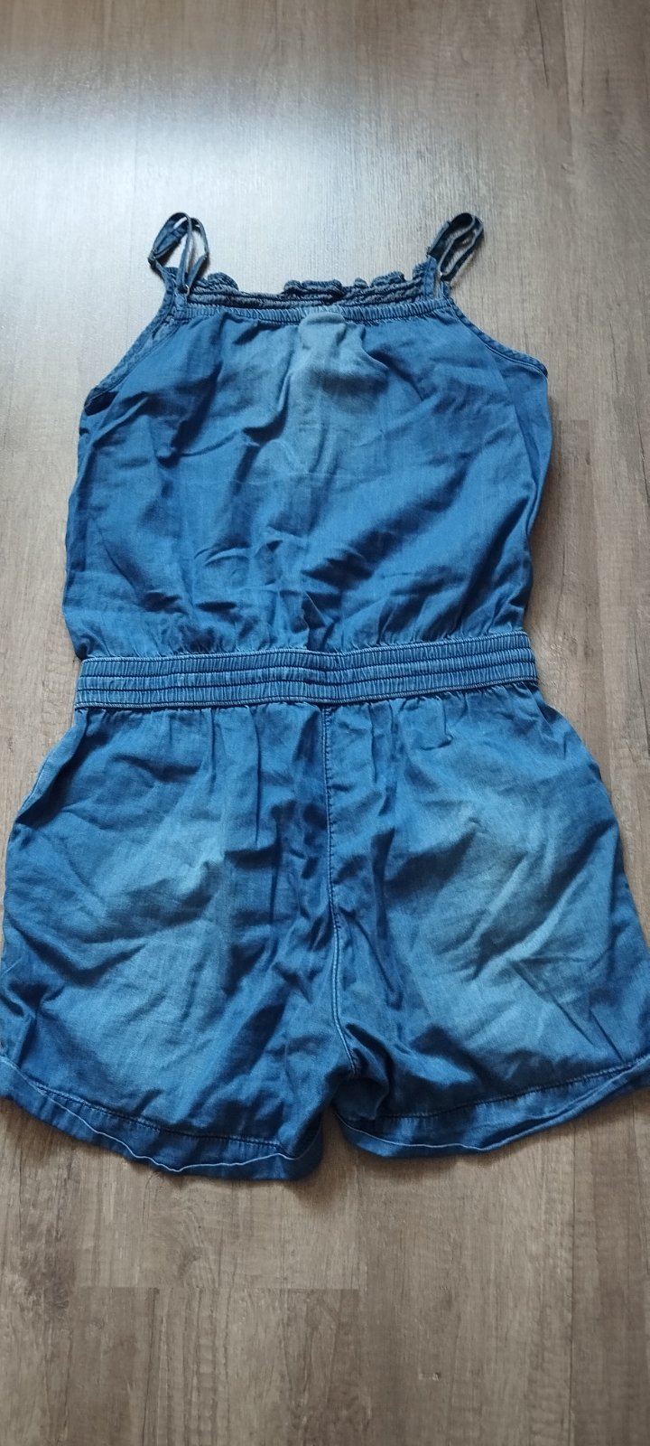 Krásny rifľový overal, zaväzovanie okolo krku, písaná velkosť 14, ale určite menší /tak na 12-13 rokov/, bez chyby