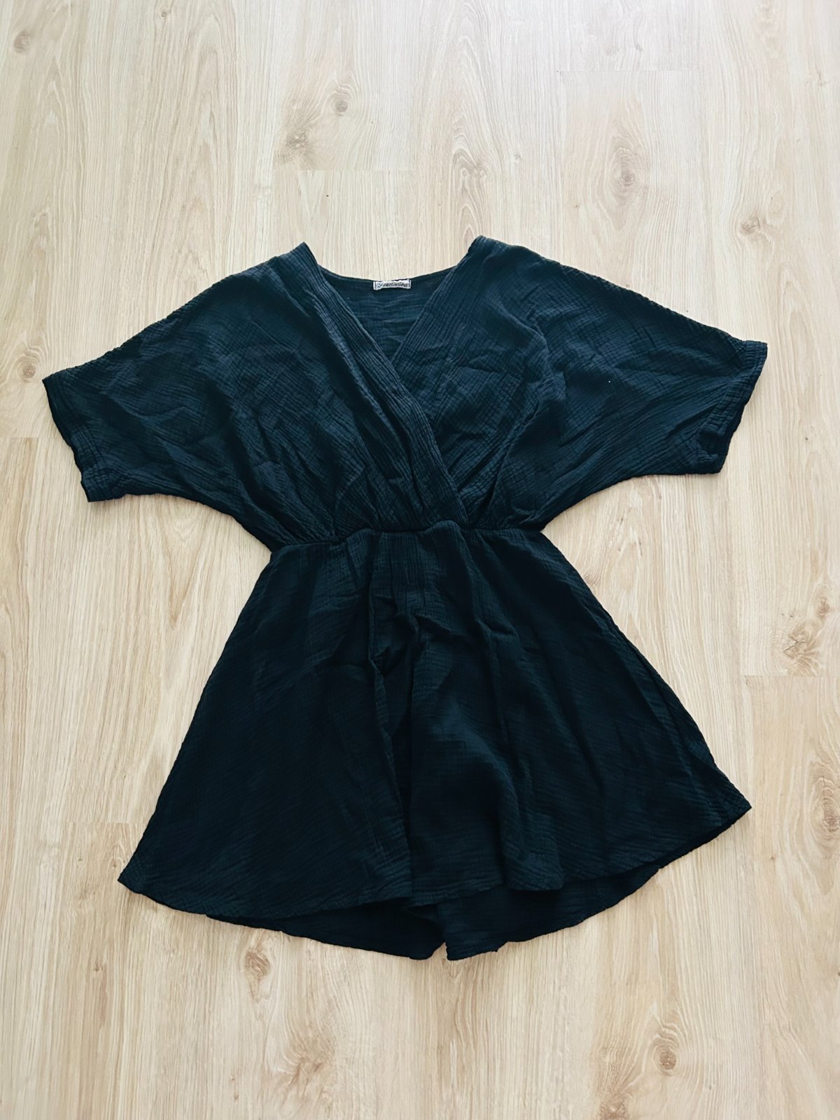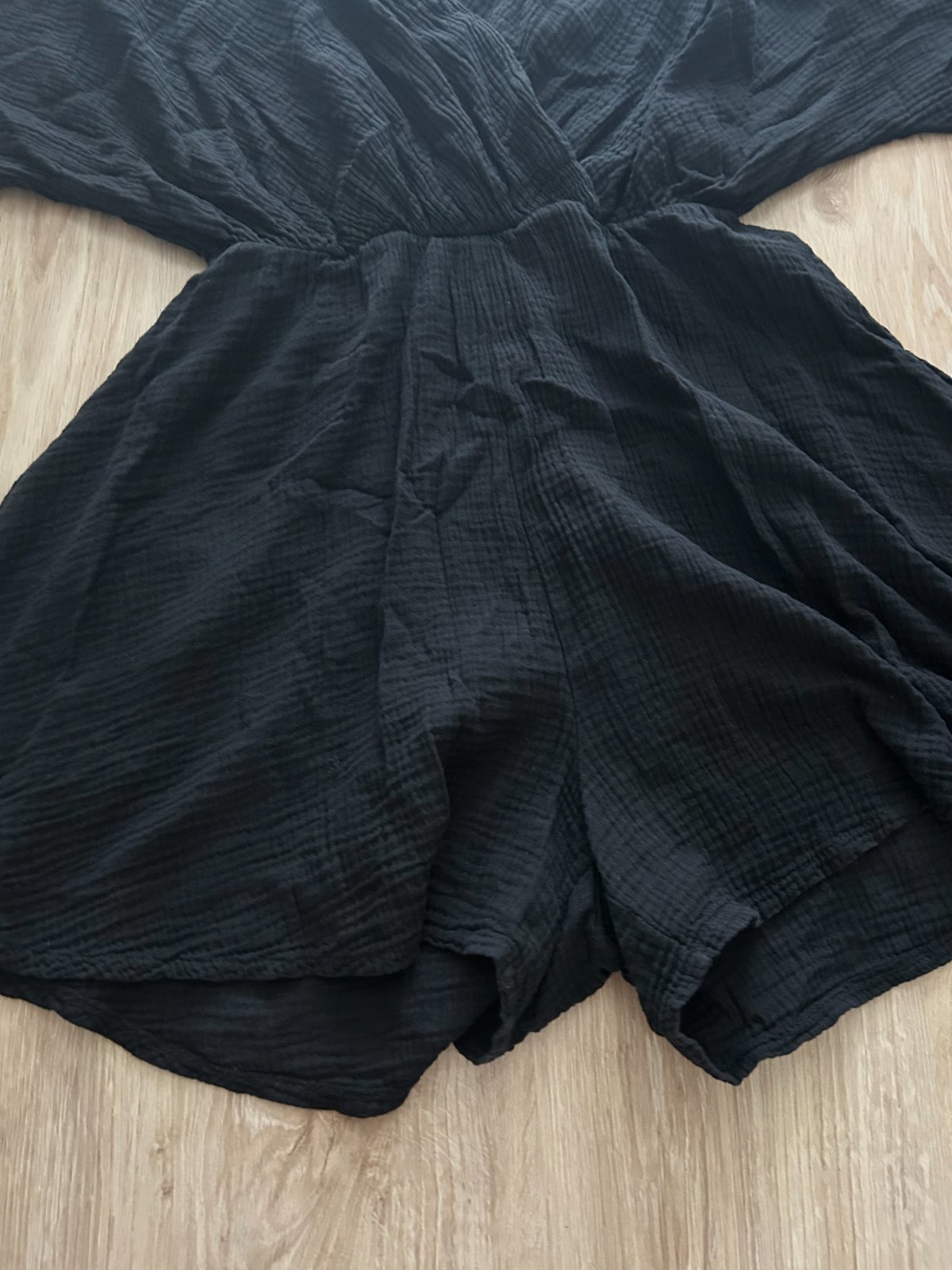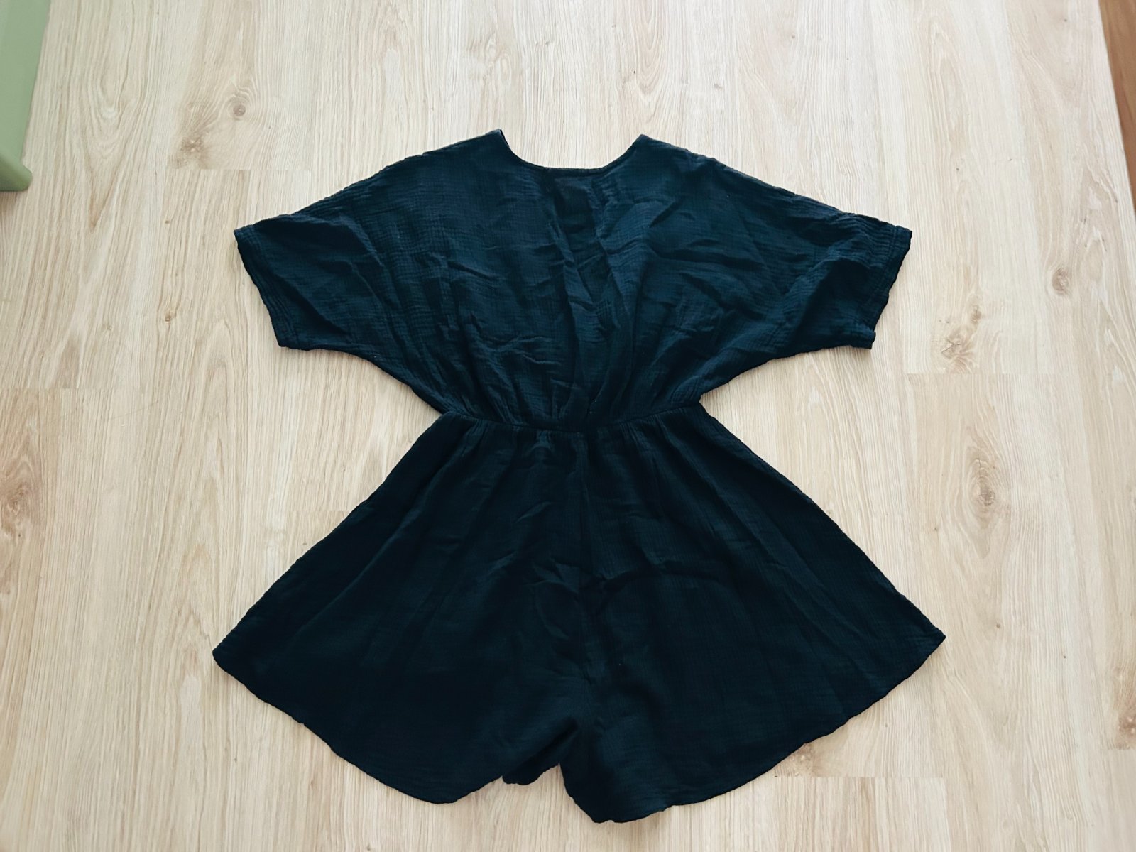 Predám tento krásny mušelínový overal značky GREEN APPLE v univerzálnej veľkosti. Oblečený bol len 1x. Overal má sýtu čiernu farbu, výstrih do tvaru V. V páse je elastická gumička. Overal je ľahučký a z veľmi príjemného materiálu.