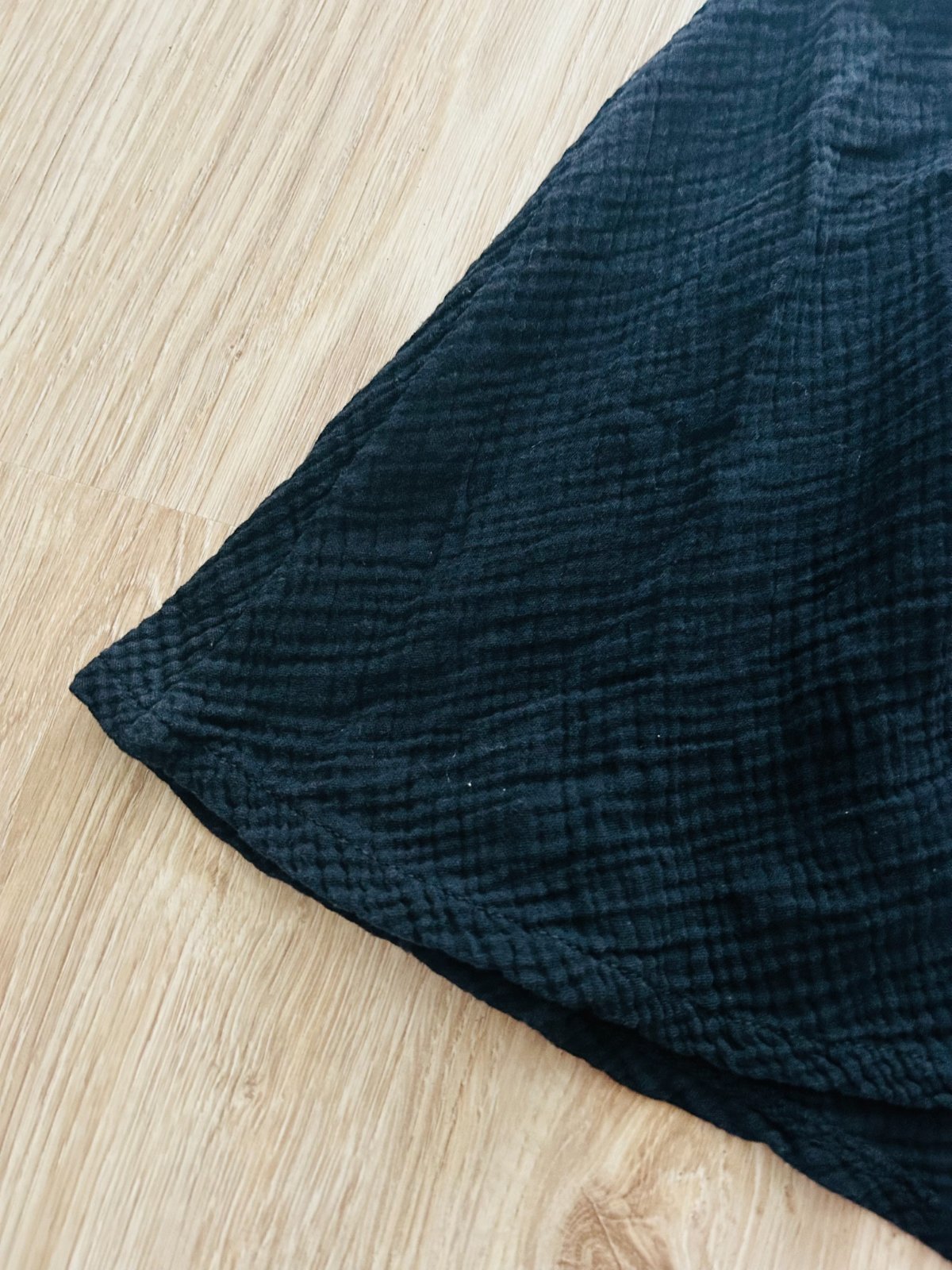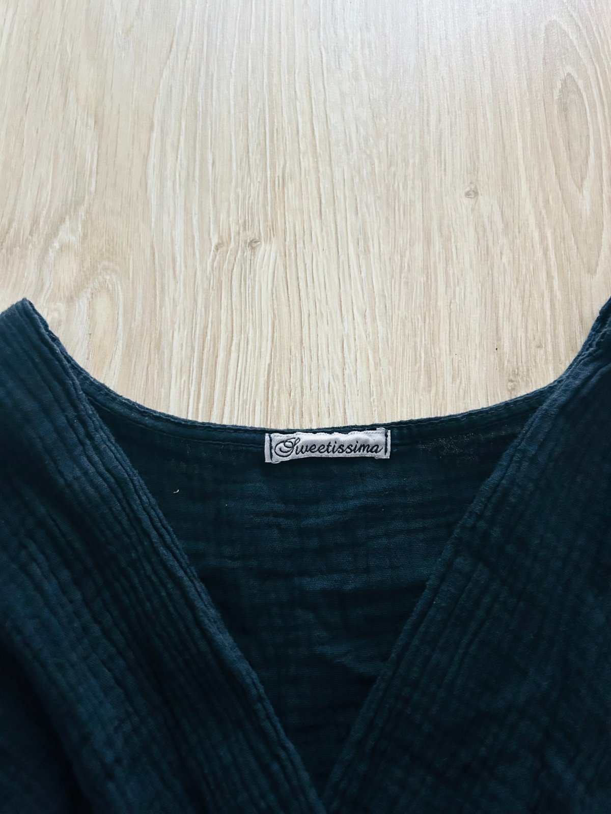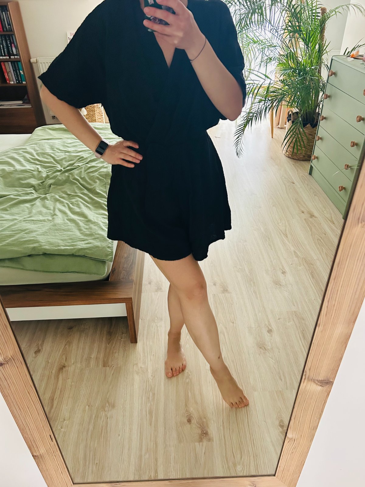 Predám tento krásny mušelínový overal značky GREEN APPLE v univerzálnej veľkosti. Oblečený bol len 1x. Overal má sýtu čiernu farbu, výstrih do tvaru V. V páse je elastická gumička. Overal je ľahučký a z veľmi príjemného materiálu.