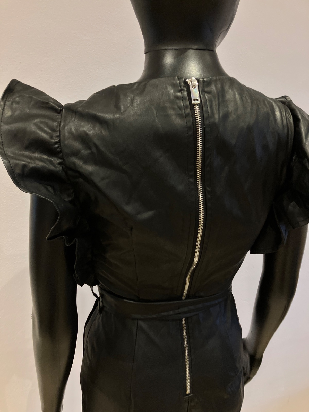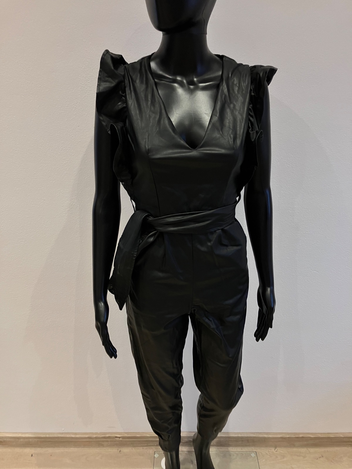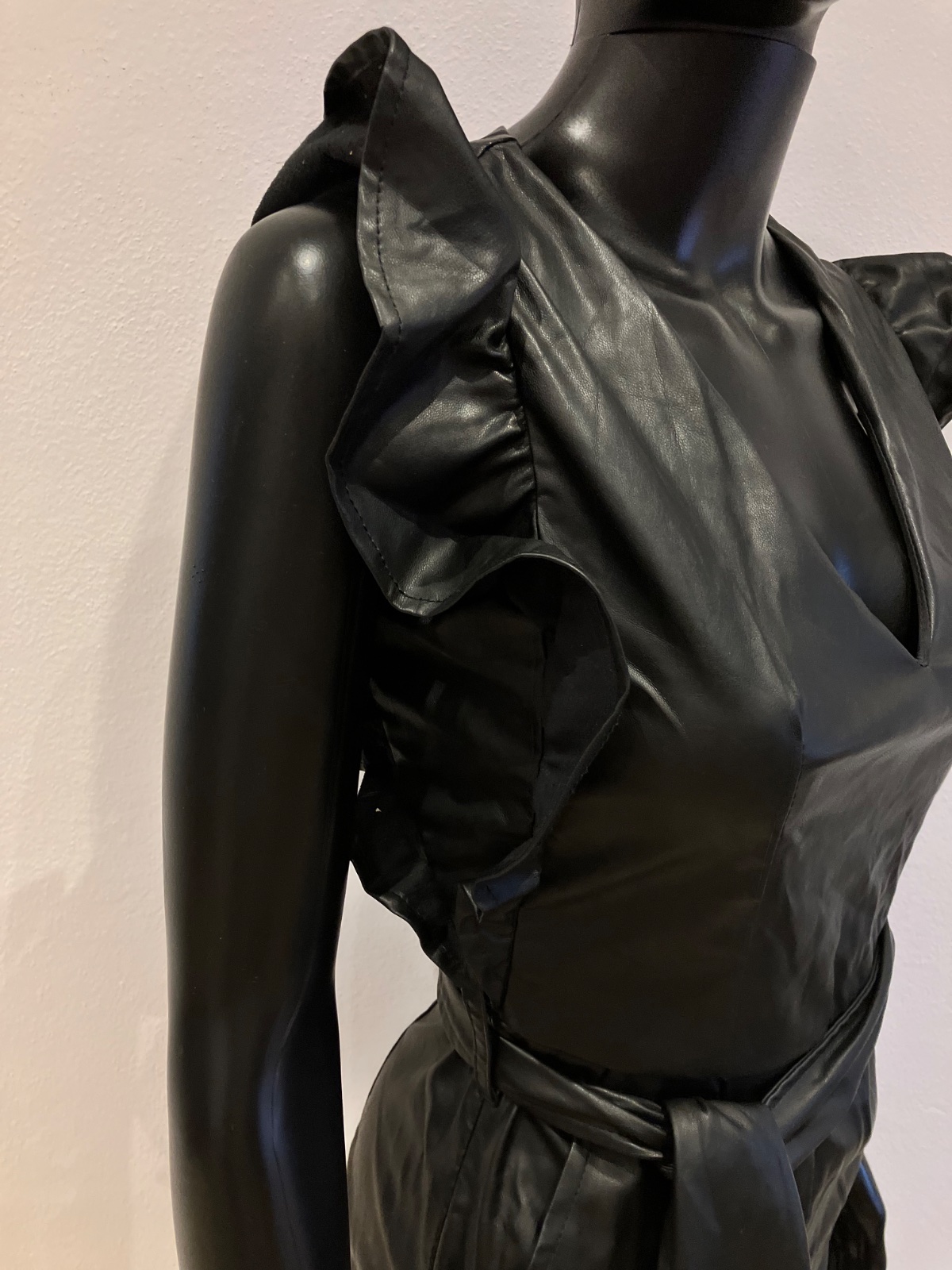 Dámsky kožený overal čierny s volánmi, véčkový výstrih, opasok na drieku, malý rukáv, zapínanie vzadu na zips, dve bočné vrecká, jemne elastický, materiál 100%polyester, veľkosť XS / 24.