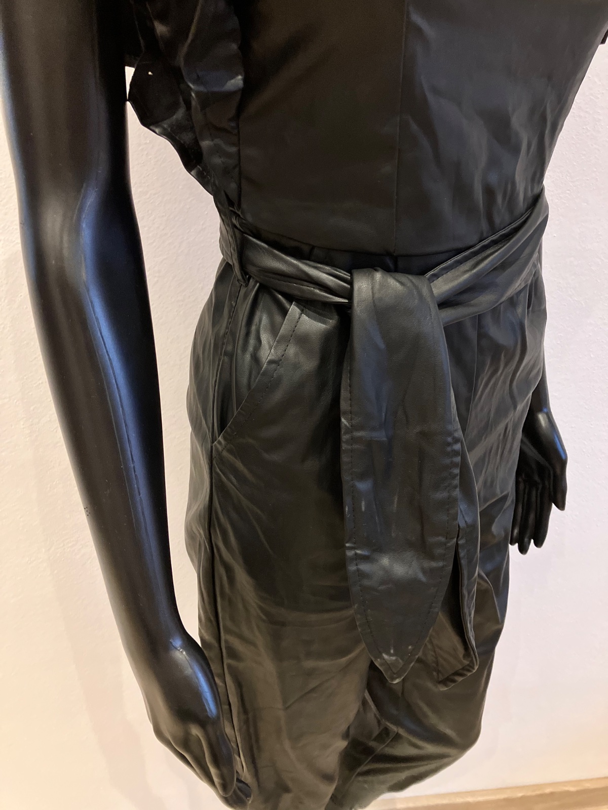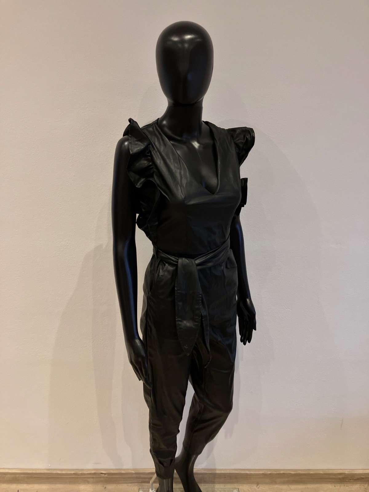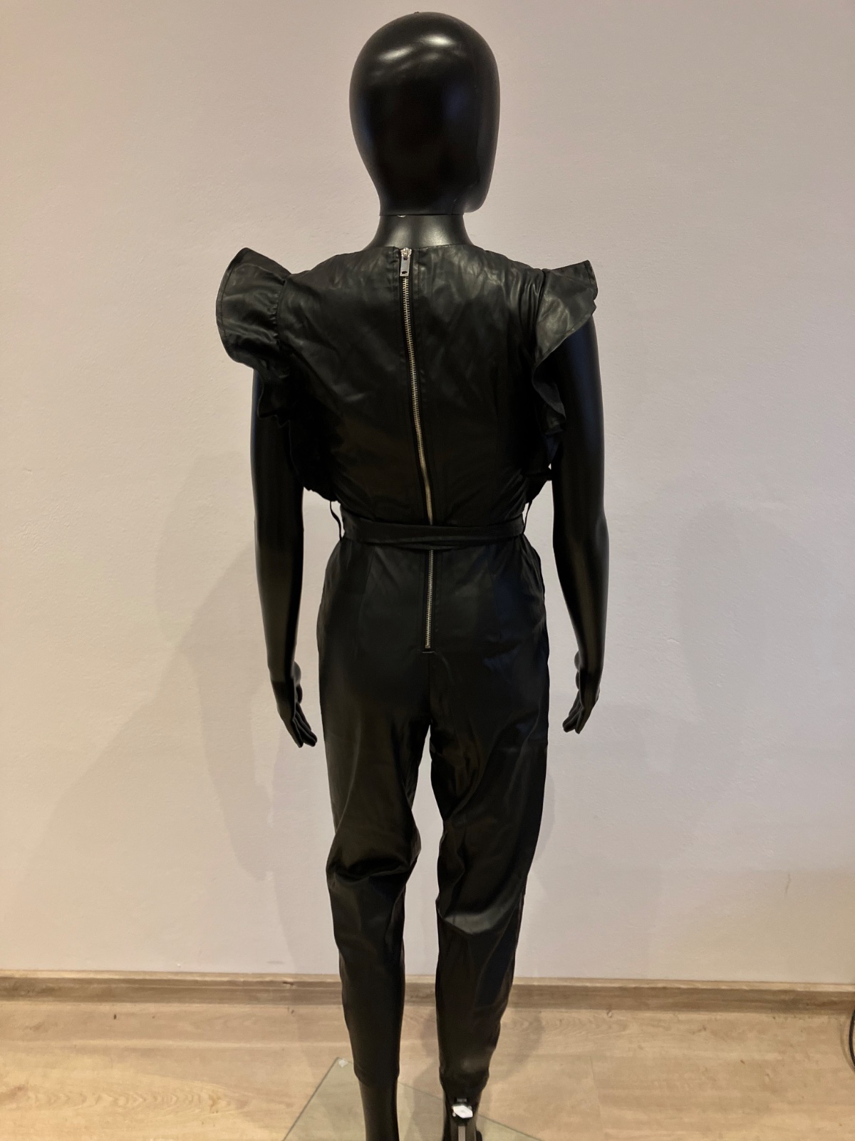 Dámsky kožený overal čierny s volánmi, véčkový výstrih, opasok na drieku, malý rukáv, zapínanie vzadu na zips, dve bočné vrecká, jemne elastický, materiál 100%polyester, veľkosť XS / 24.