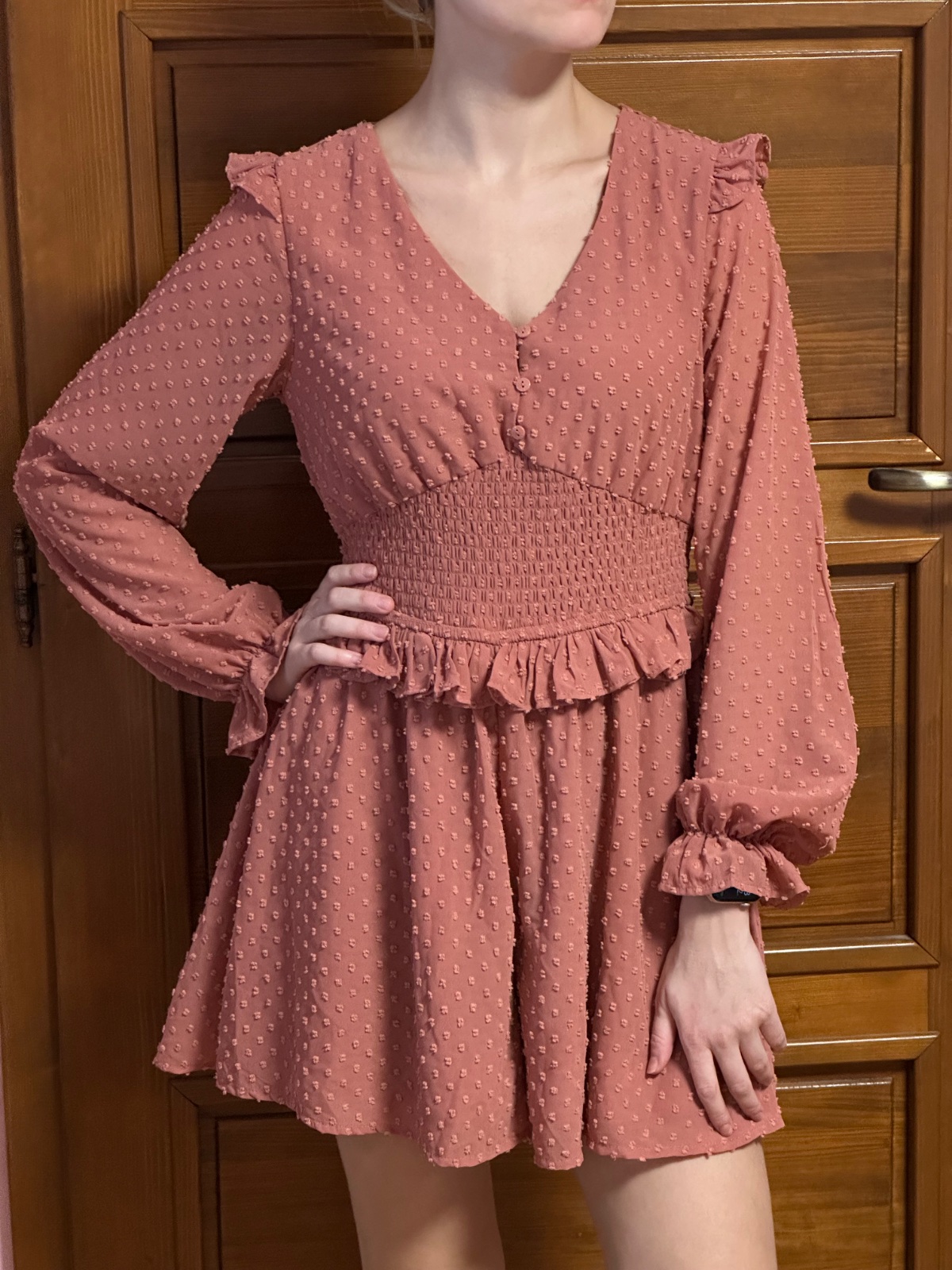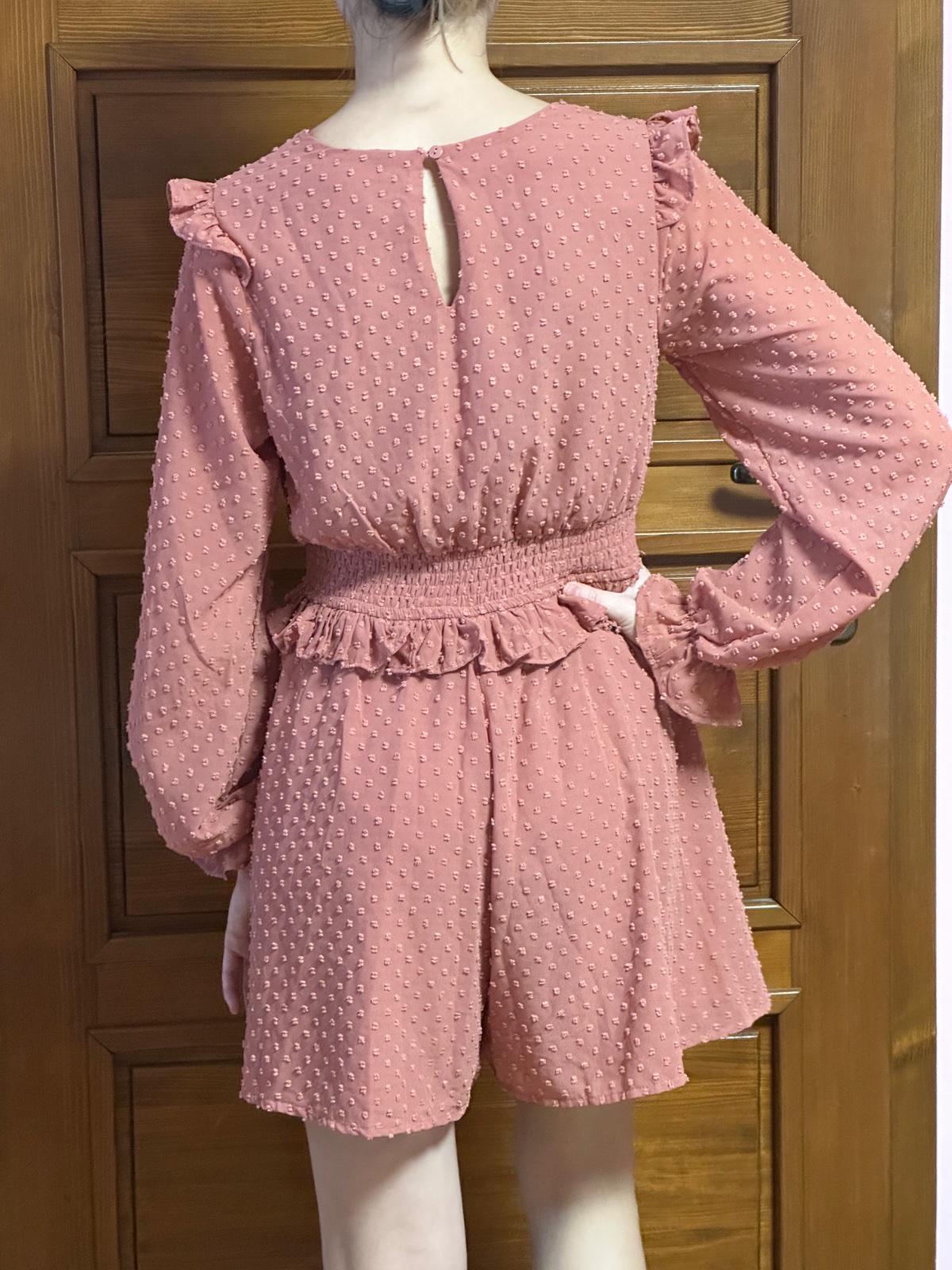 Overal má romantický strih s jemnou štruktúrovanou (tzv. swiss dot) látkou, výstrih do V s ozdobnými gombíkmi a elastický riasený pás, ktorý krásne zvýrazní postavu. V oblasti ramien a na rukávoch sa nachádzajú jemné volány, ktoré dodávajú kúsku ženský a elegantný vzhľad. Rukávy sú zakončené elastickými manžetami.