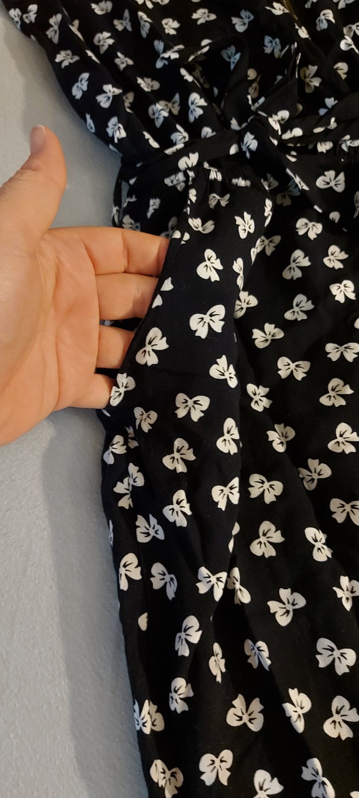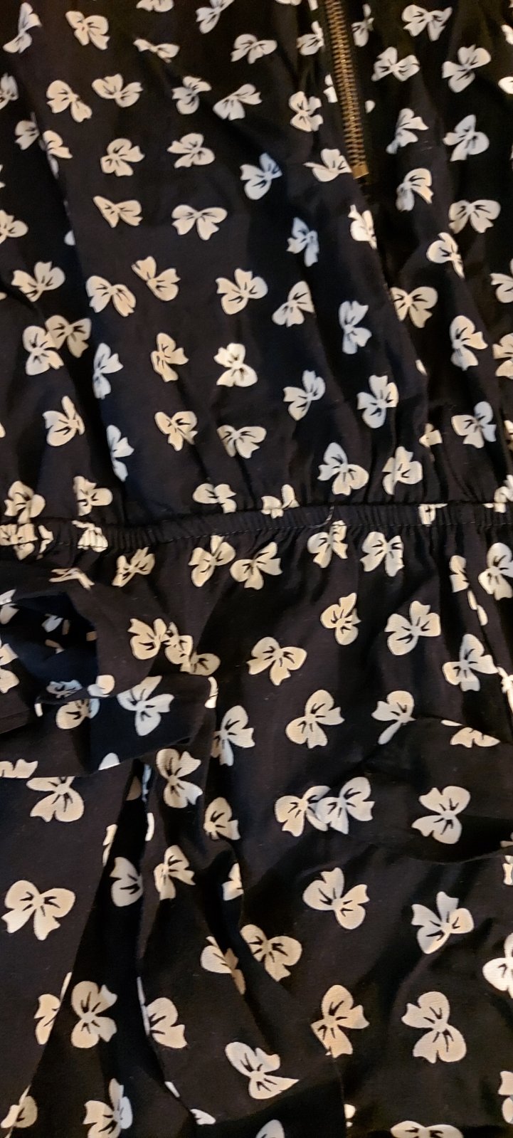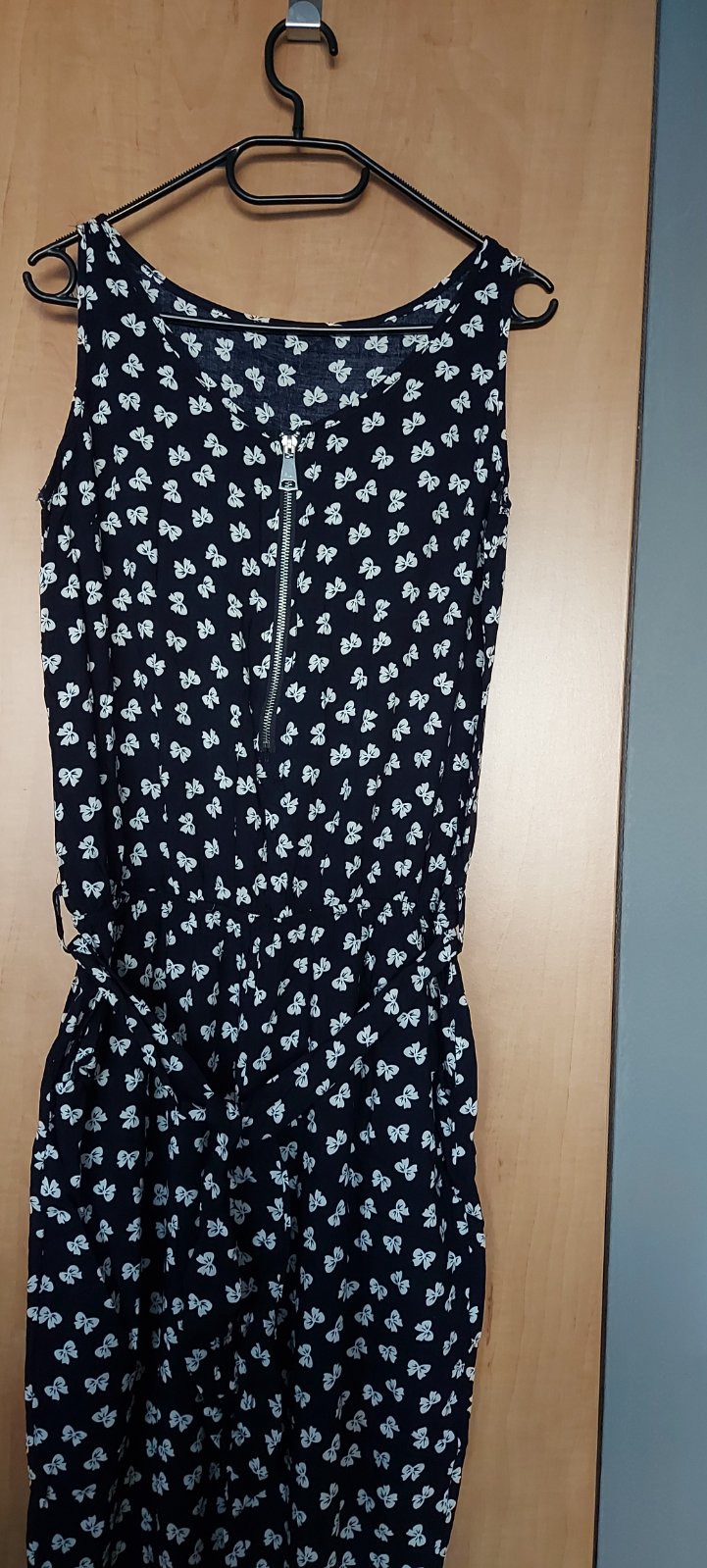 Krásny letný overál čierný s bielimi mašľami na zips ,v páse gumla aj opasok ,2 vrecka. Rozmery sú na foto. Veľ. 40 málo nosený. Cena plus pošta
