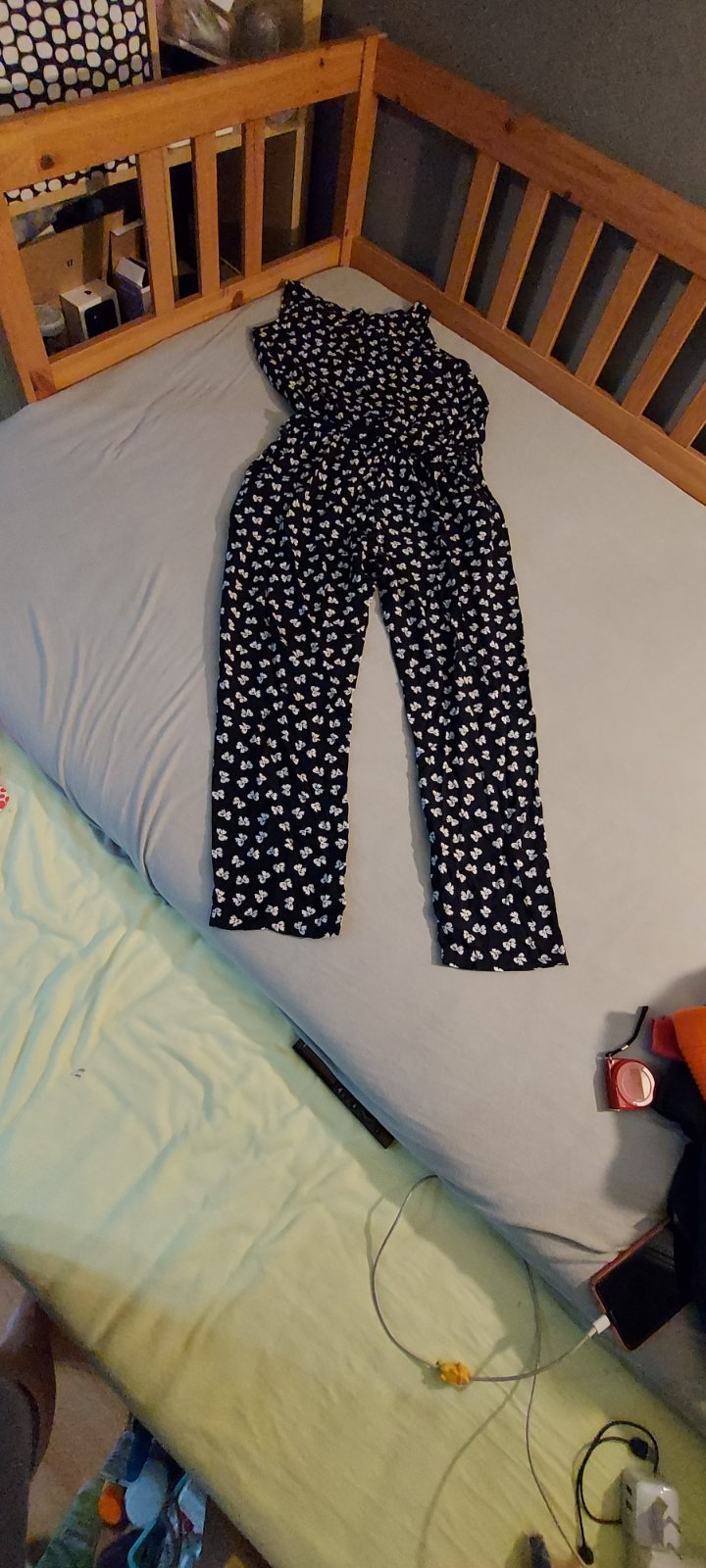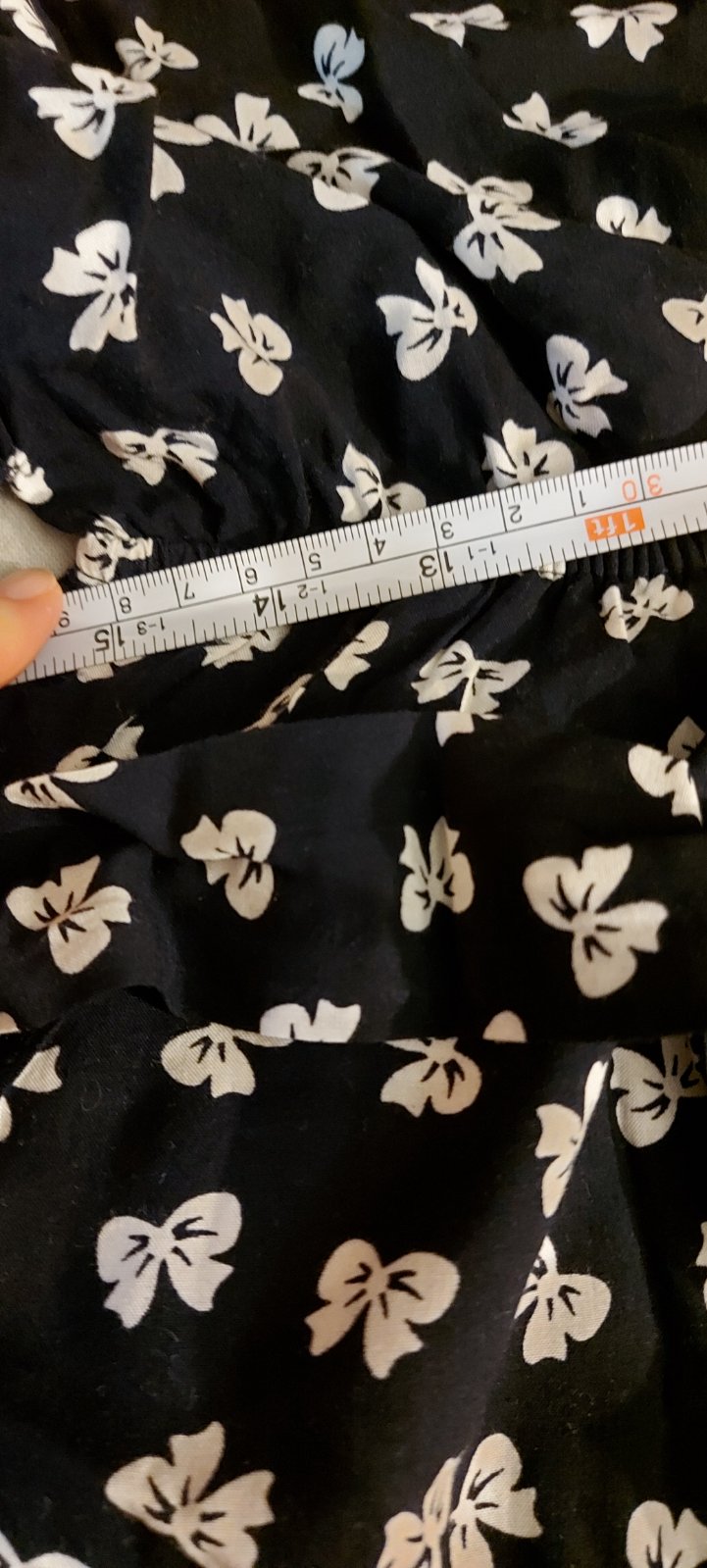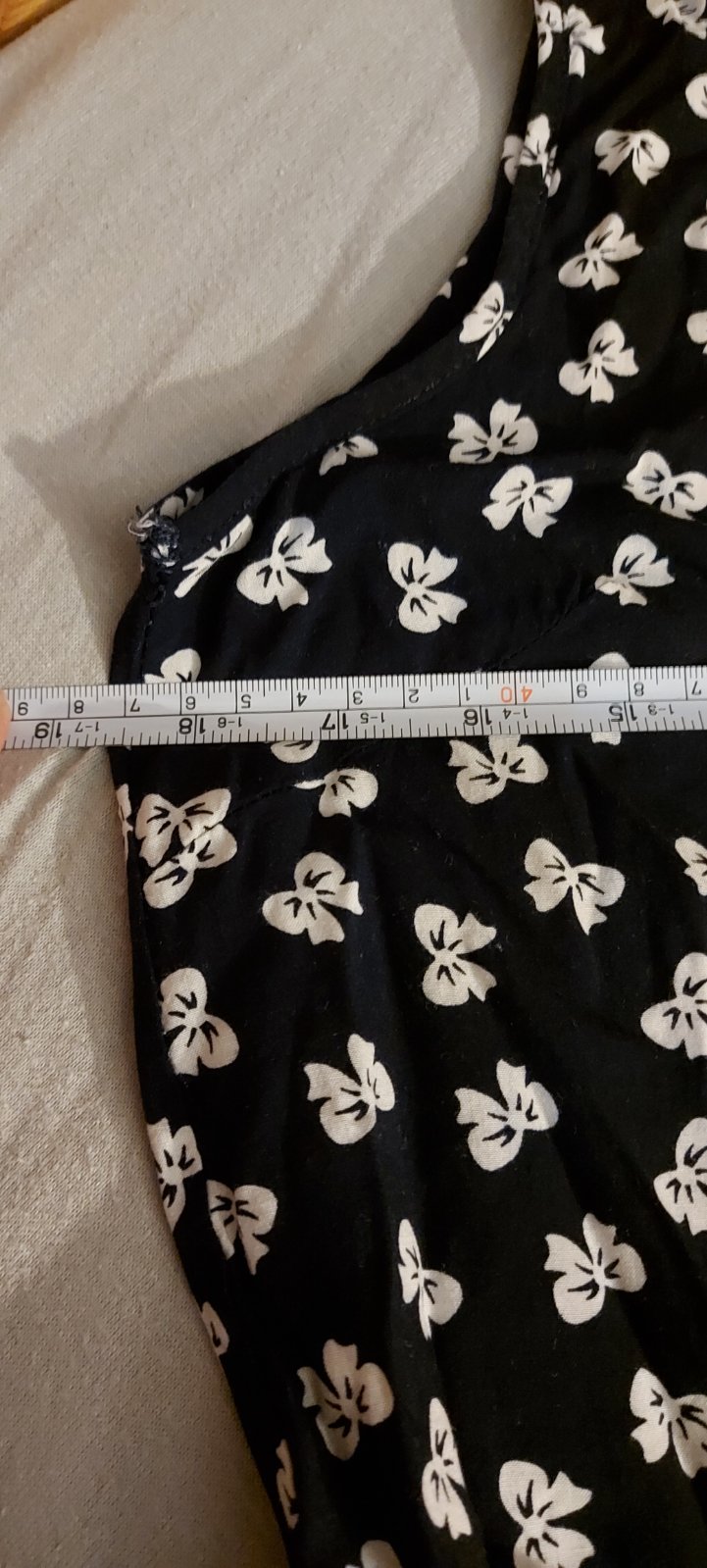 Krásny letný overál čierný s bielimi mašľami na zips ,v páse gumla aj opasok ,2 vrecka. Rozmery sú na foto. Veľ. 40 málo nosený. Cena plus pošta
