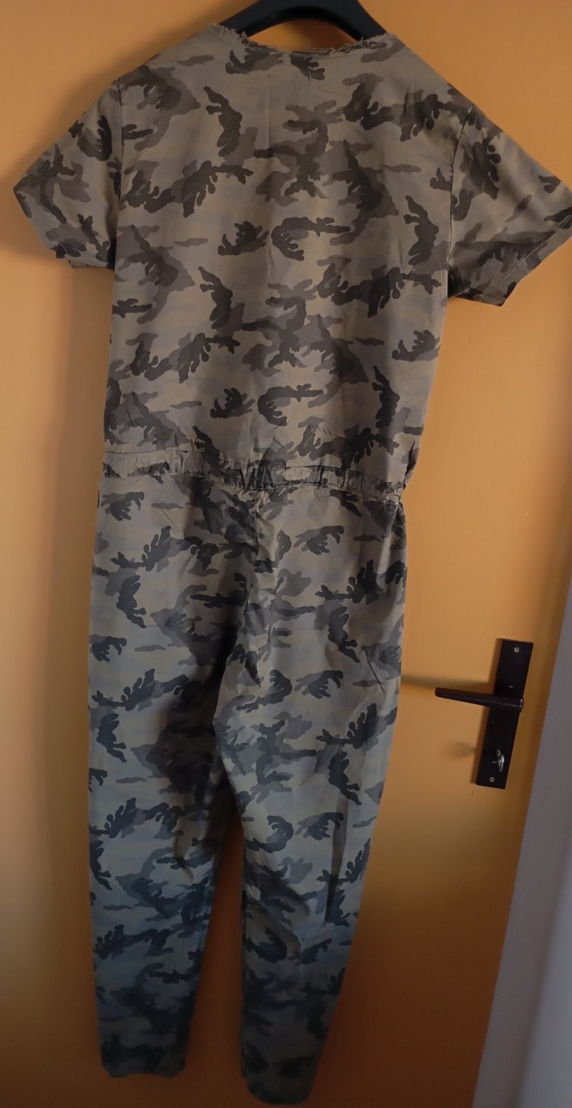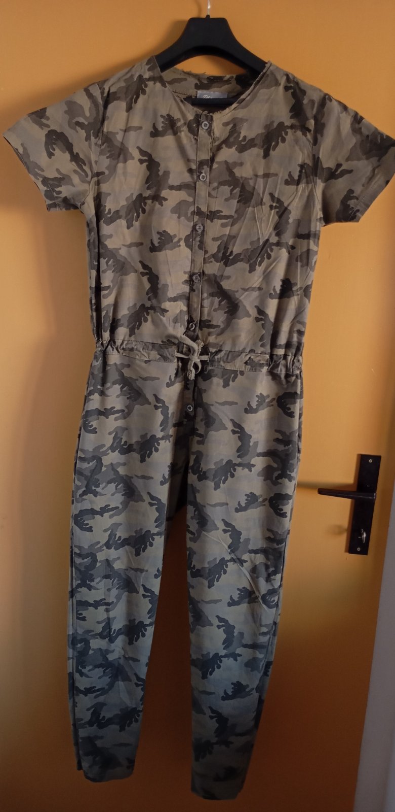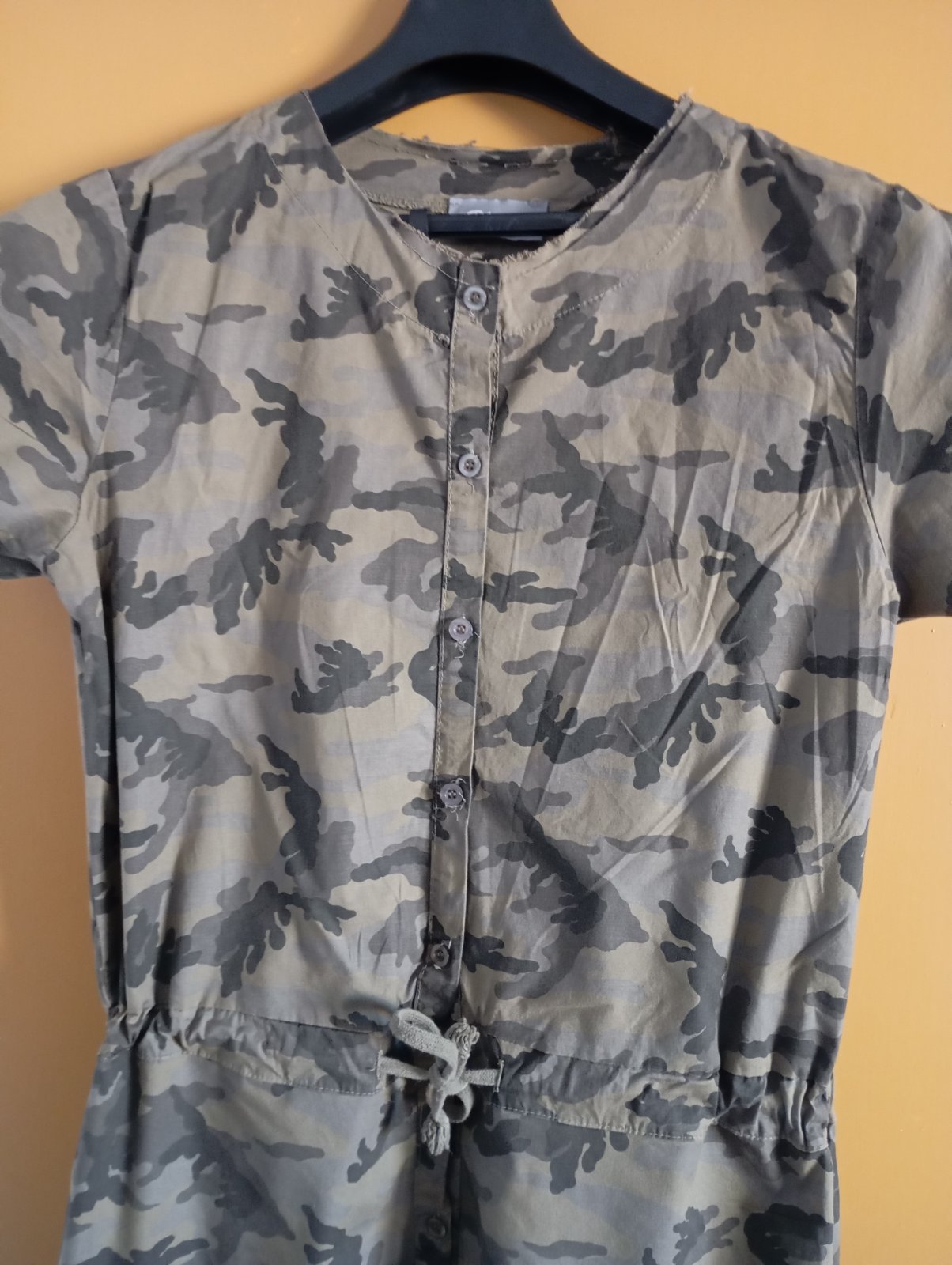 Predám dámsky maskáčovy overal, veľkosť Uni, vojenská zelená farba s čiernou a šedou kombináciu. Zapínanie na gombíky, v páse sa upravuje šnúrkou, bez poškodenia. Cena 7€plus poštovné.