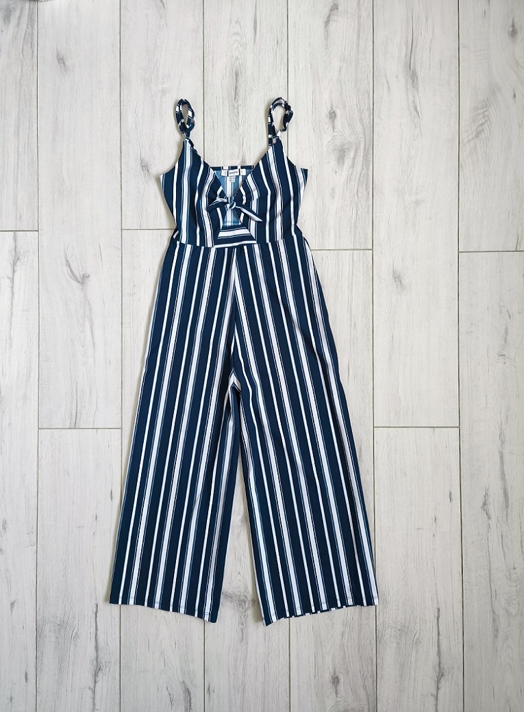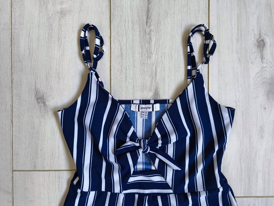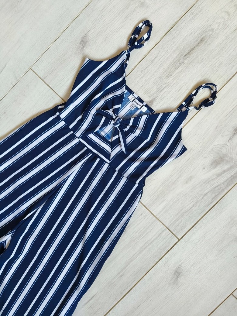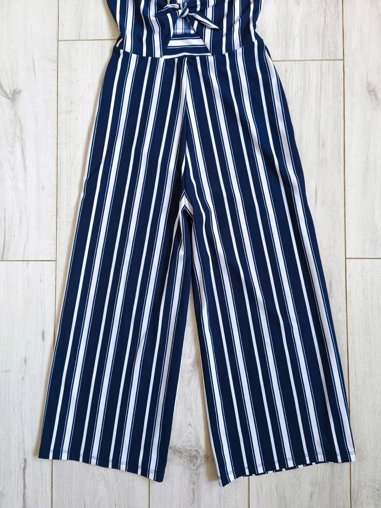 Ponúkam tento dámsky či dievčenský overal zn. JENNYFER, prúžkový tmavomodro-biely, tenké nastaviteľné ramienka, medzi prsiami s viazaním a malým otvorom, široké nohavice, elastický, 7/8 dĺžka, v perfektnom stave.
