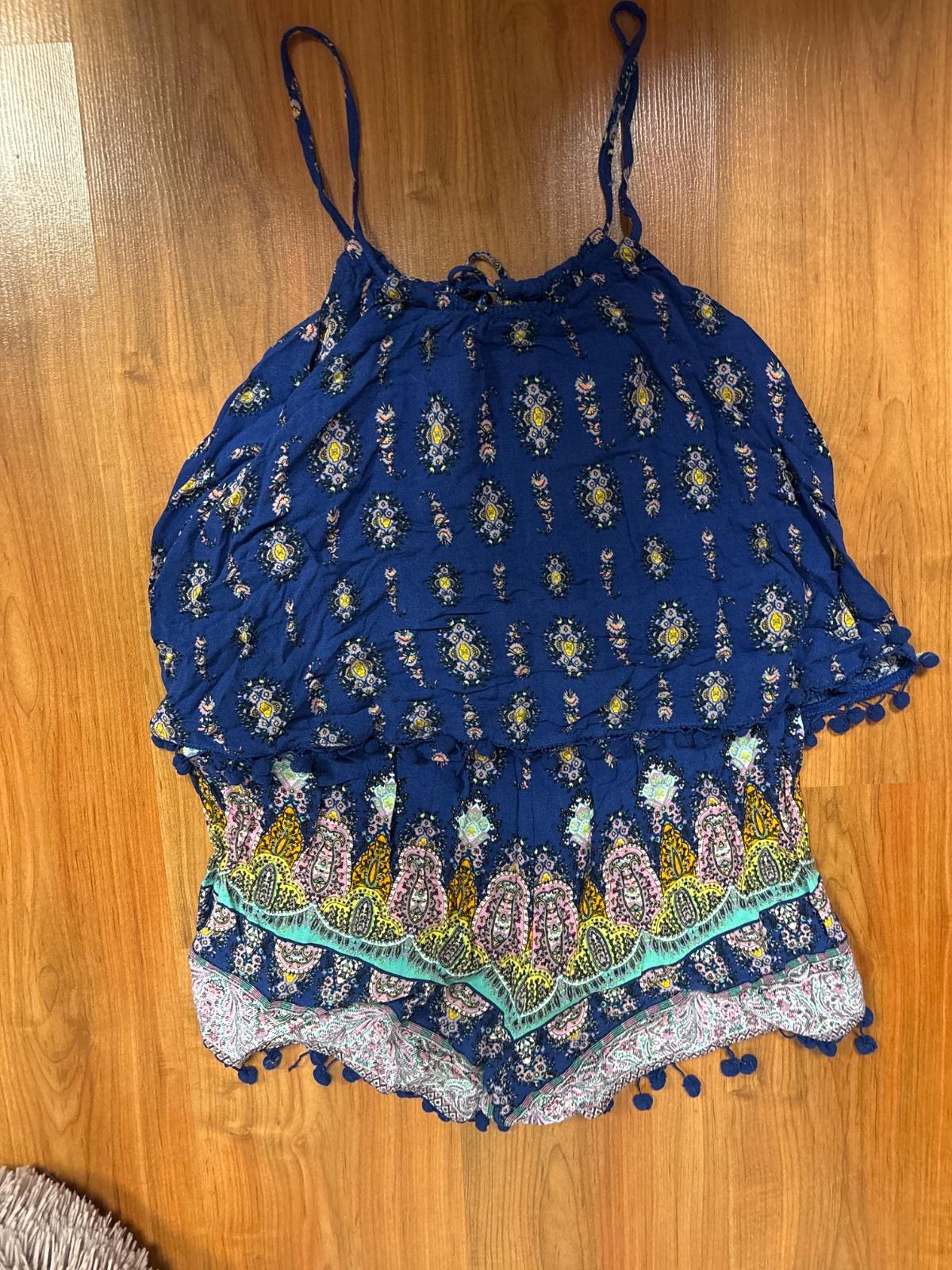 IHNEĎ K ODBERU Štýlový letný dámsky overal, v páse opasok na mašľu, s vreckami, krásne ukáže na opálenom tele, nosený zopár x v perfektnom stave, bez poškodenia. Dĺžka- 59cm overal +16cm ramienka ...