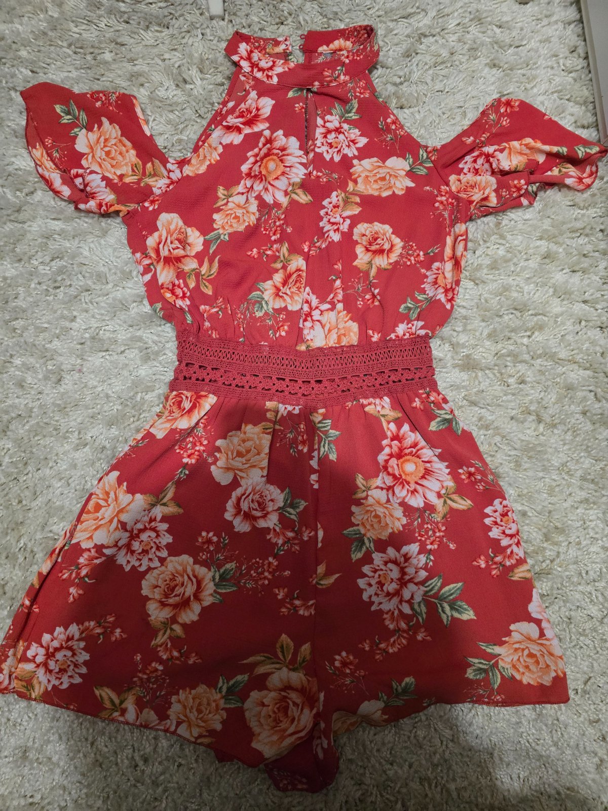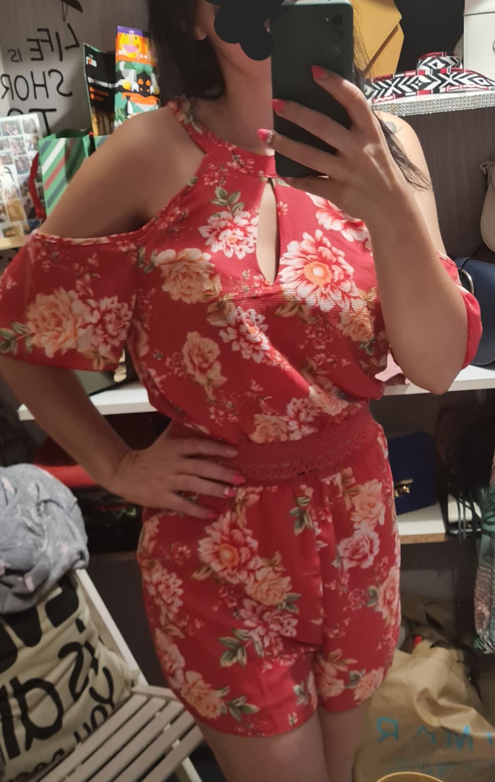 pekný kvietkovany overal bol oblečený asi 1x, v páse je na gumičku , takže elastický, mam ho aj v modrej farbe a ten používam viac, tak tento posuvam dalej