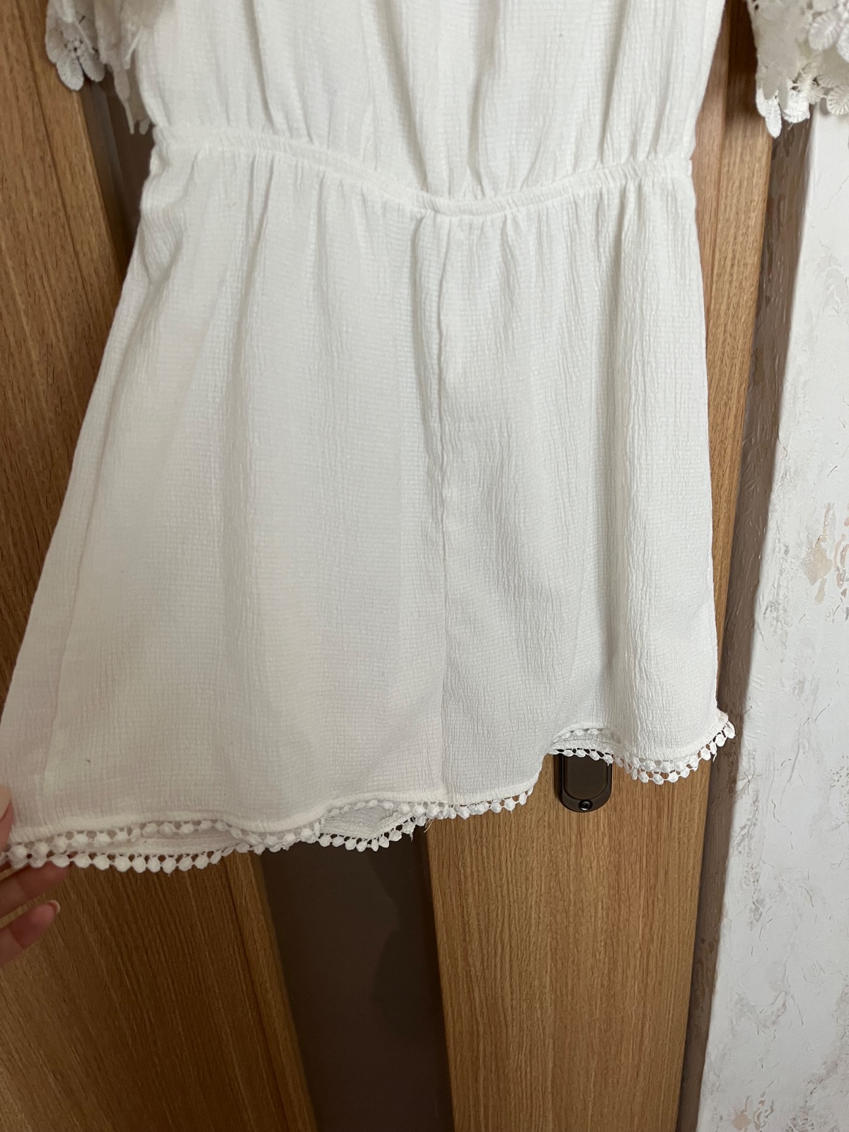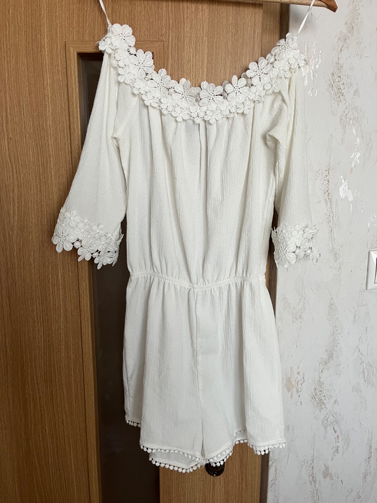 dámsky biely letný overal, v páse čipka, nastaviteľné ramienka, vzadu zapínanie na zips, nie je elastický, príjemný kvalitný materiál, zloženie: viscoza, stav: výborný, málo nosený, značka: Dovoz, ...