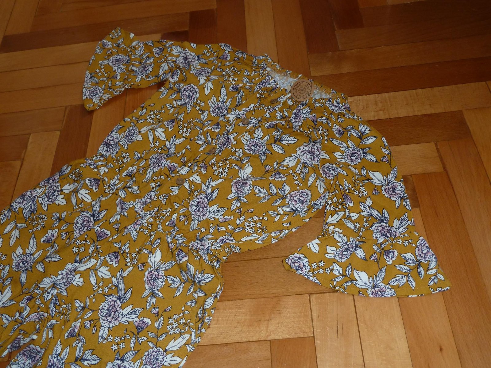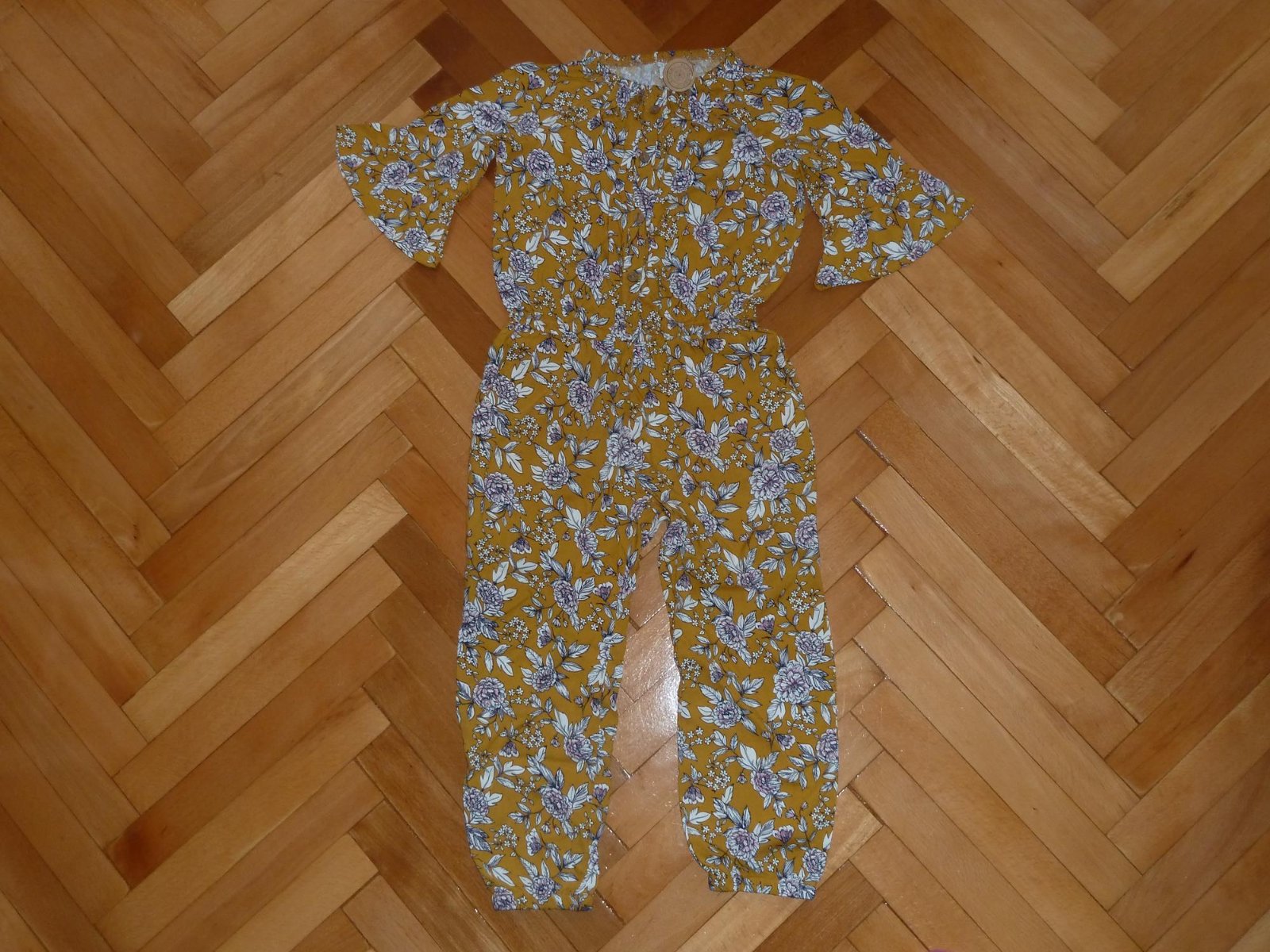 Nenoseny novy lahky letny overal, s visackou. Rukavy volanove, v pase gumicka, po bokoch vrecka, urcite sadne aj na velkost 116.