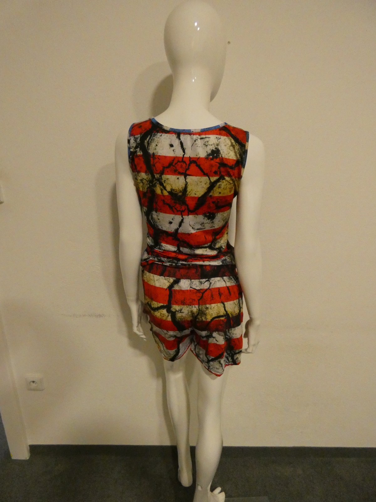 Nosené bez poškodenia.Overal - značka je Crazy Daisy , veľkosť je XL, materiál je 100% polyester. Rozmery sú šírka cez prsia v nenatiahnutom stave 42 cm x 2 v natiahnutom stave 50 cm x 2 , celková dlžka je 89 cm