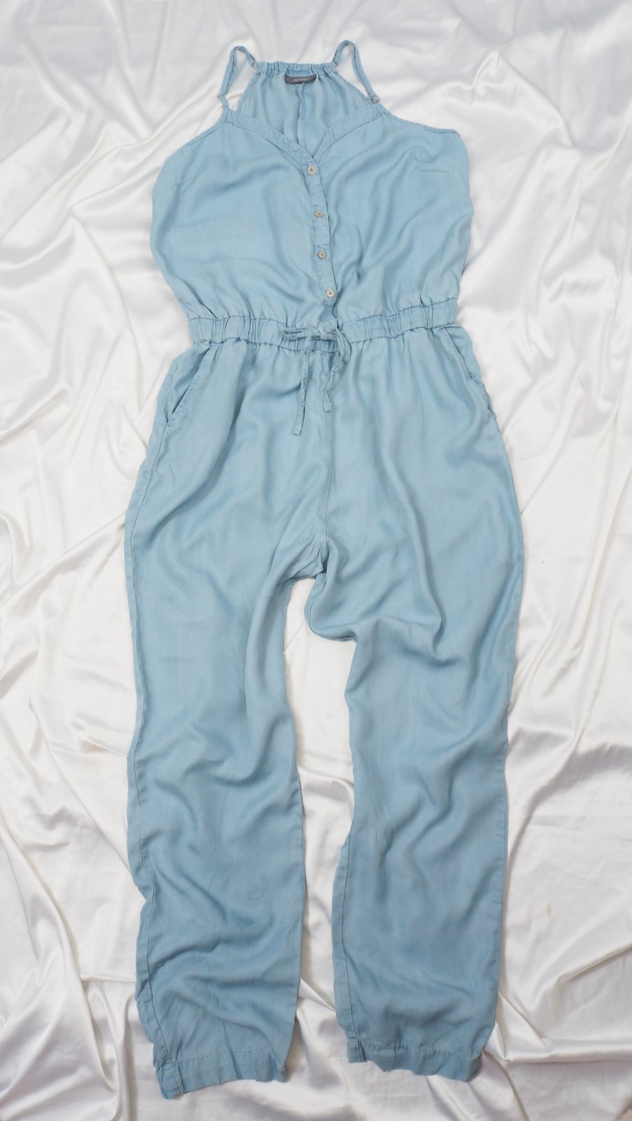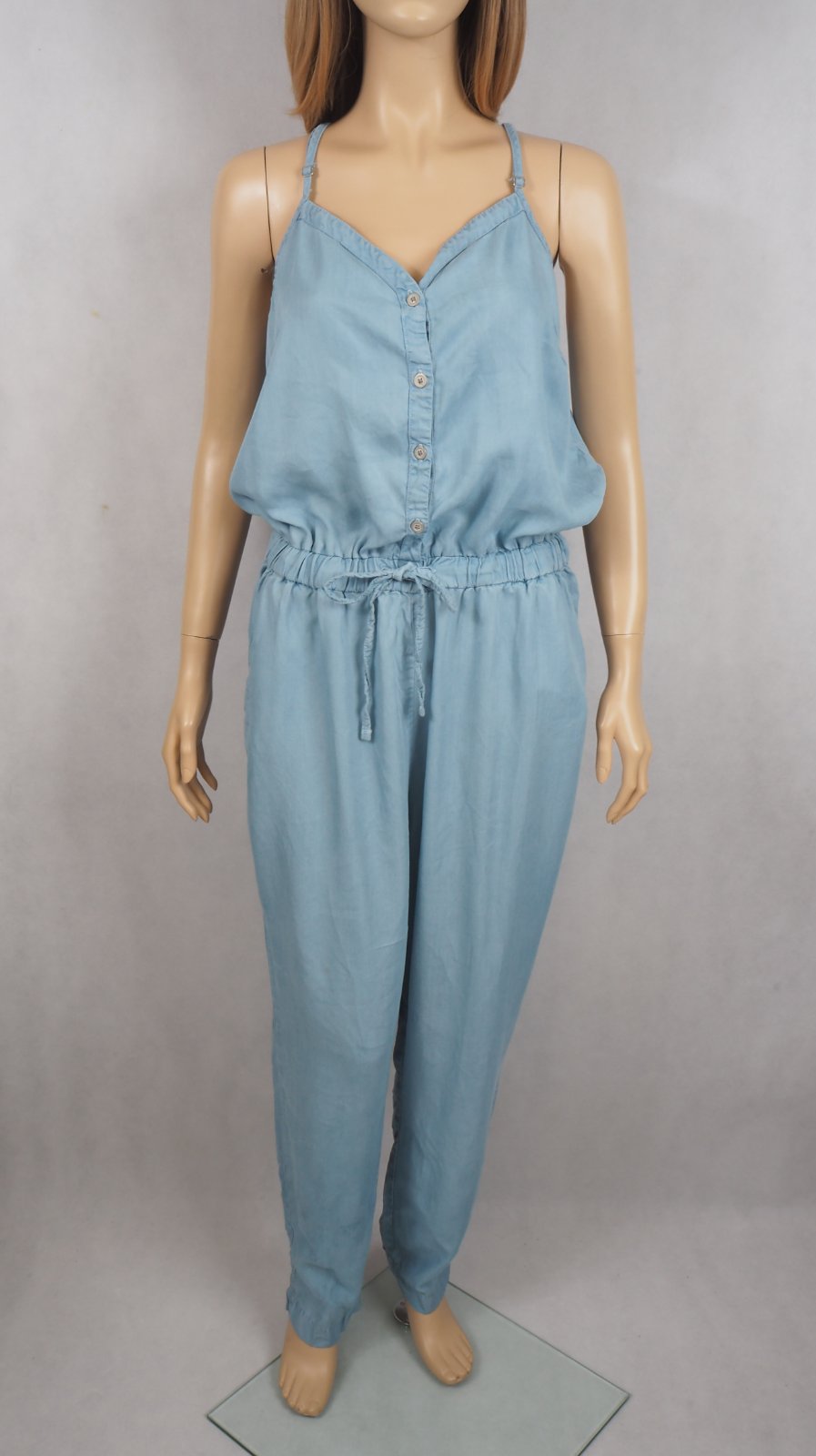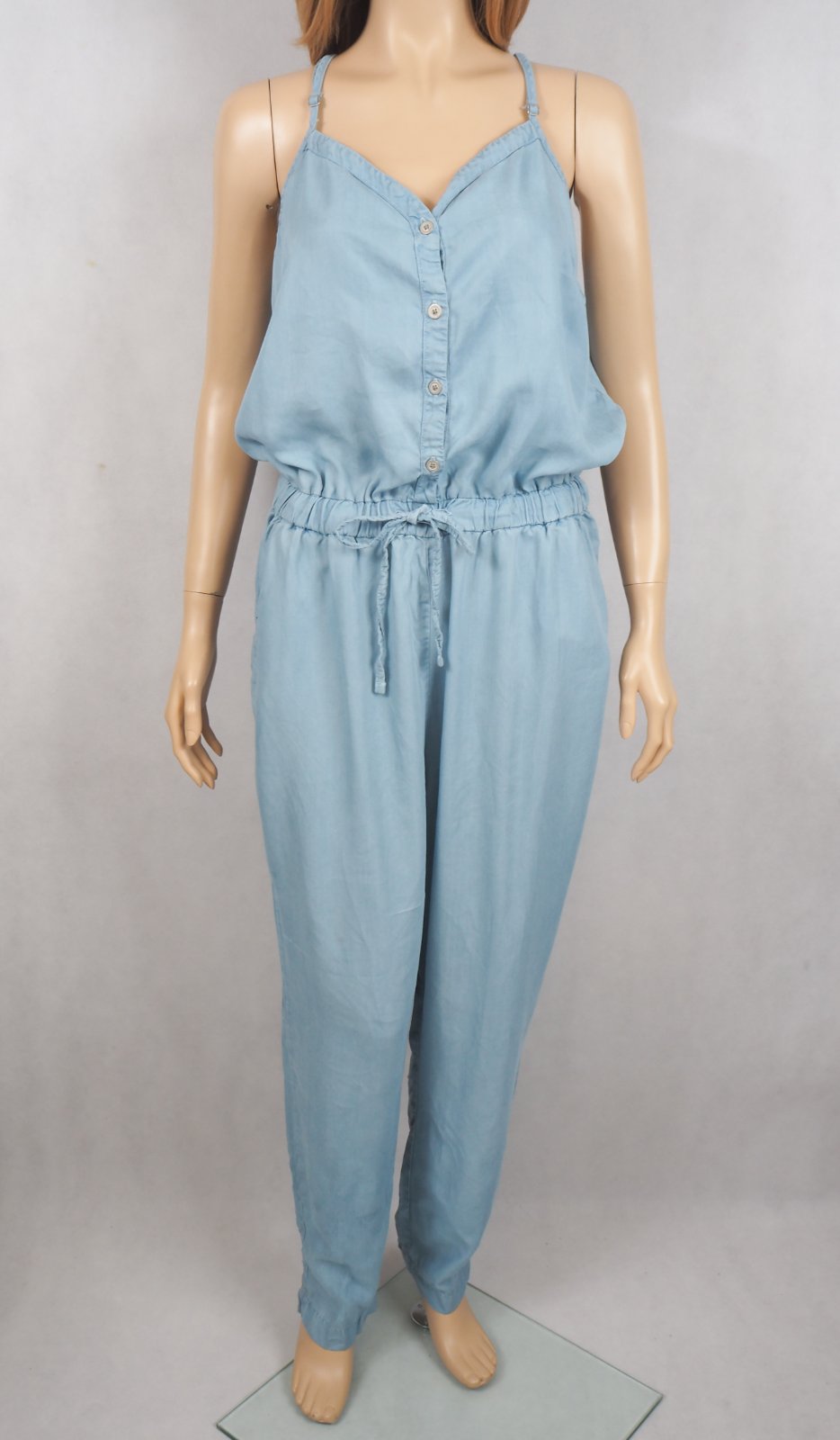 Kvalitný letný overal, bledomodrej farby, v páse gumka, materiál 100% lyocel, super stav.