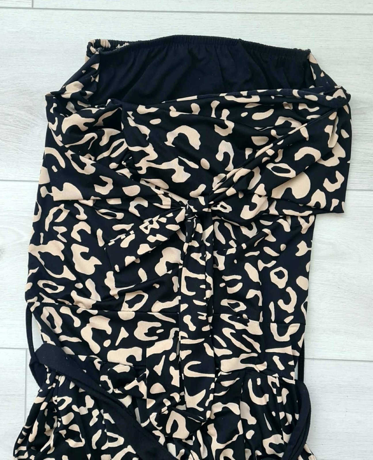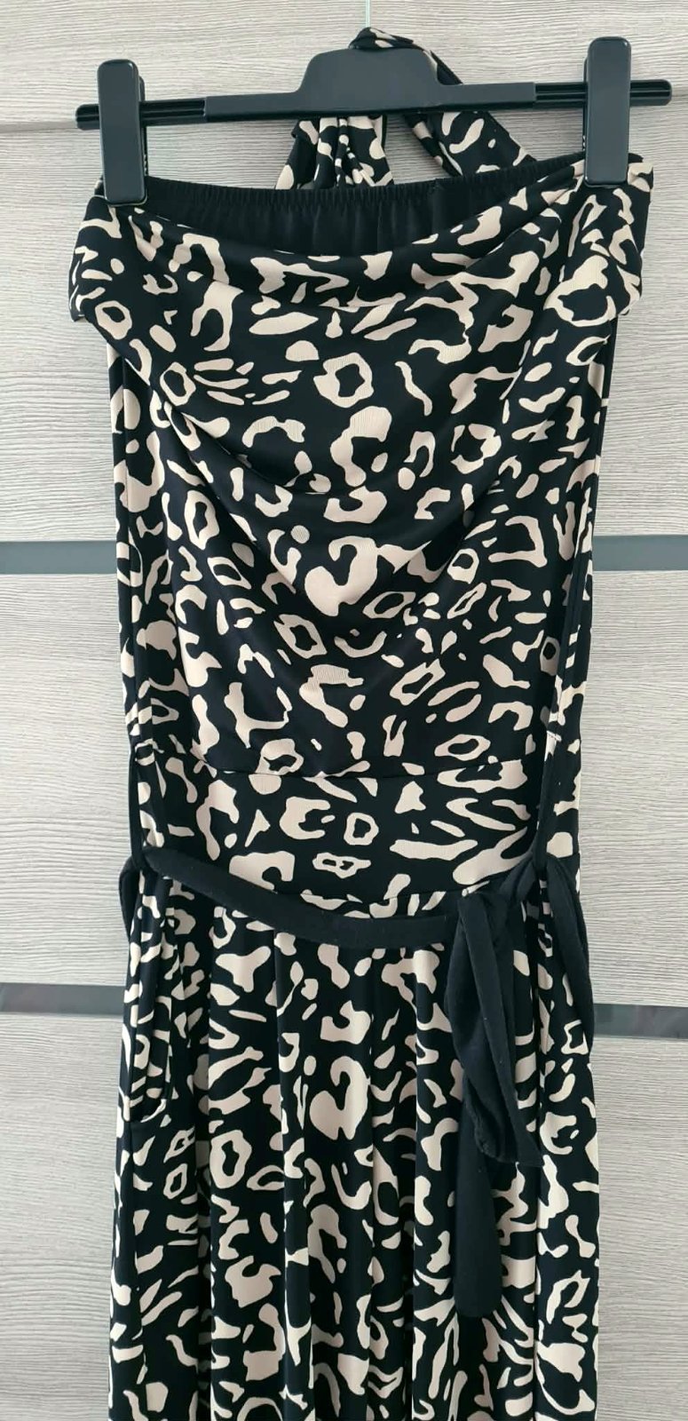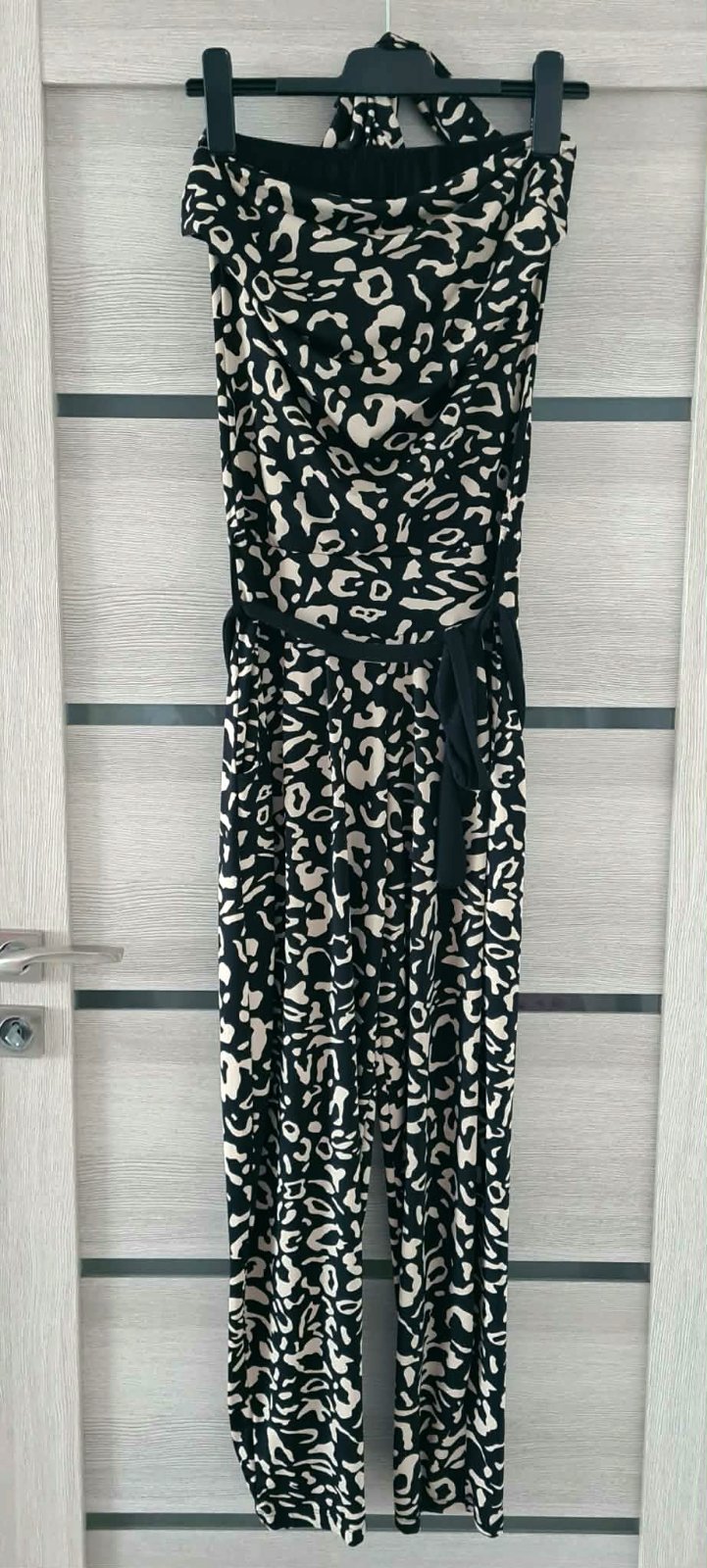 Elegantný overal bez ramienok, uväzuje sa okolo krku, výstrih do gumky. Ľahučký vzdušný materiál. V páse tiež gumka. Veľkosť sadne S/M. Oblečený raz na príležitosť.