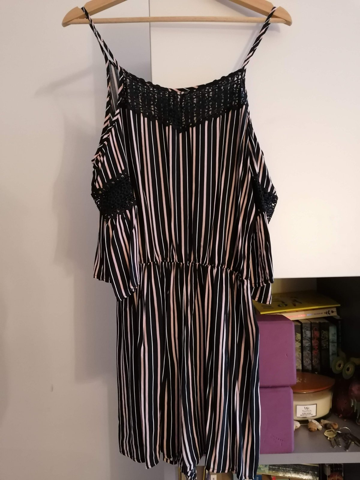 Elegantný letný overal Page One s kraťasmi, čipkovaný, rukávy stiahnuté na plecia, jemný padavý materiál, 100% viskóza, čierno-ružová farba, super stav, ako nový, pôvodná cena 30 eur. Veľkosť 36/S, dĺžka 90 cm, pod pazuchami 42 cm, pás na gumu 30-44 cm. Pozri ďalšie ponuky, viac kusov zľava 5-25%. Po zaplatení ceny a poštovného na účet posielam aj poštou.