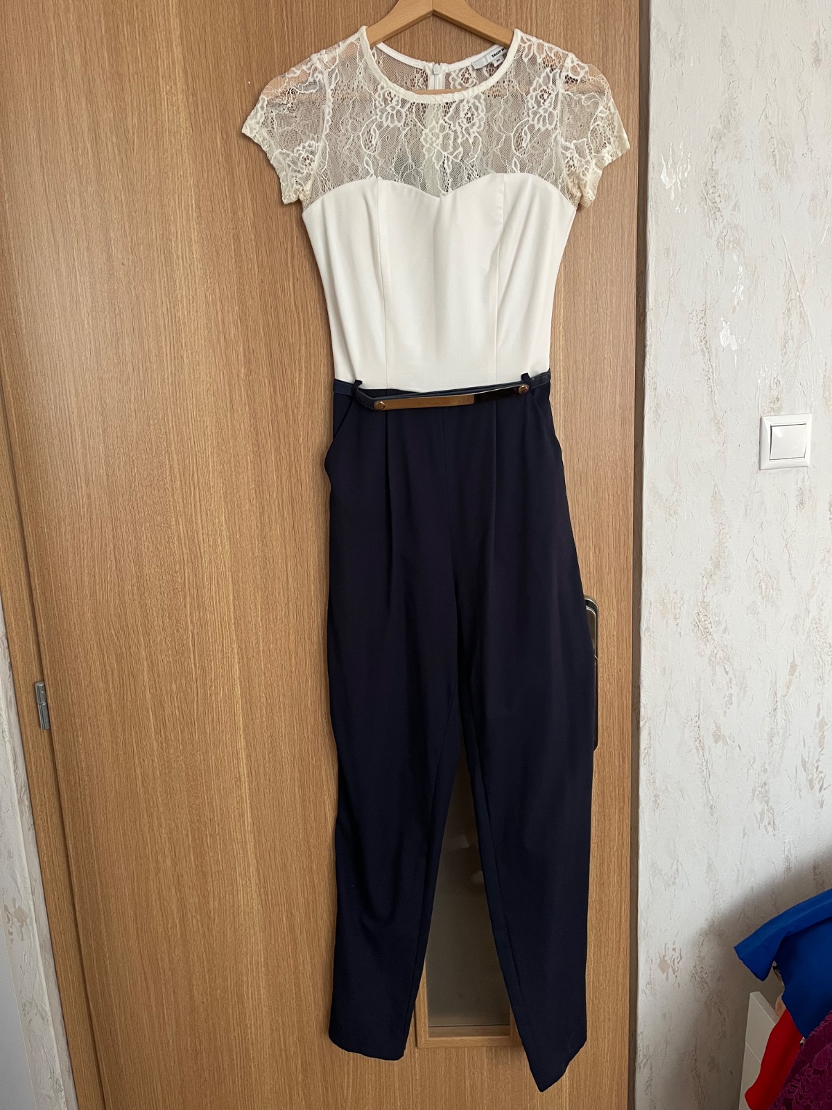 Krásny málo používaný overal na posuvné ramienka. Na prsiach volán. V páse guma + zaväzovanie mašľou vpredu alebo vzadu. Dlhé nohavice, naboku rázporku od oblasti pod zadkom. Zapínanie vzadu na chr...