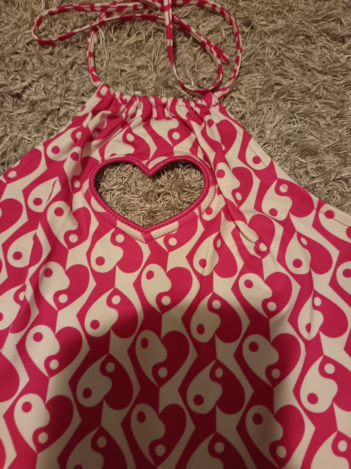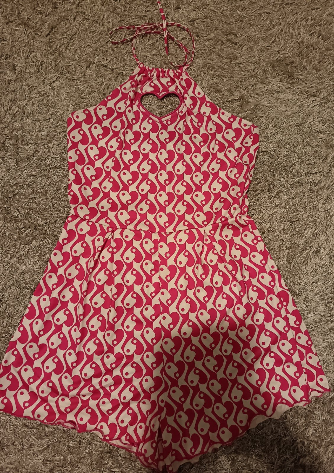 Dámsky overal univerzálna veľkosť, viazanie okolo krku a čierno ružová farba. Oblečený minimálne.