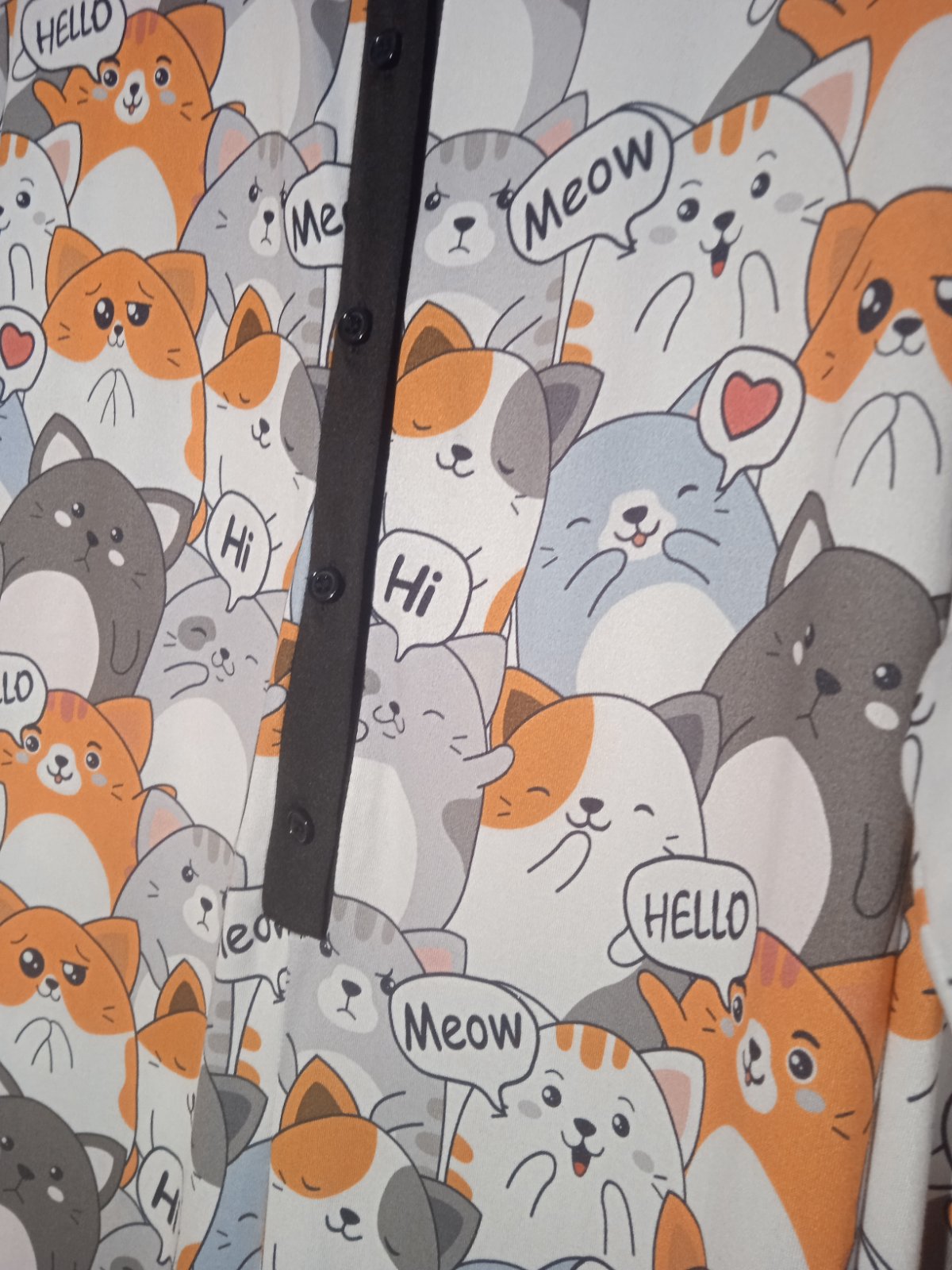 🐈😻🐈.......top stav, nosené asi 2x.....neviem si na to zvyknúť 😁. Mačičkový overal je ozaj nadrozmerný, cez brucho merané cca 77*2 ,mierne sa rozširuje do bokov. Dĺžku nemeriam, ja mám 162 a bol ok. Dole sú patenty,on sa prispôsobí