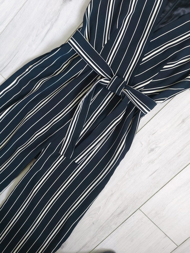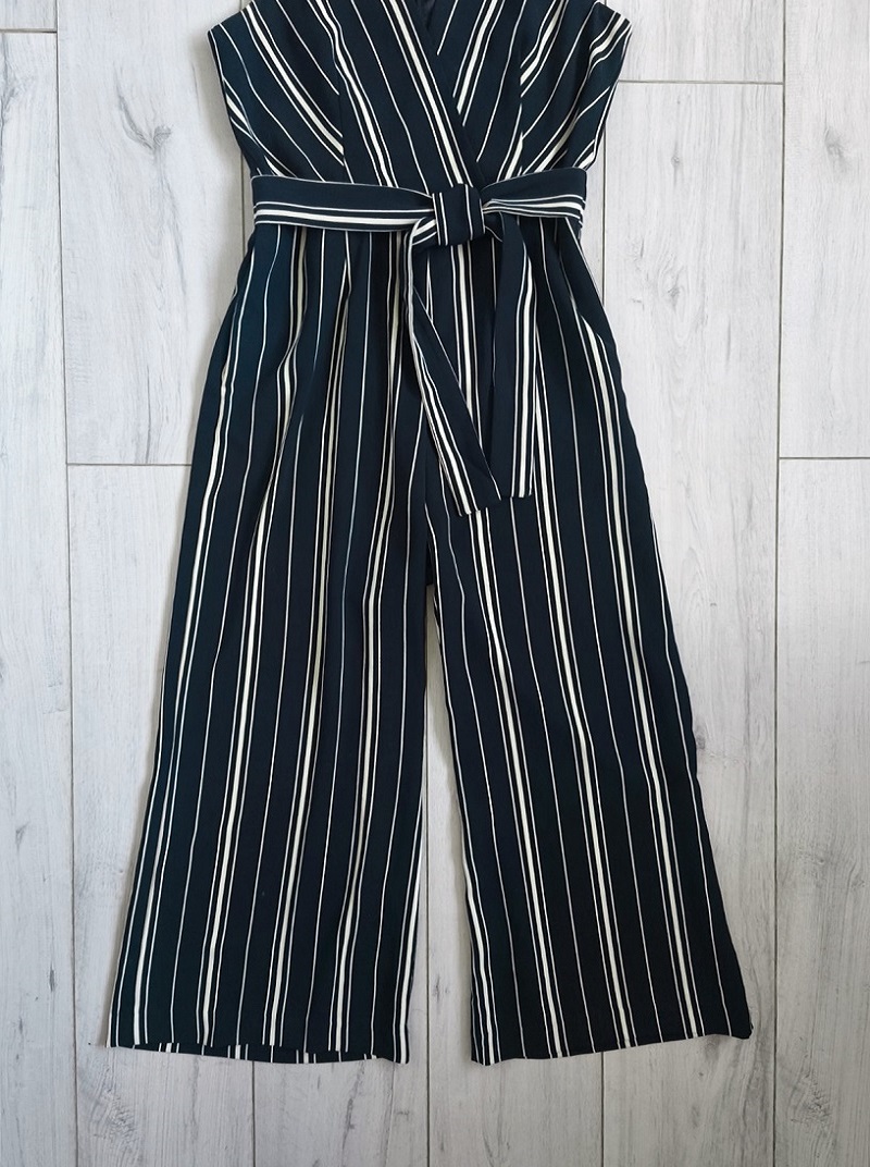 Ponúkam tento elegantný overal zn. H&M v dĺžke po kotniky, prúžkový bielo čierny, so širokými nohavicami, v perfektnom stave ako nový, veľkosť 40.