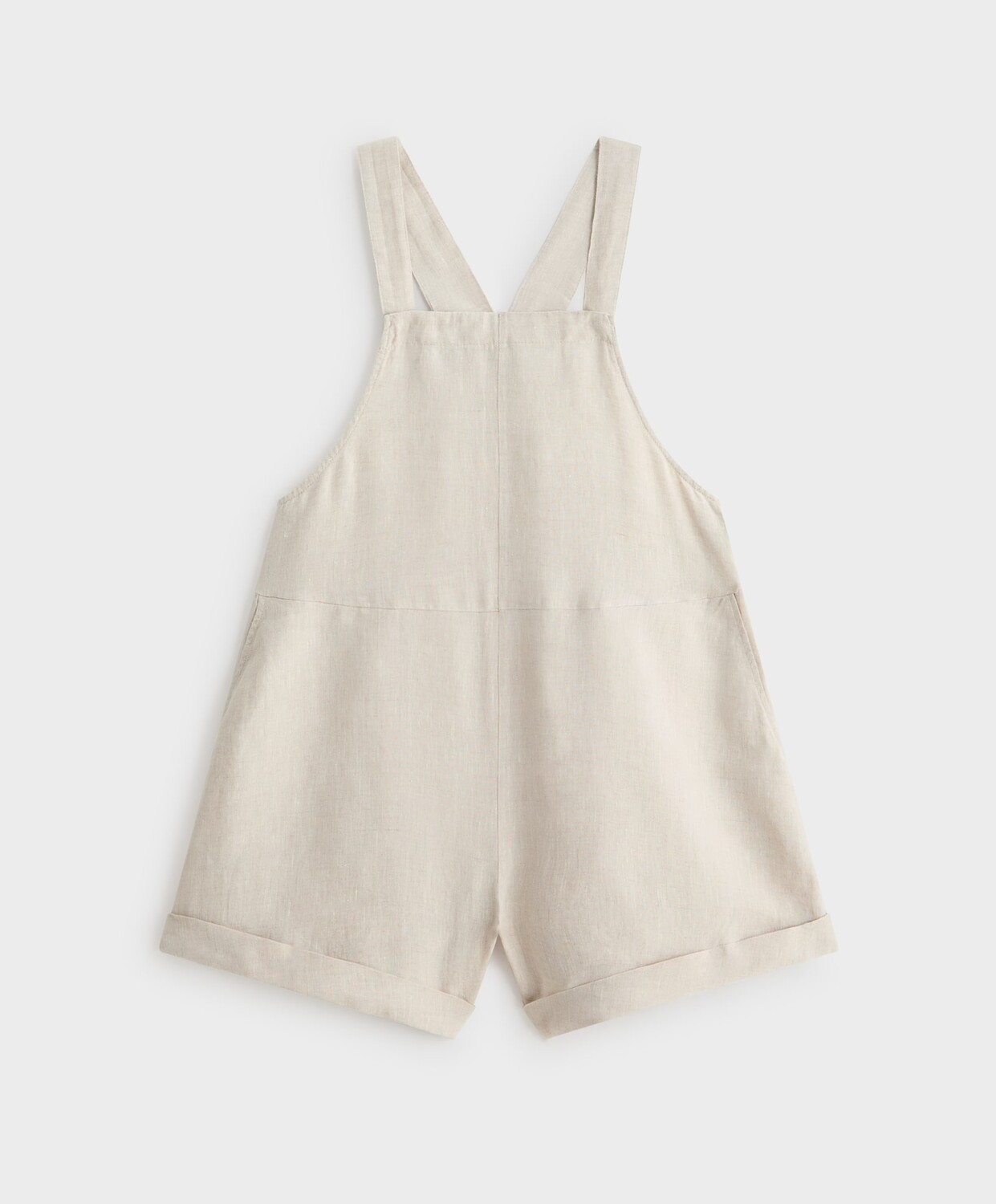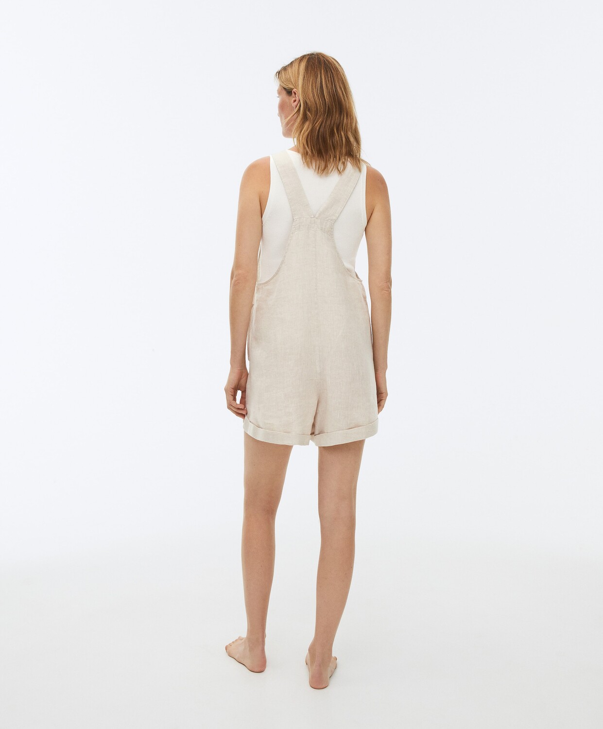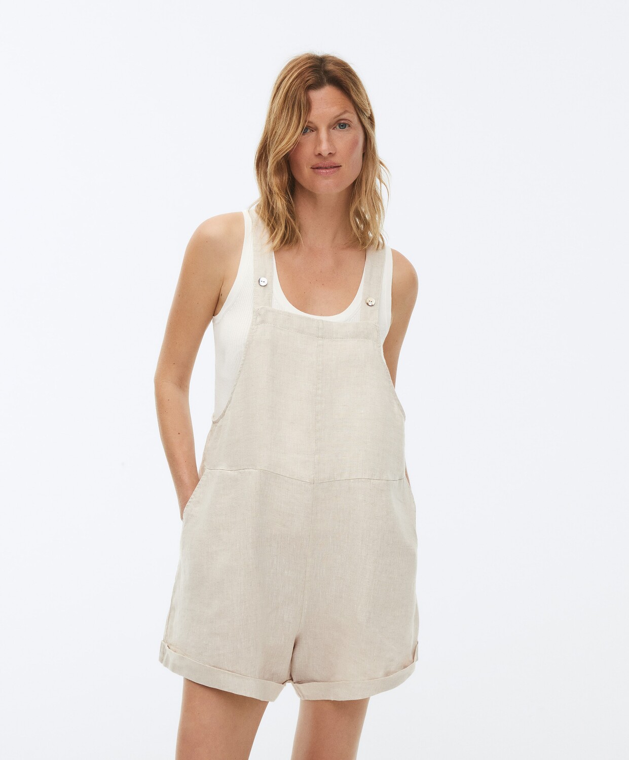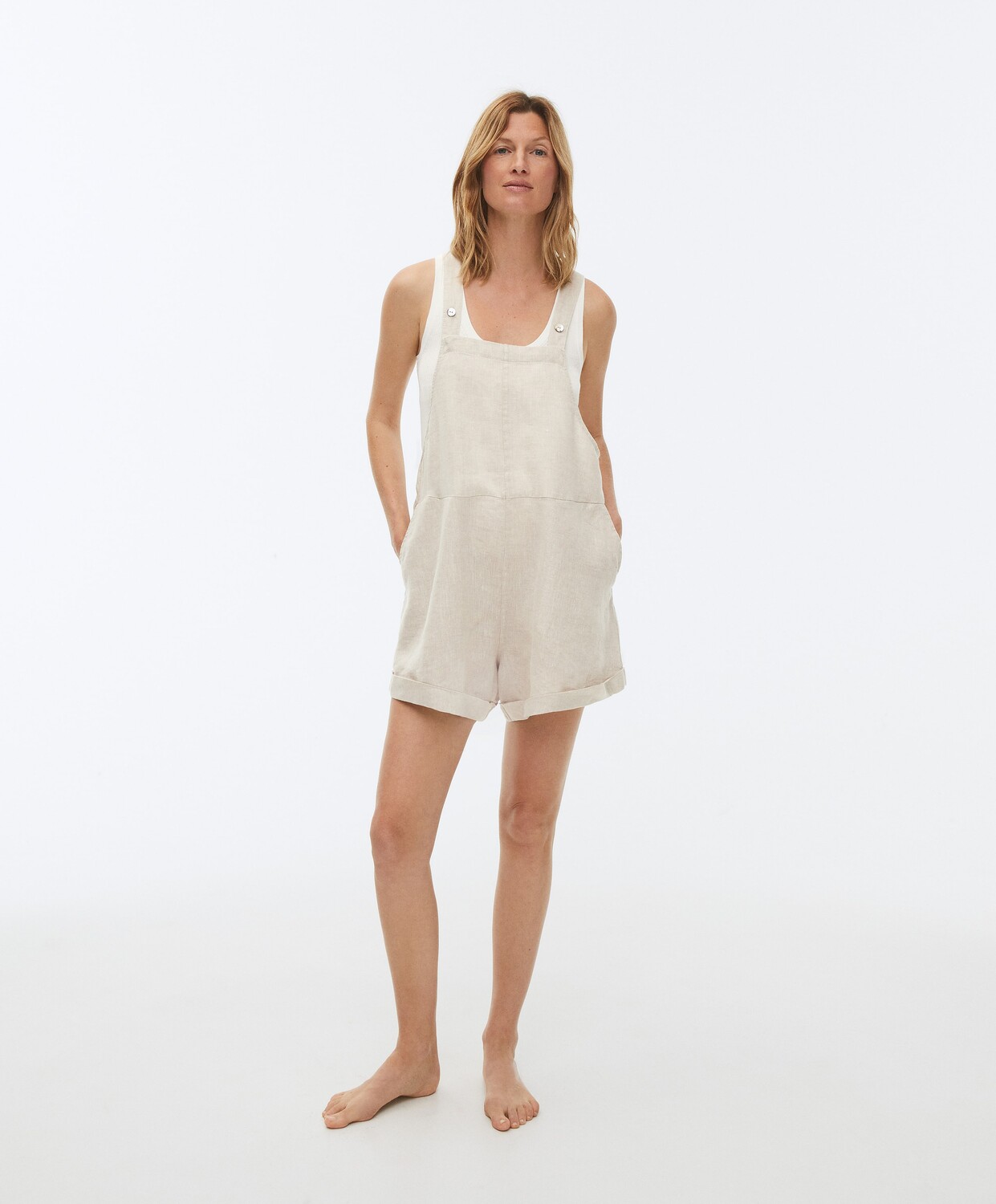 Overal je vyrobený zo 100 % ľanu. Má rovný výstrih. Šortky sú voľné. Overal má dve funkčné bočné vrecká. Zloženie: 100 % ľan. Overal sa zapína na traky, kde sú dva gombíky, takže traky majú prispôsobiteľnú dĺžku.