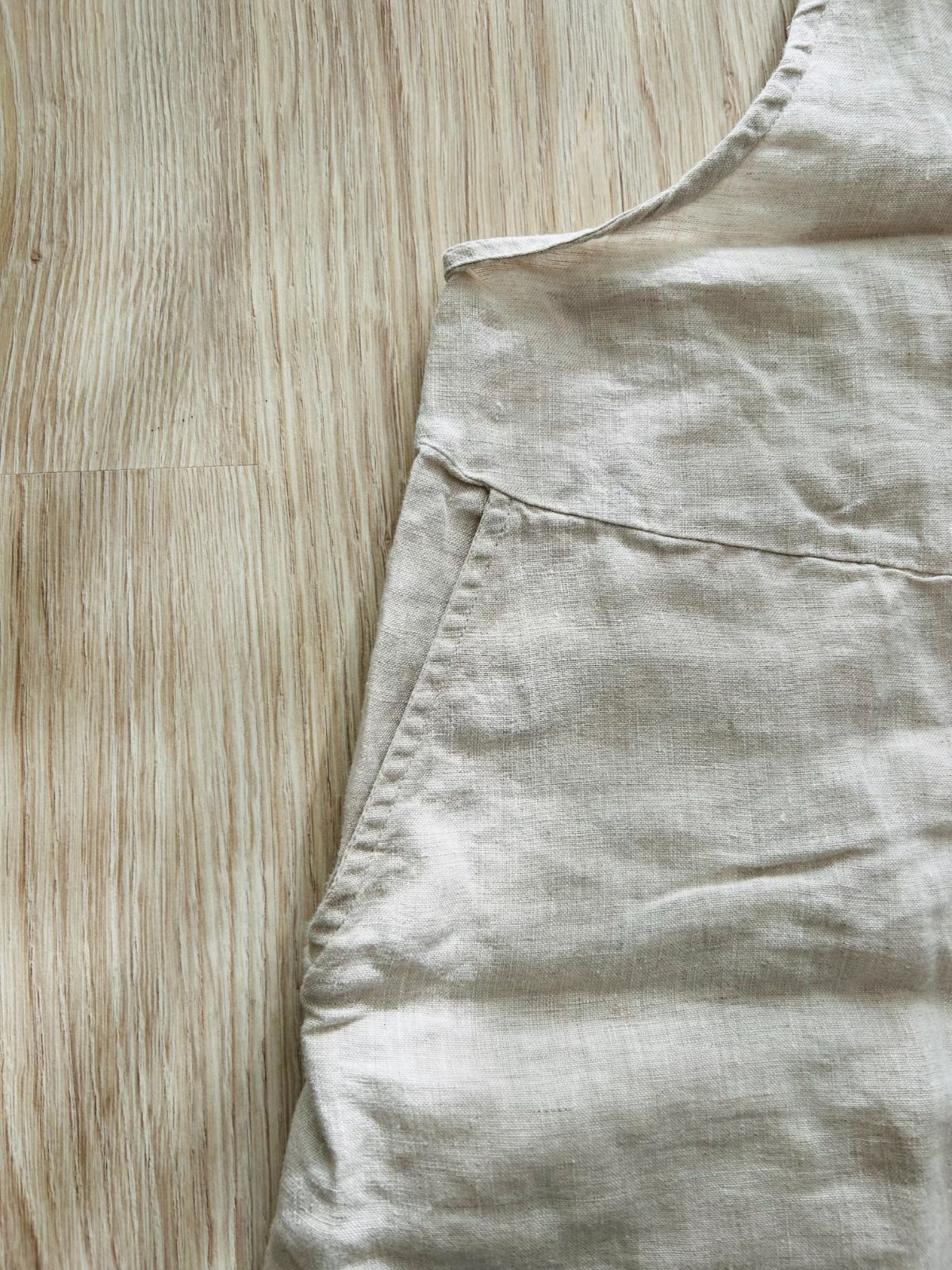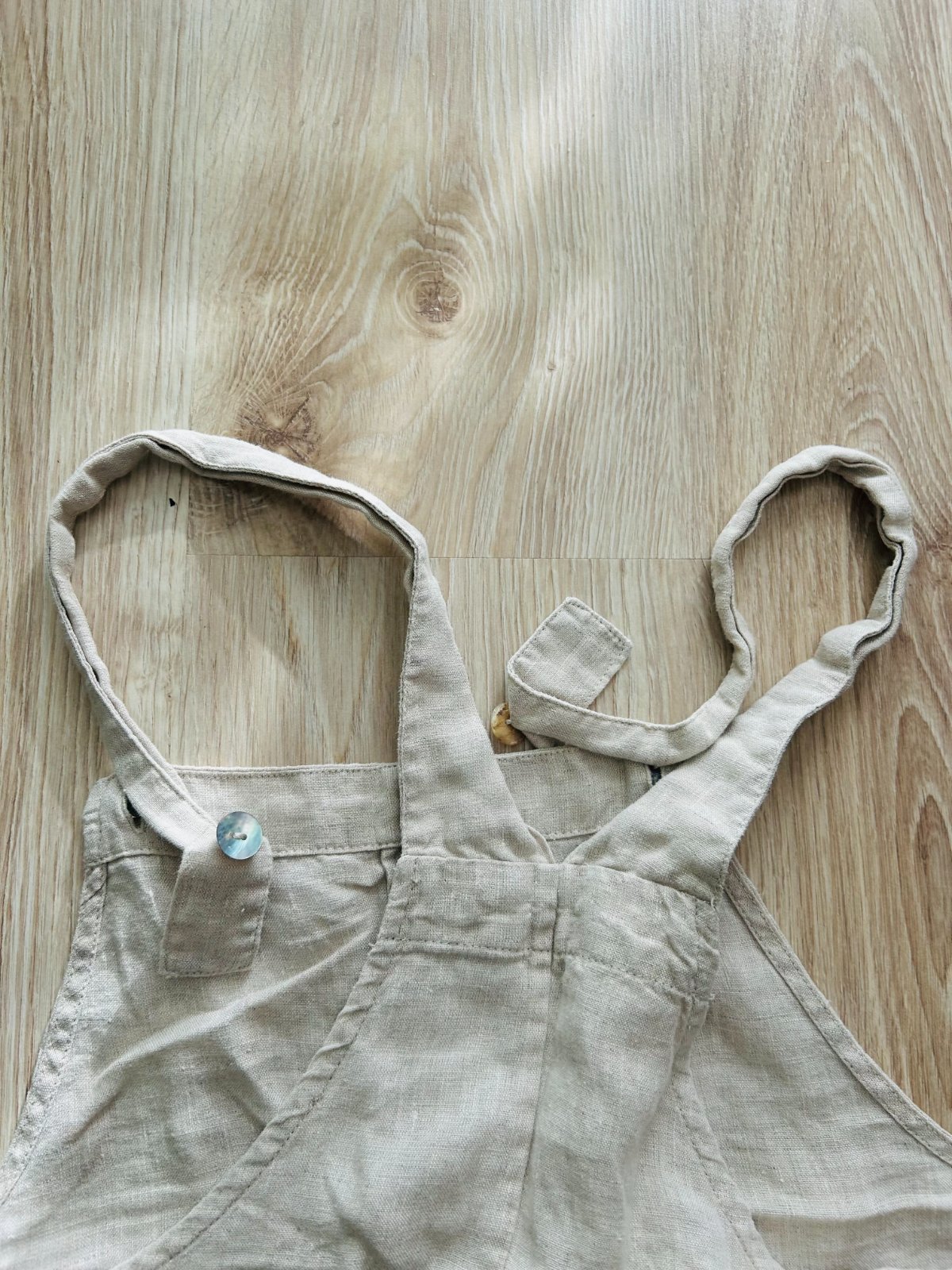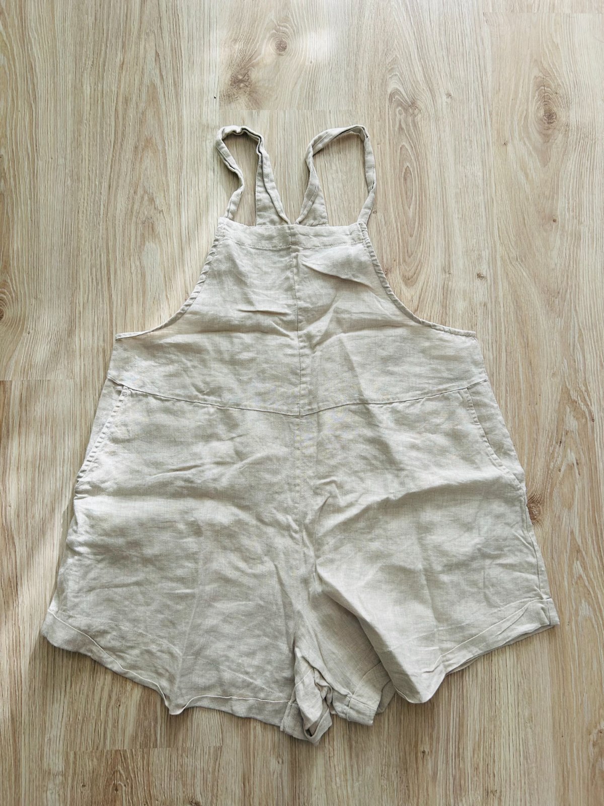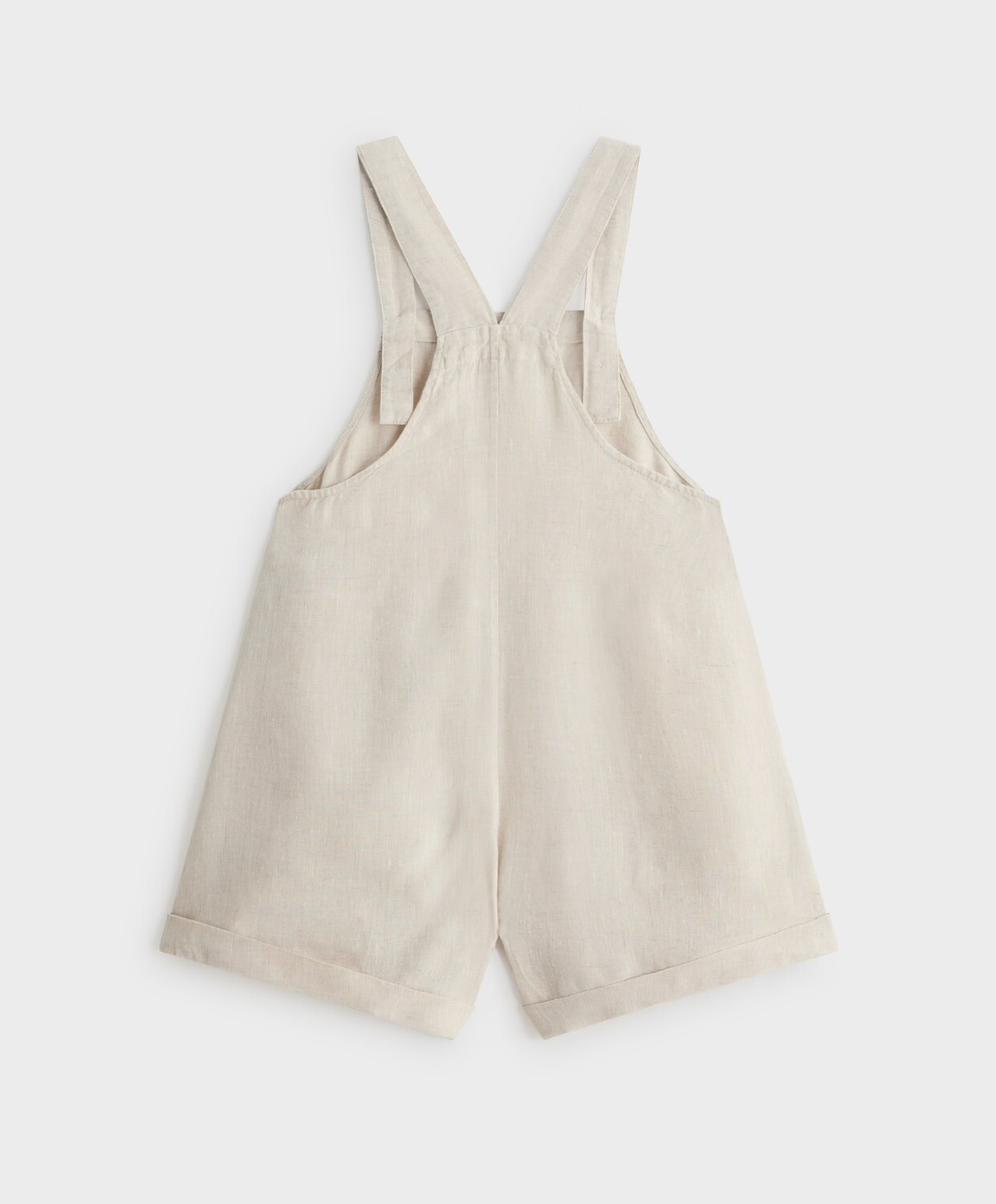 Overal je vyrobený zo 100 % ľanu. Má rovný výstrih. Šortky sú voľné. Overal má dve funkčné bočné vrecká. Zloženie: 100 % ľan. Overal sa zapína na traky, kde sú dva gombíky, takže traky majú prispôsobiteľnú dĺžku.