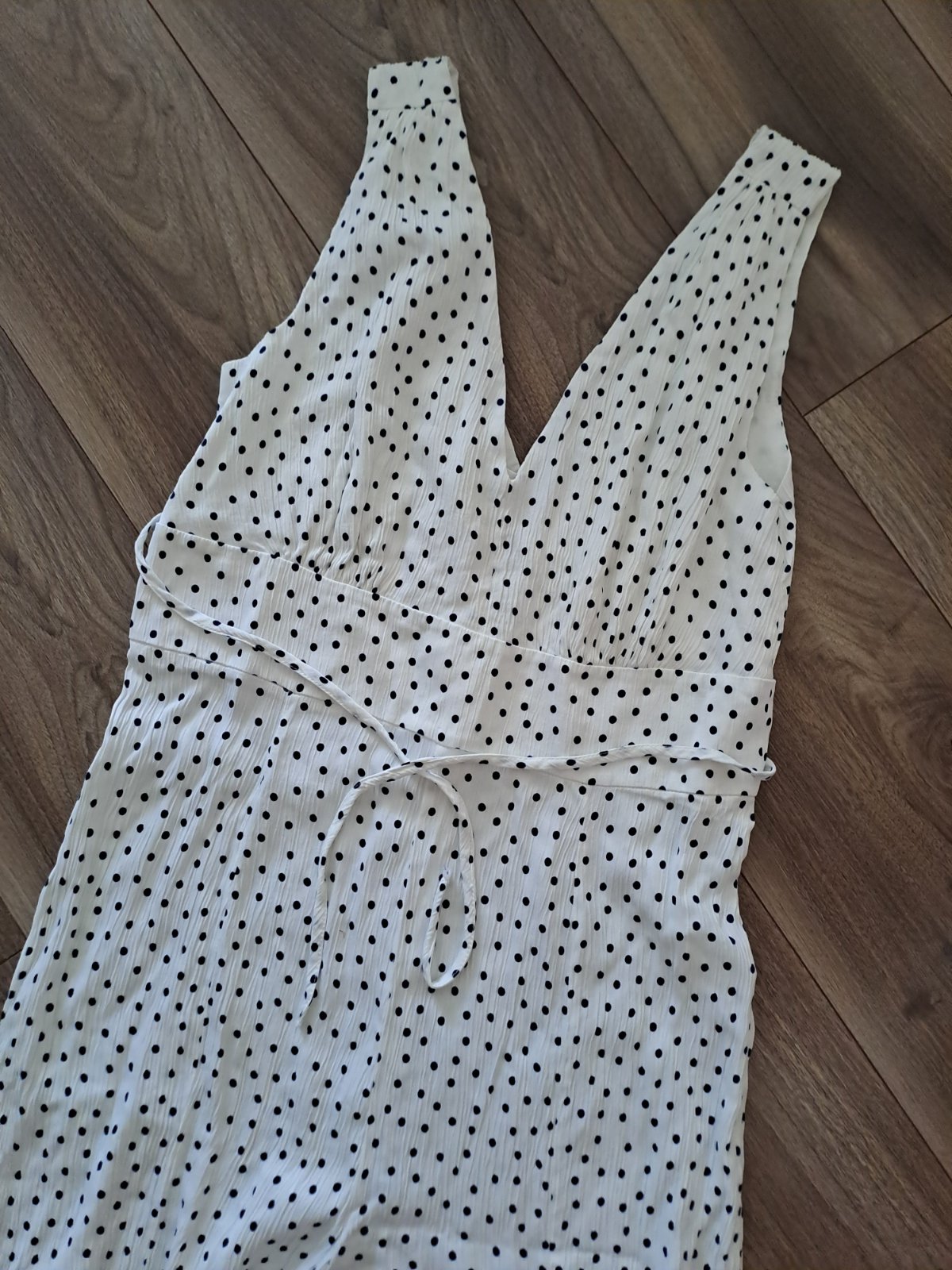 Kvalitny overal na leto,ja som ho mala oblečený na firemný vecierok,širšie nohavice oblečený cca 2x,bez poslodenia,vzadu je viazanie na krku a ukáže časť holeho chrbta presne kríze na postave vyzer...