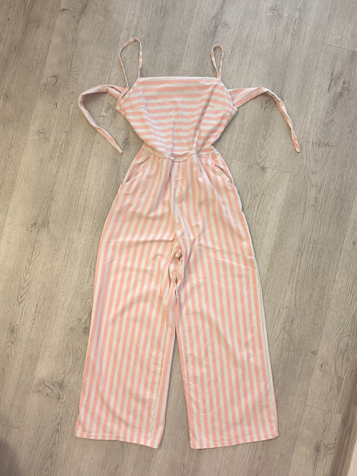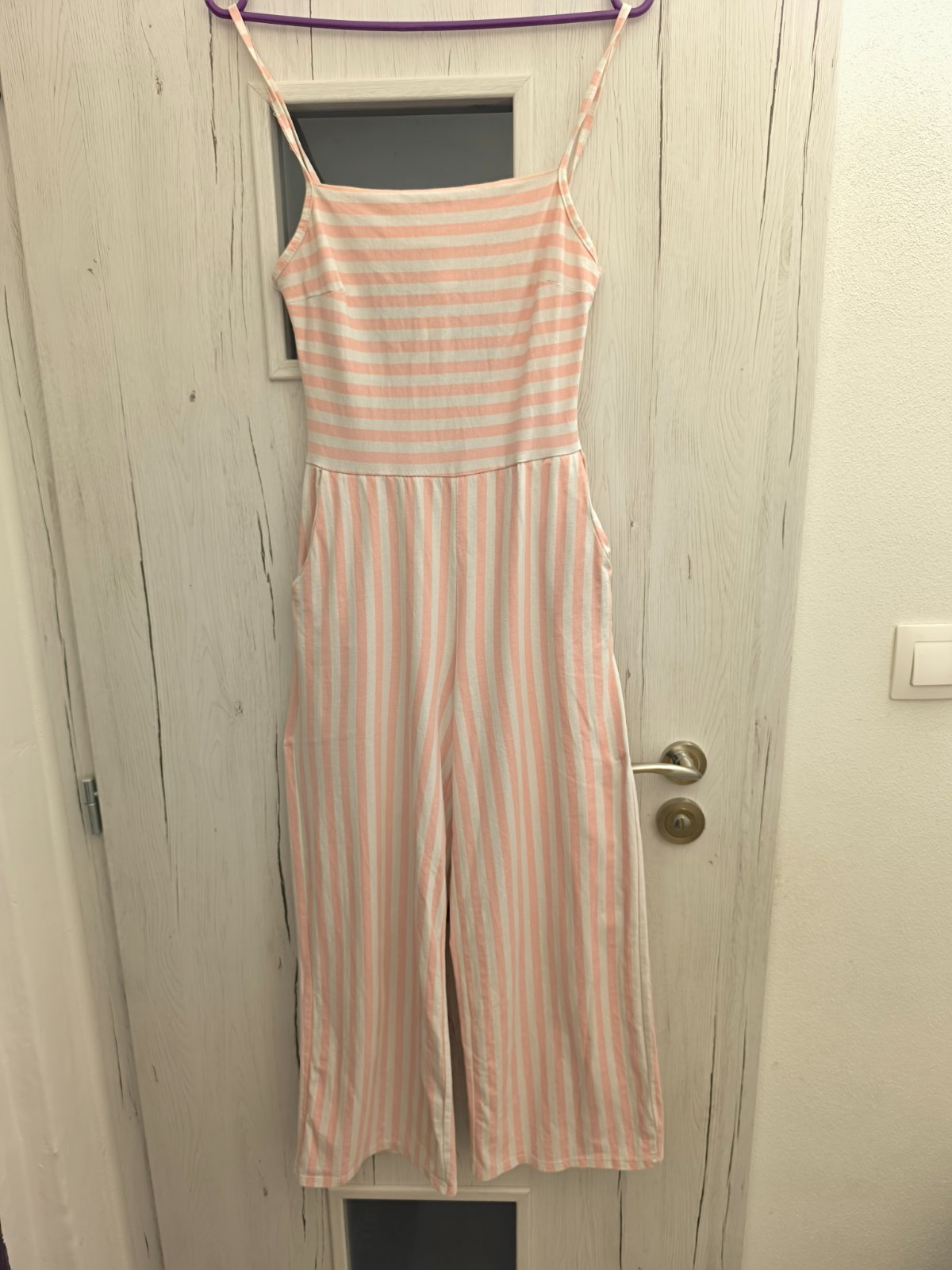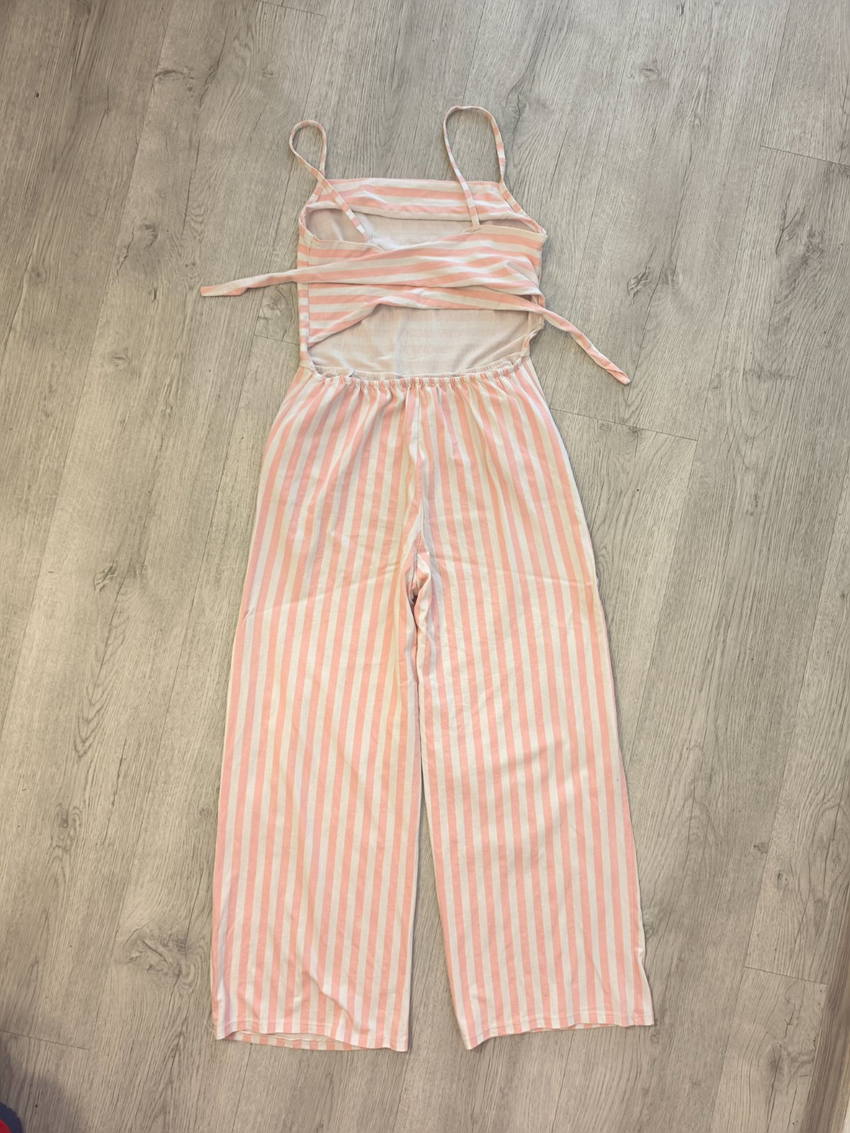 Teplákový ľahký overal na ramienka vzadu sa viaže cez chrbát mašľa. Holý chrbát. Dĺžka nohavíc nad členky.