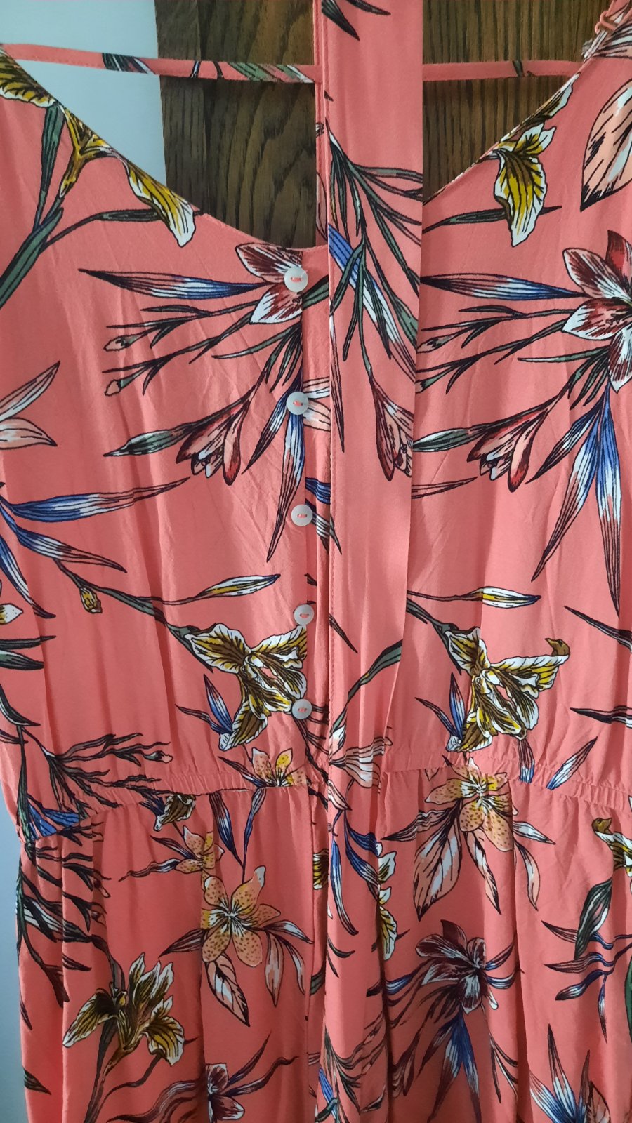 Kvalitný letný sýtoružovolososový overal s kvetinkovým vzorom zelenej a škoricovej farby, viazanie na ramienka, vzadu na krížoch krátky zips, vpredu všité vrecká, materiál 98% polyester, 2% elasta...