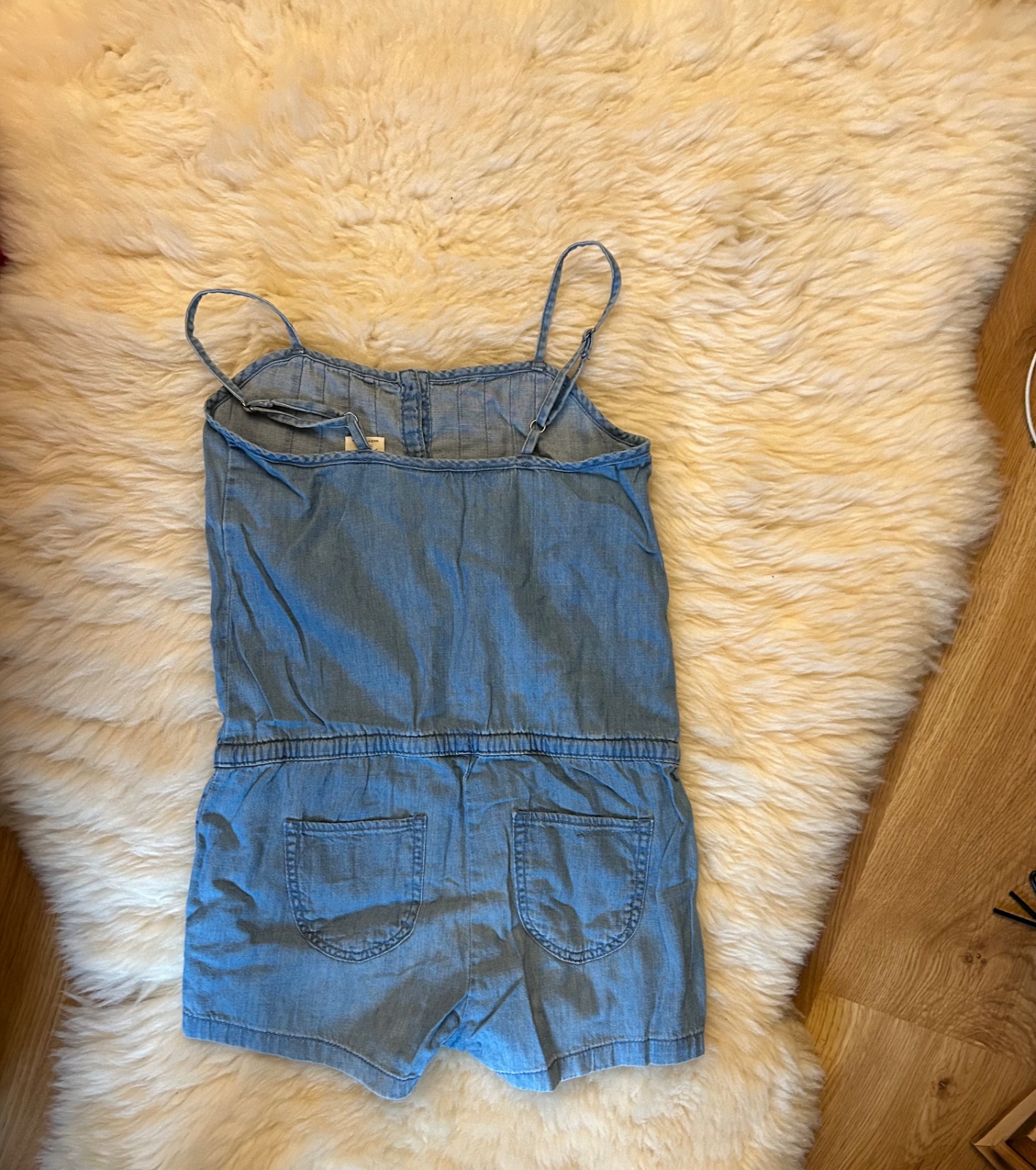 Krásny letný overálik s odopínateľnou aplikáciou ruže,,v páse stiahnté gumou,,na nohaviciach sú vrecká,,veľmi pekné..,romantické,,nový stav..