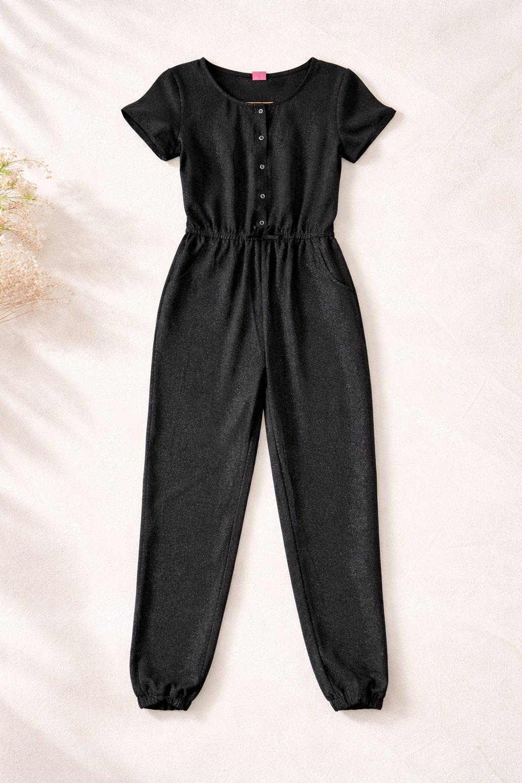 Štýlový čierny trblietavý overal, raz oblečený.