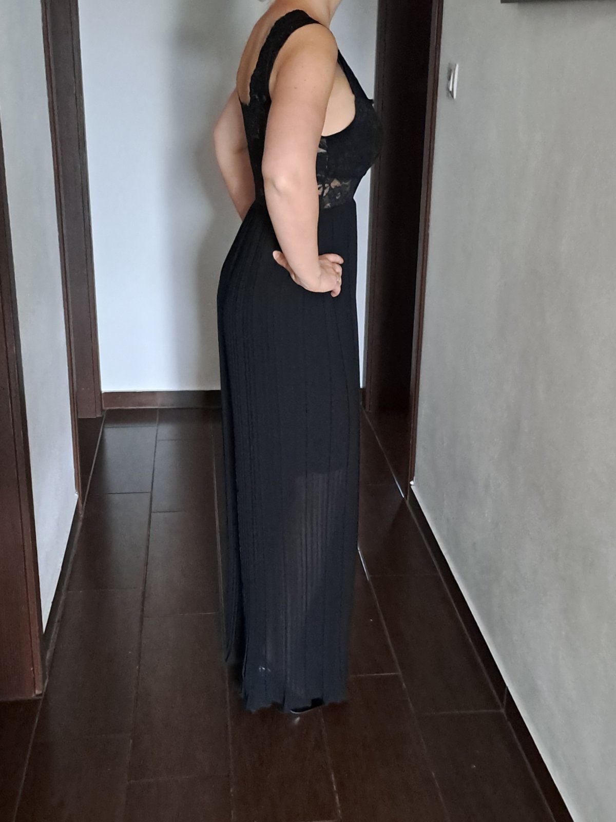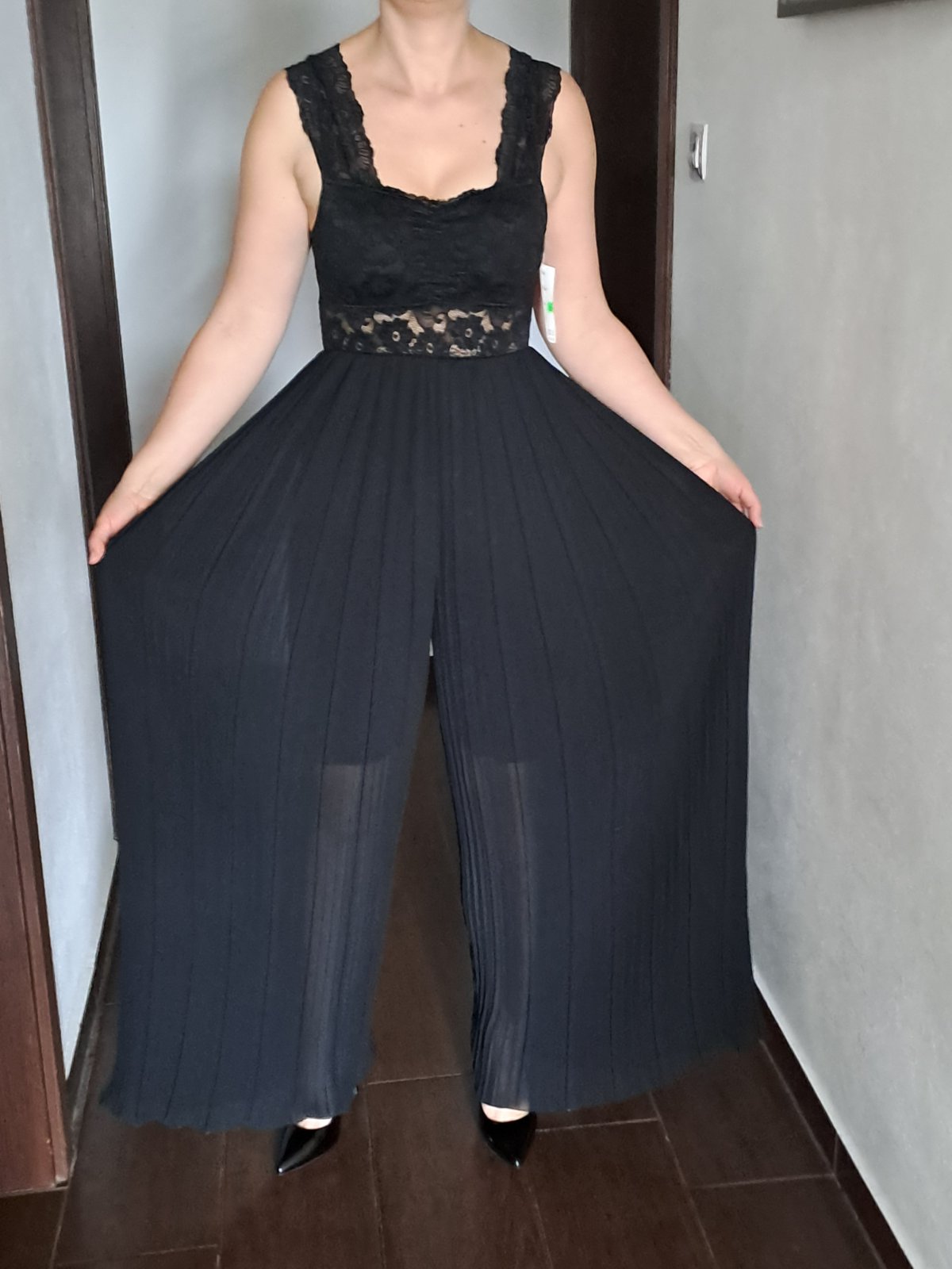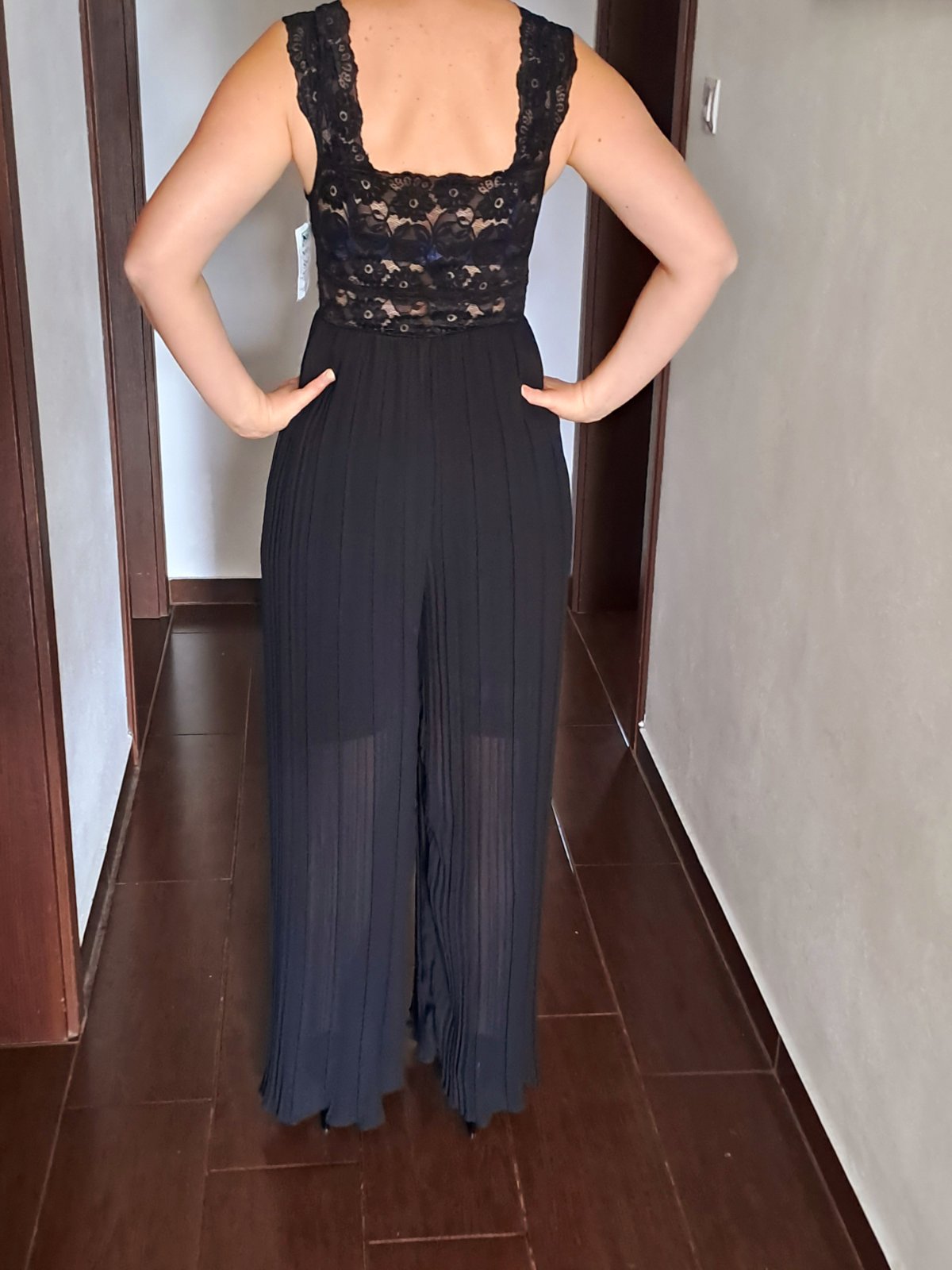 Oblečený 1x -100% stav. Veľmi pekný dámsky značkový elegantný overal, oblečený 1x na svadbe. PC 79€ Dala som si ho skrátiť u profesionálnej krajčírky. Farba: čierna, vrchná časť vpredu aj vzadu je...