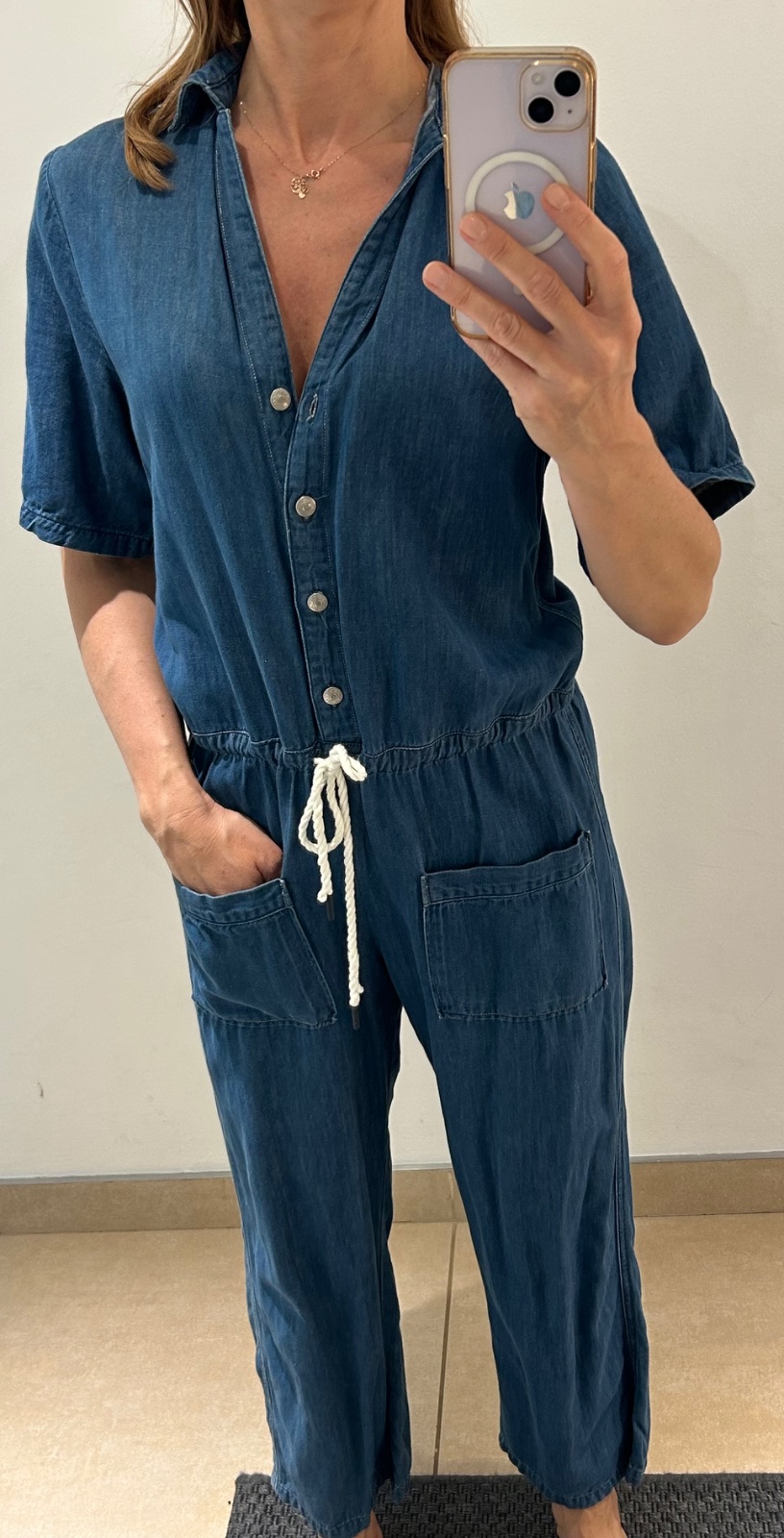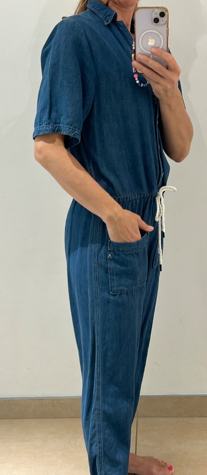Paradny nadcasovy a pohodlny overal, po kotniky, pekne sa moze este ohrnut spodna cast, v pase na zaviazanie, zapnutie na gombiky, je to volnejsi styl, s teniskami, slapkami, s tielkom aj bez, krasny kusok, bez poskodenia a vad