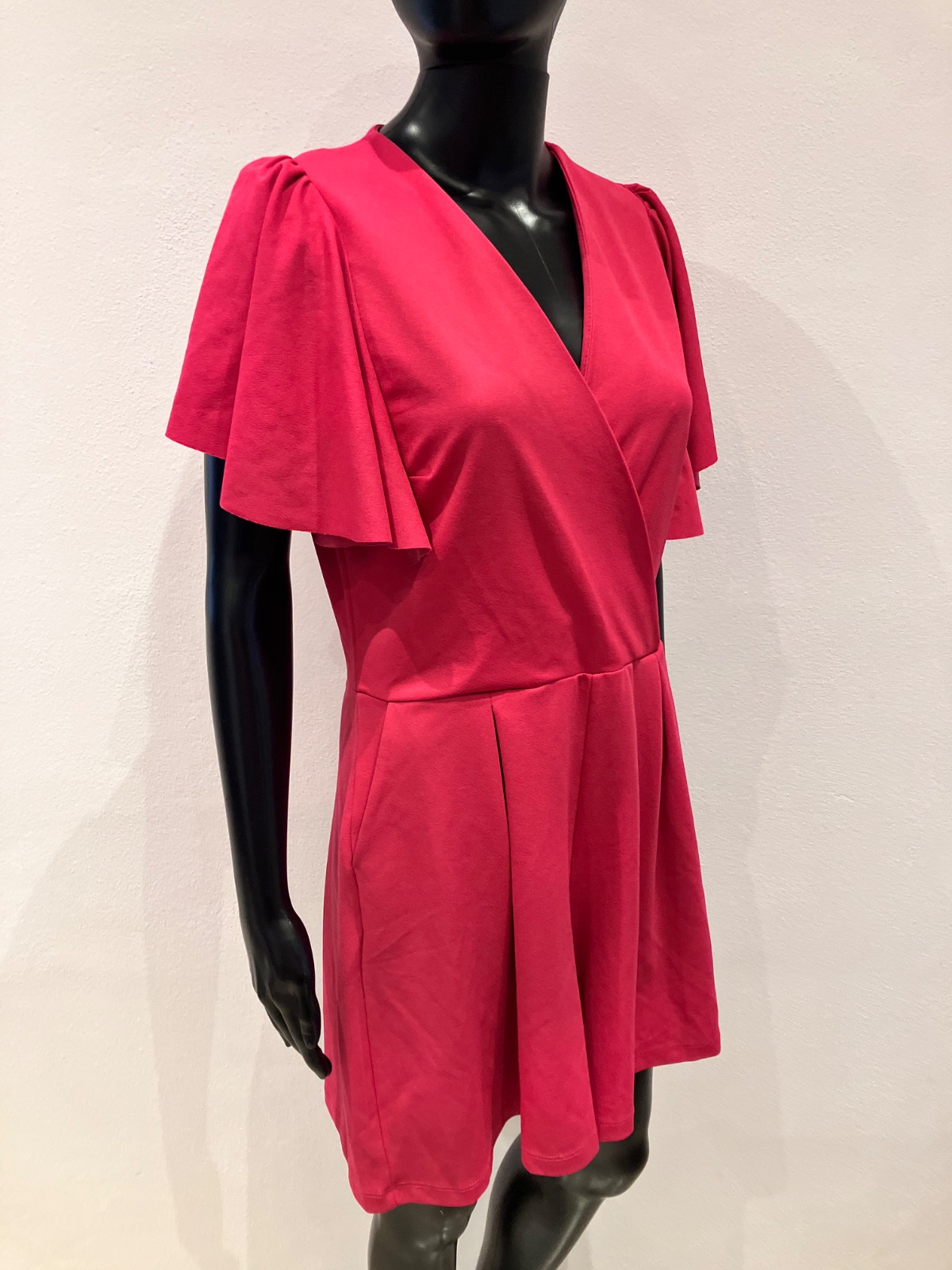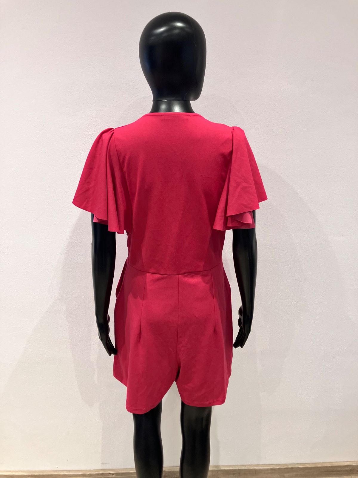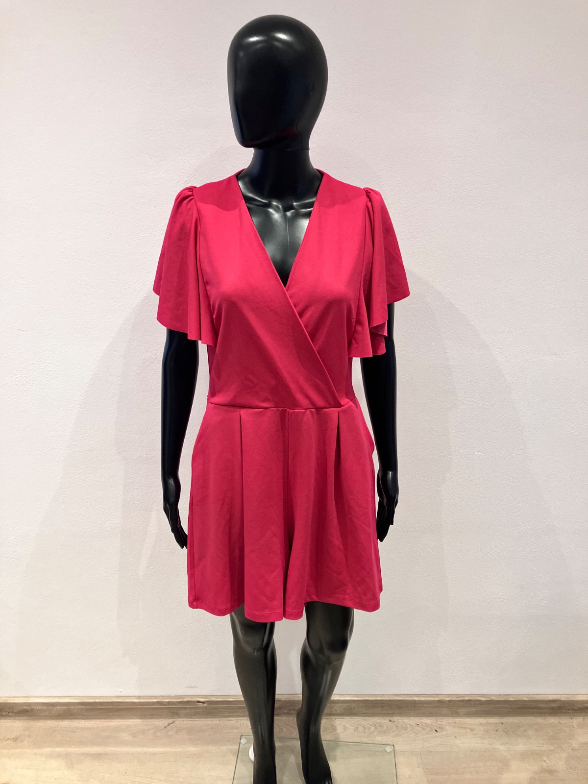 Dámsky elegantný krátky overal s volánovými krátkymi rukávmi, zapínanie na boku na zips, elastický, dve bočné vrecká, materiál 94%polyester 6% elastan.