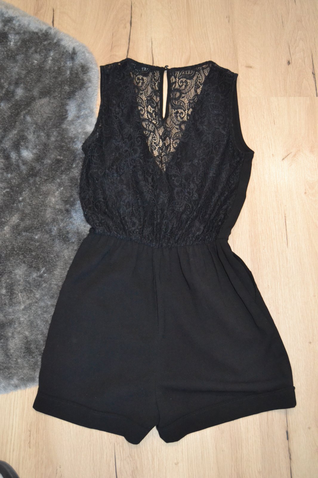 Elegantný krátky overal s čipkou na chrbte do spoločnosti aj na bežný deň, zdobený na chrbte čipkou, zapínanie na gombík. Je elastický v páse má gumku, takže dokonale sadne na postavu, bol oblečený iba 3x na príležitosti, Značka Tally Weijl, veľkosť XS, rozmery: dĺžka 75cm, pás 35-39x2cm.