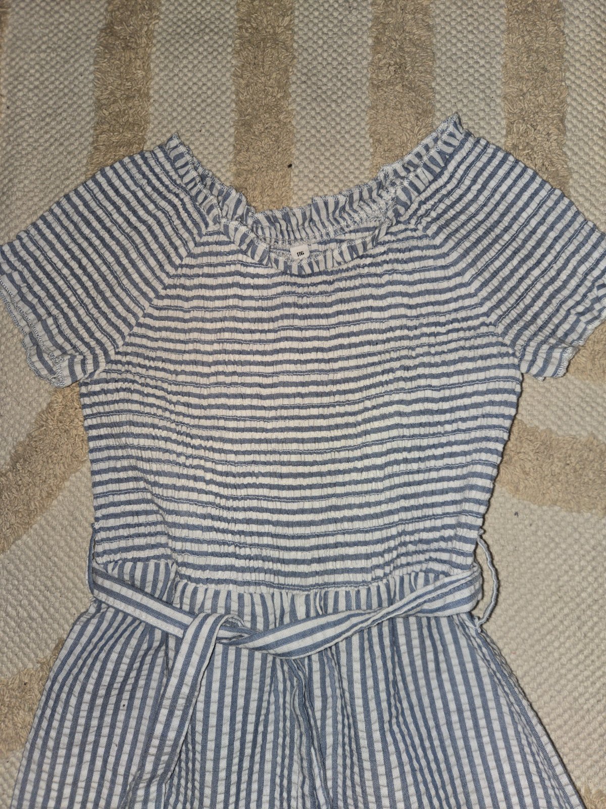 Krásny ľahký overal, oblečený 2x. je to tenucka riflovina. Rozmery: celková dlzka; 1m, sirka:33cm, od pása dole: 69, od rozkroku: 45cm. Velkost uvedená 5-6r