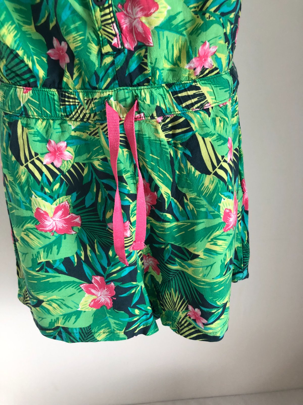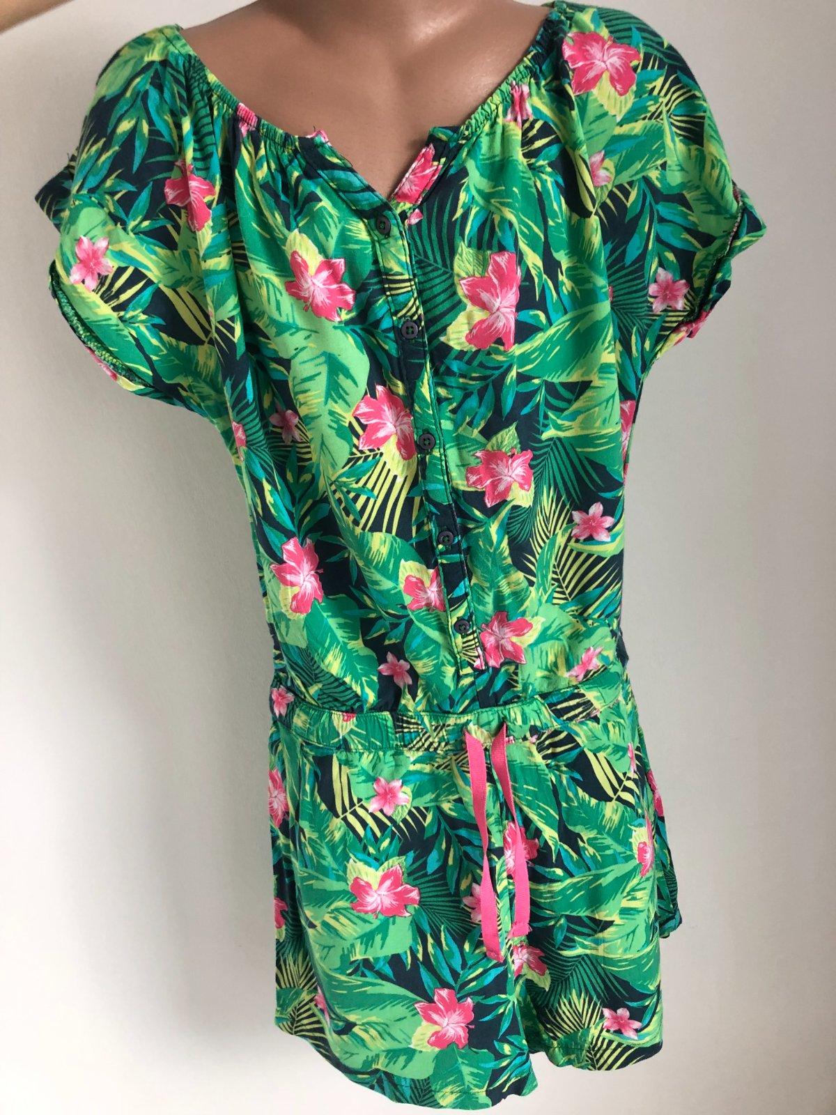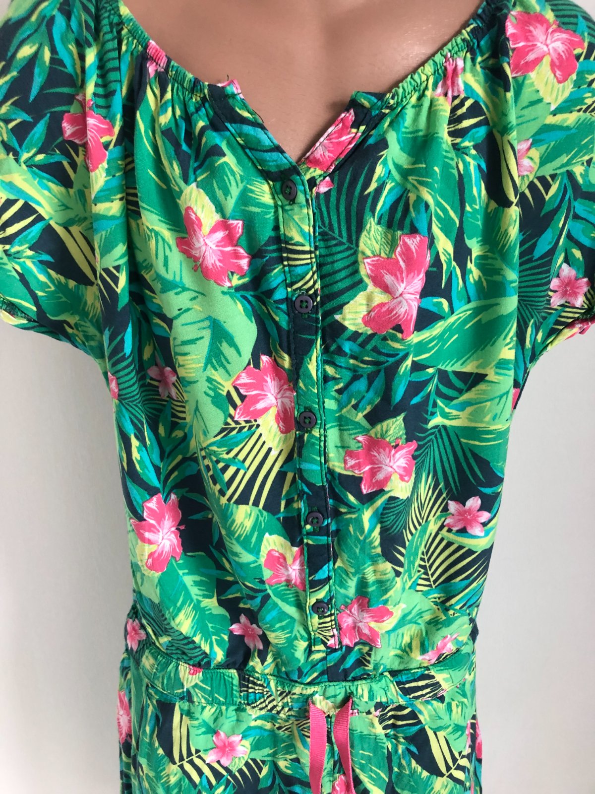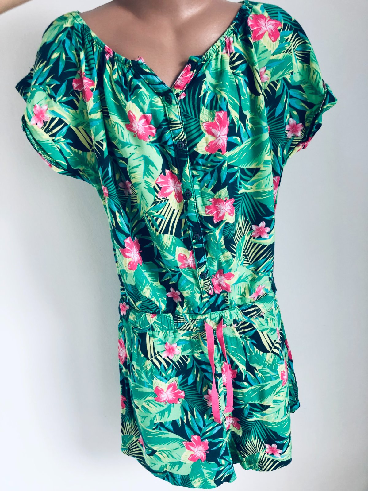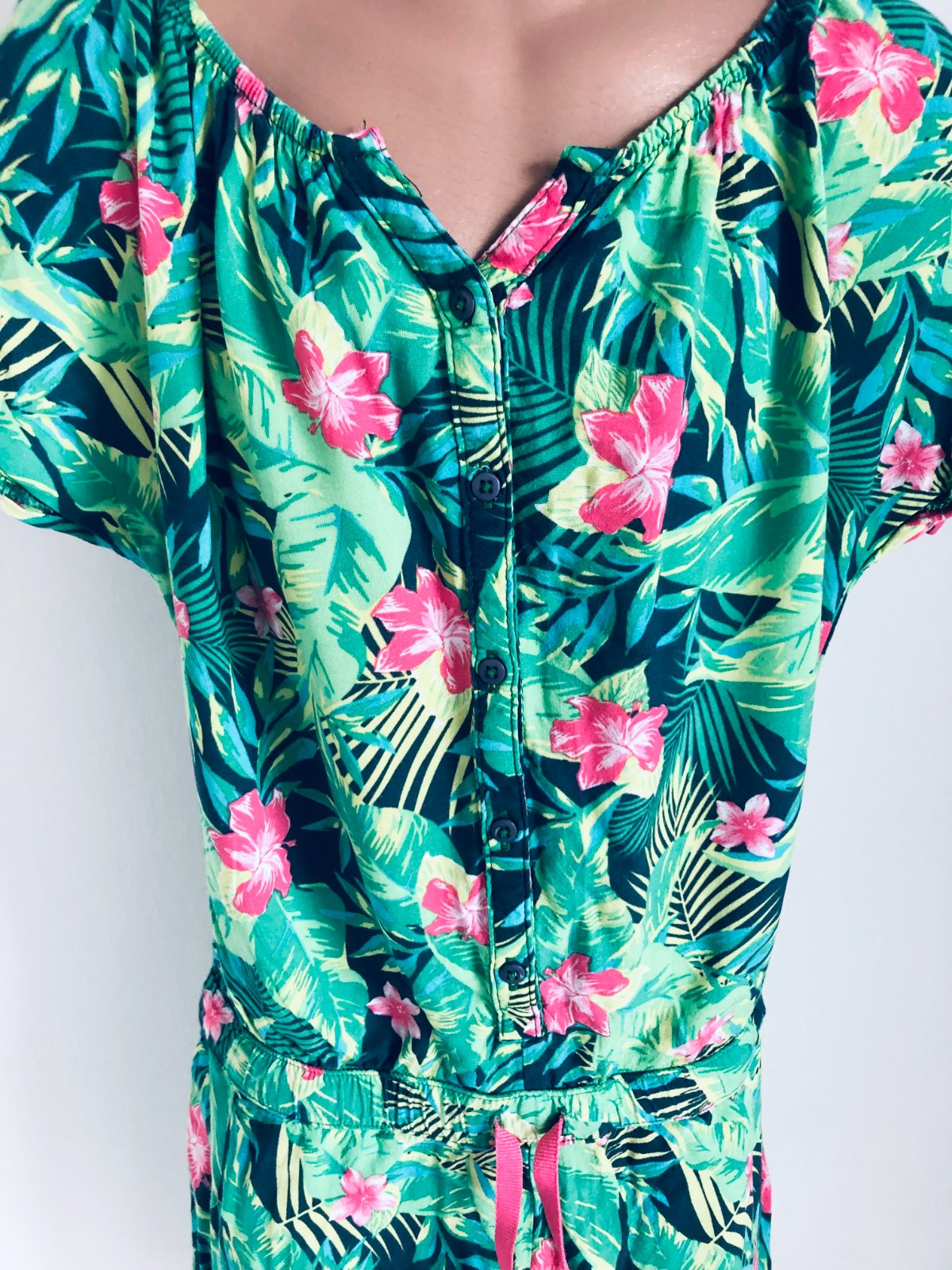Predám veselý a ľahučký letný overal (romper) s krásnym tropickým vzorom. Perfektný na horúce dni, dovolenku pri mori alebo letné festivaly.