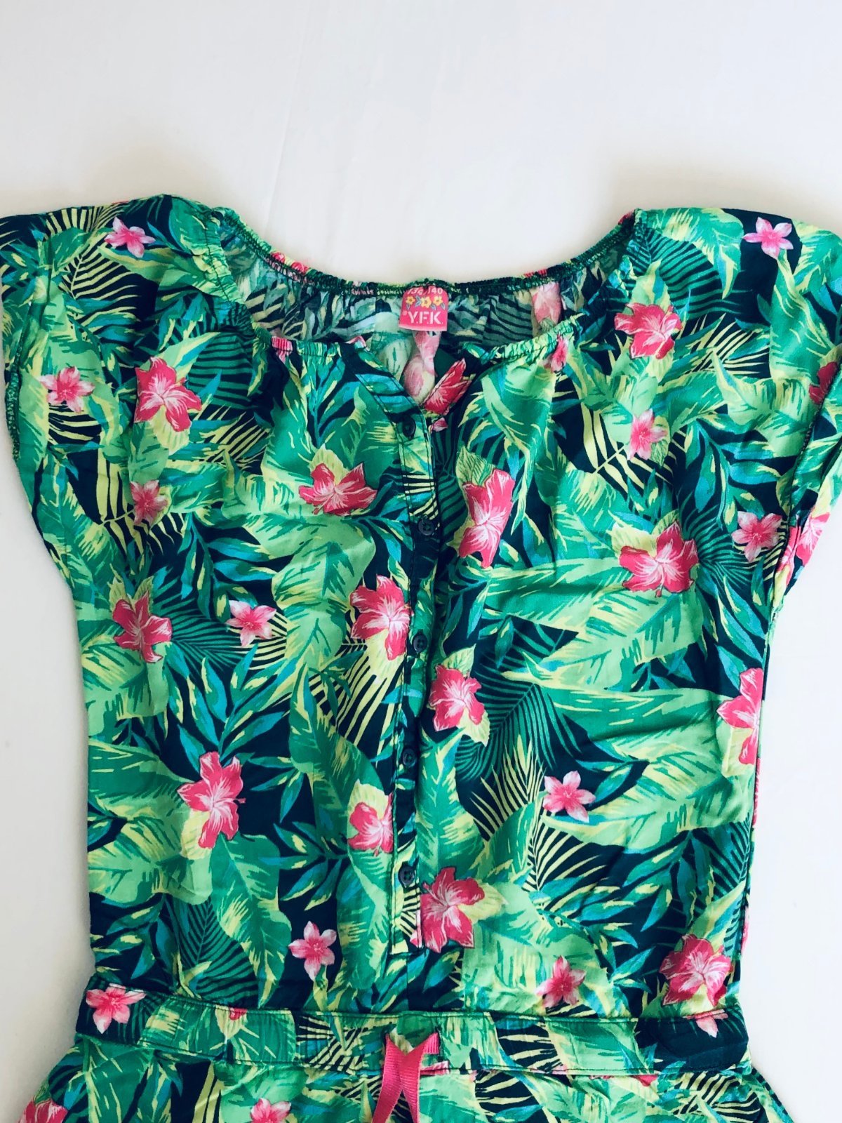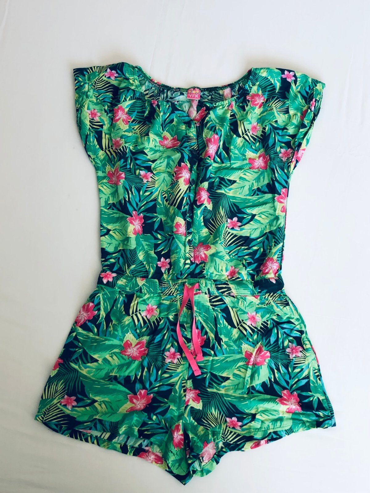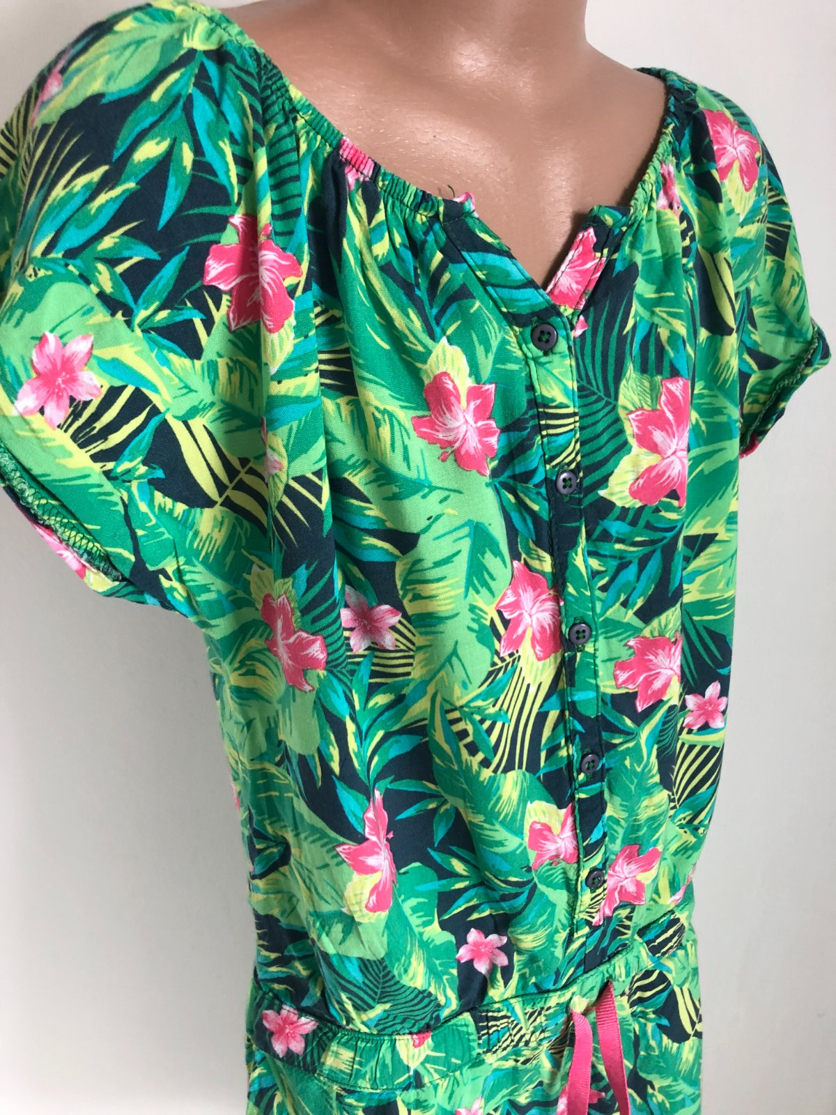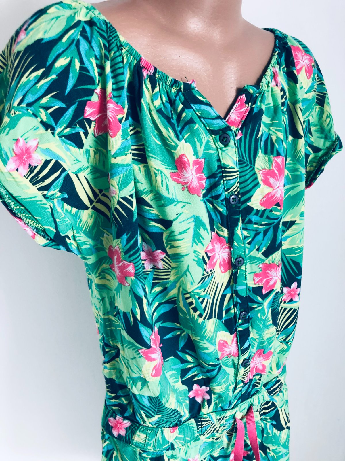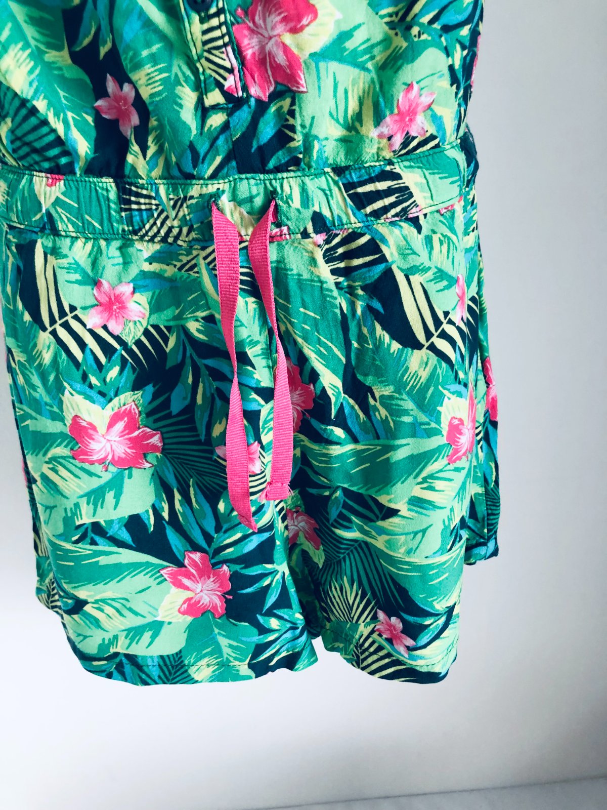 Predám veselý a ľahučký letný overal (romper) s krásnym tropickým vzorom. Perfektný na horúce dni, dovolenku pri mori alebo letné festivaly.