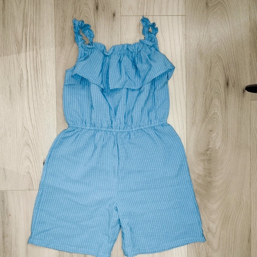 Krásny letný overálik s odopínateľnou aplikáciou ruže,,v páse stiahnté gumou,,na nohaviciach sú vrecká,,veľmi pekné..,romantické,,nový stav..